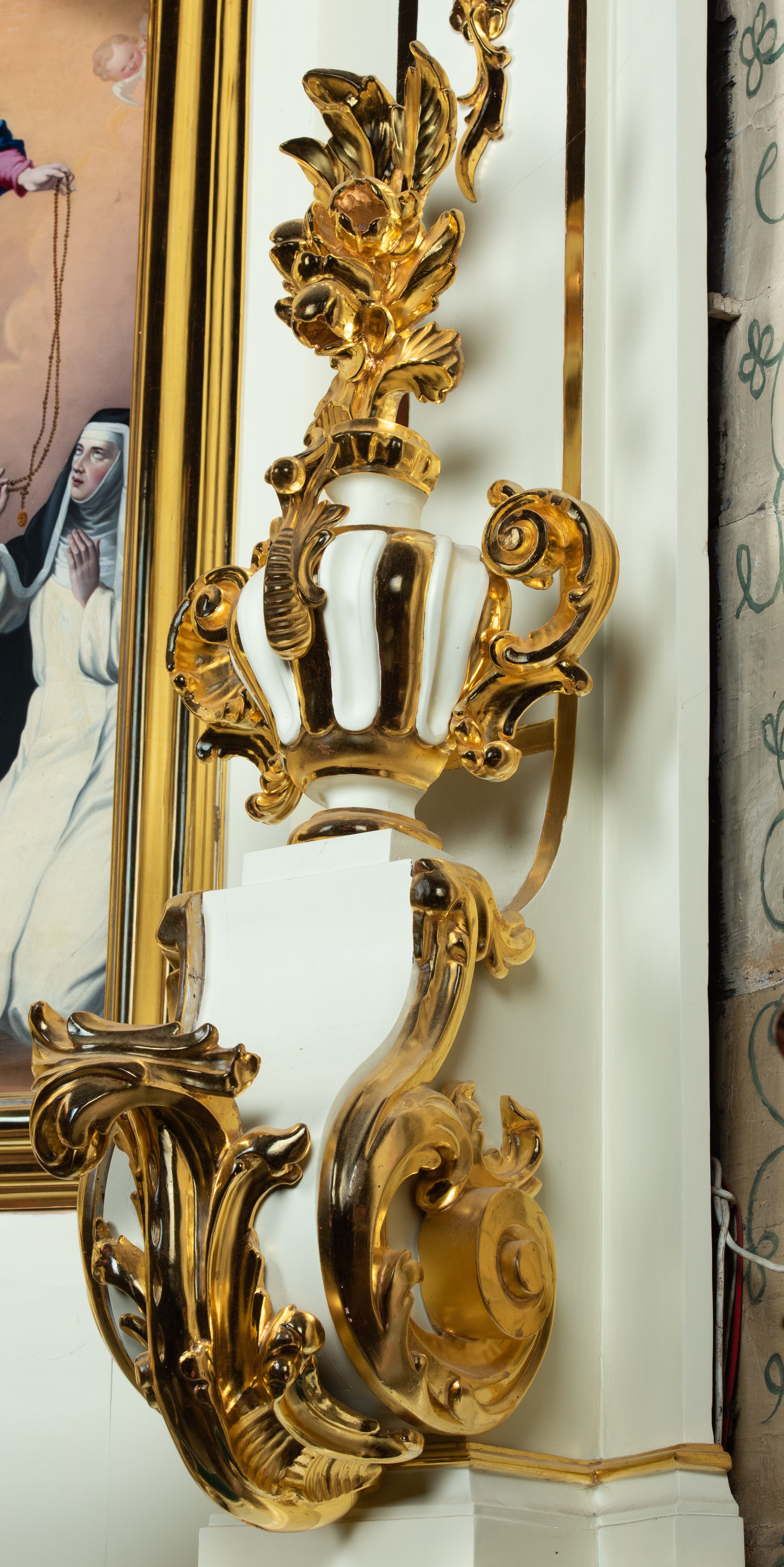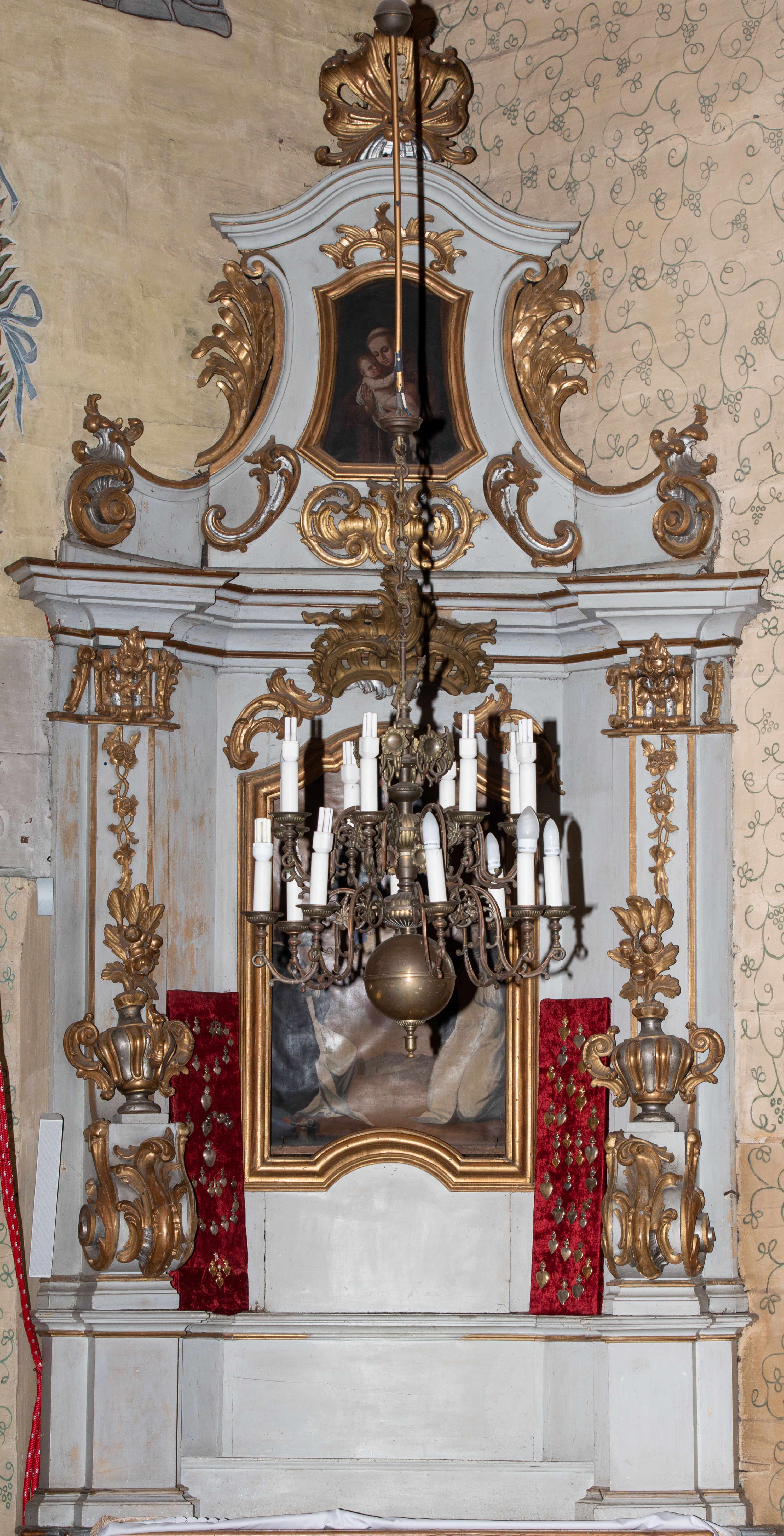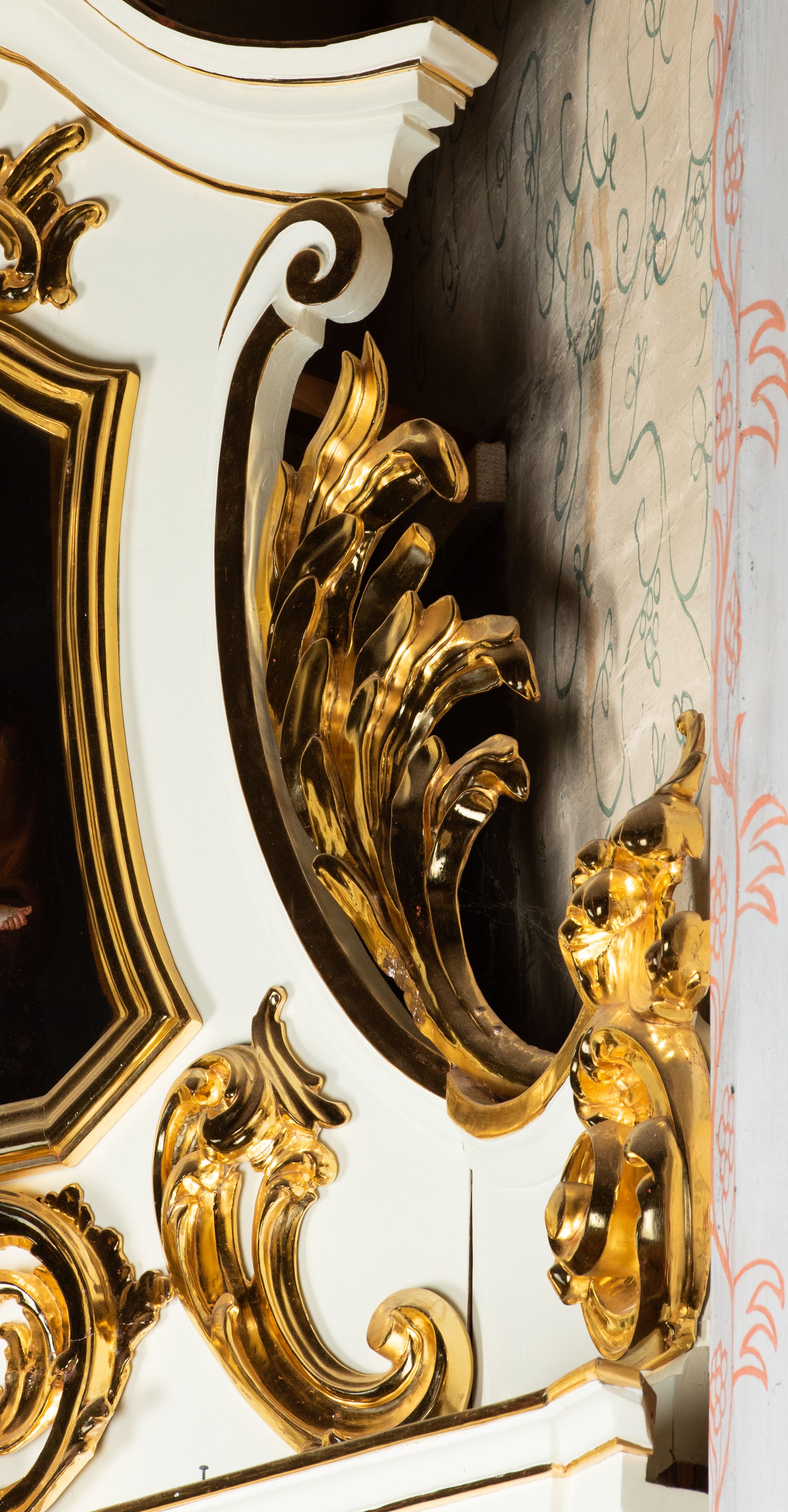 The side altar in the church in Marcyporęba was probably made by an anonymous employee of Antoni Gegenbaur in the second half of the 18th century. In the middle area there is a painting of Our Lady of the Rosary with Dominican saints, and in the altar finial there is a painting of Saint Anthony of Padua with the Child.