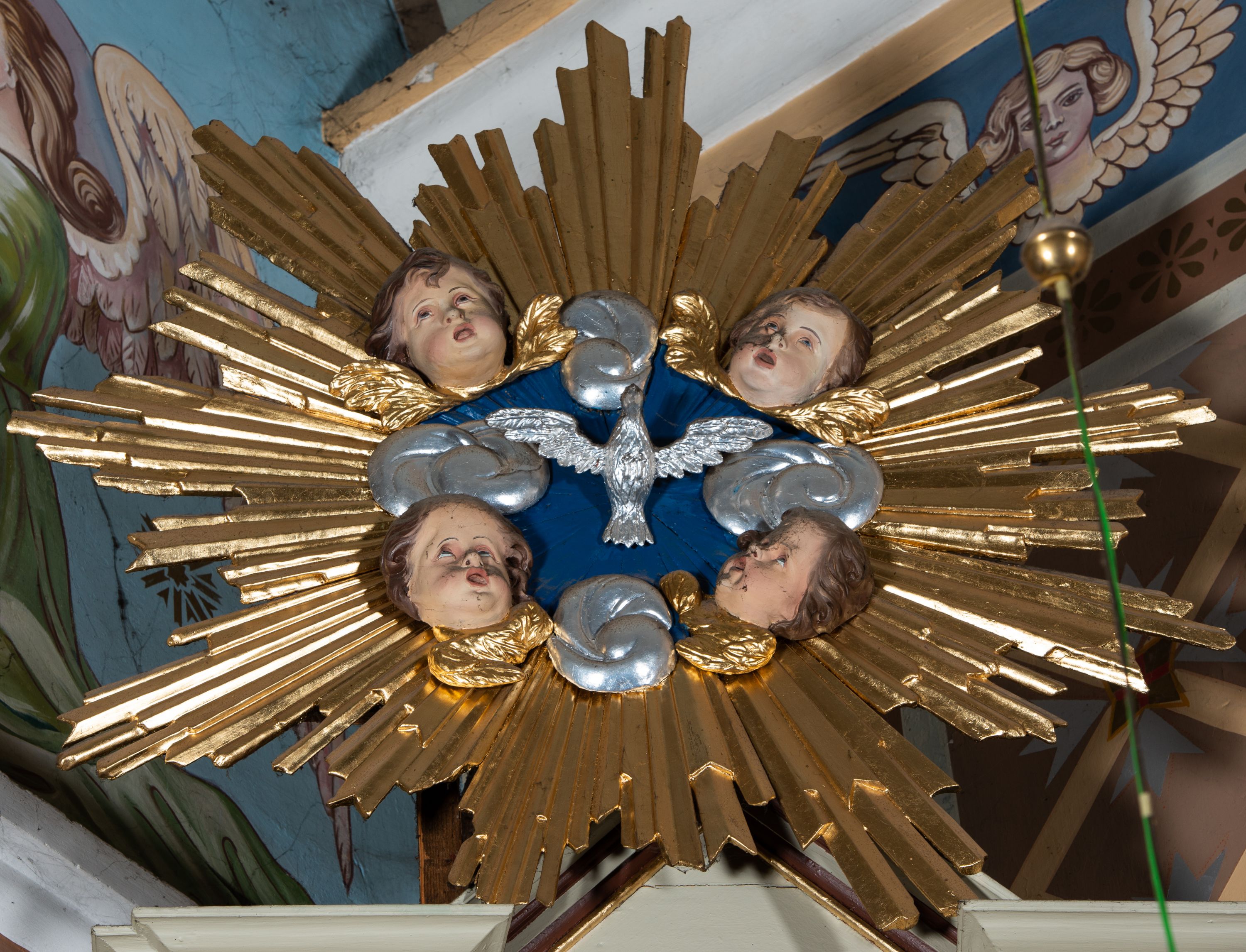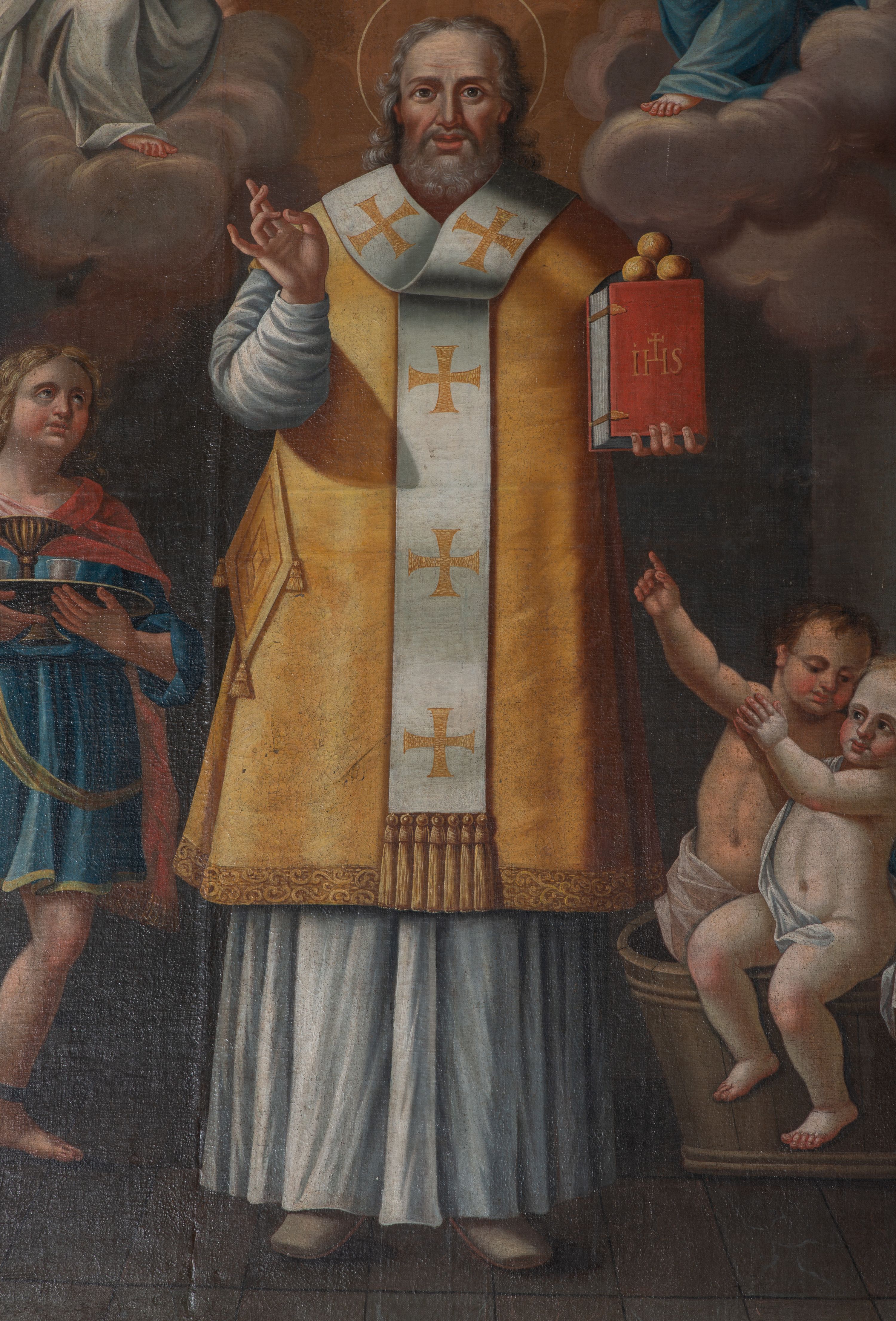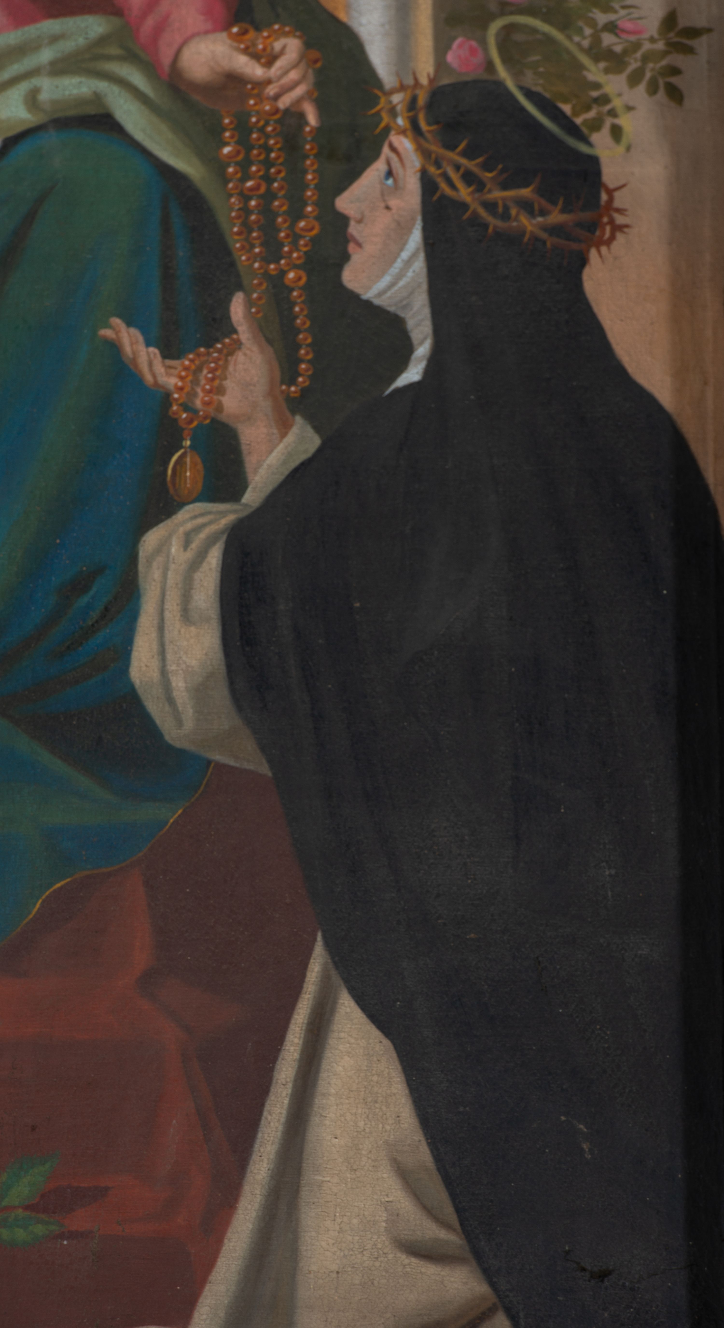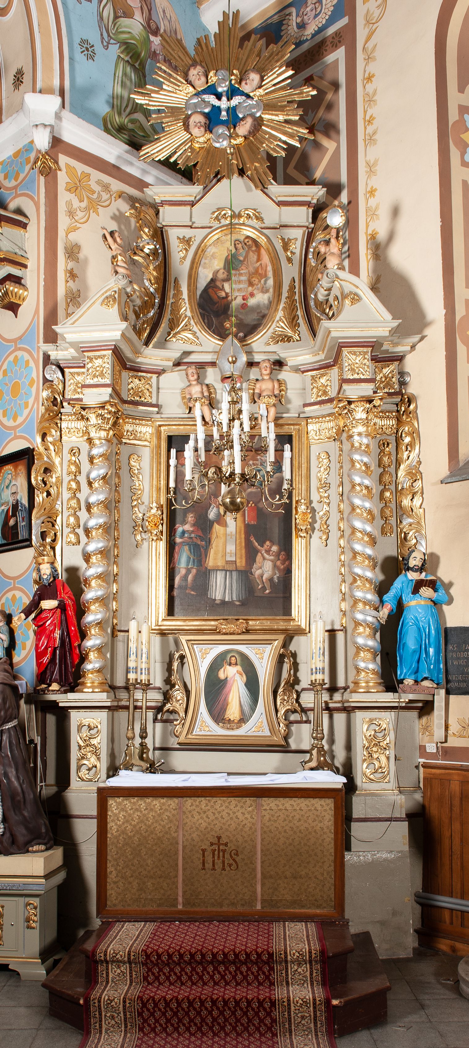 The side altar was created after a new church had been built in 1742 but before 1745 - and thus before the date of consecration that is indicated on the altare portatile of the adjacent side reredos. The reredos depicts aedicula type, i.e. a simple, one storey structure, held by two supports, with altar finial.