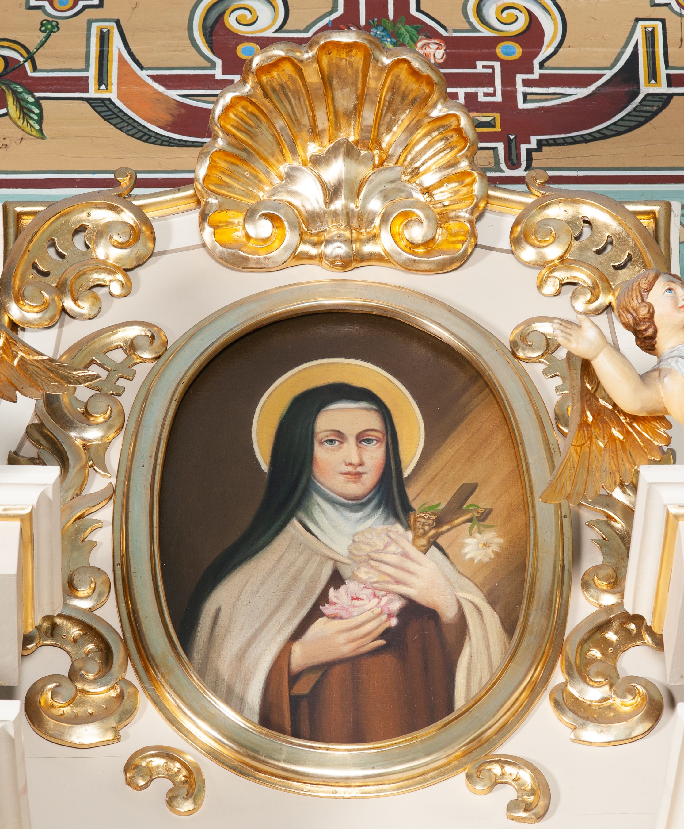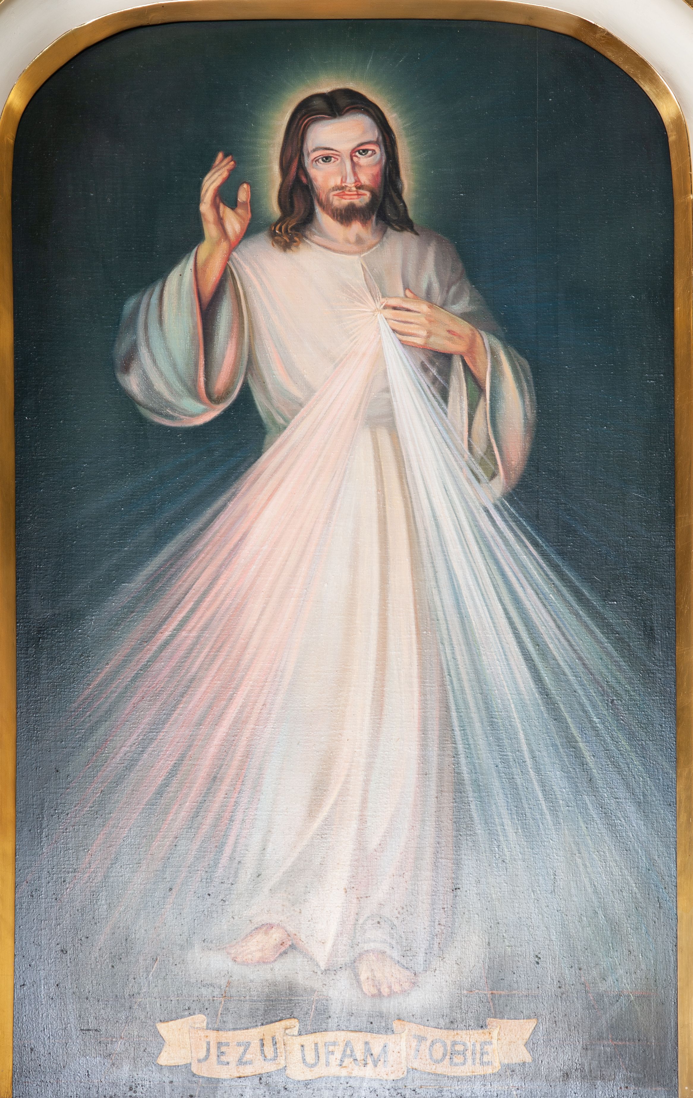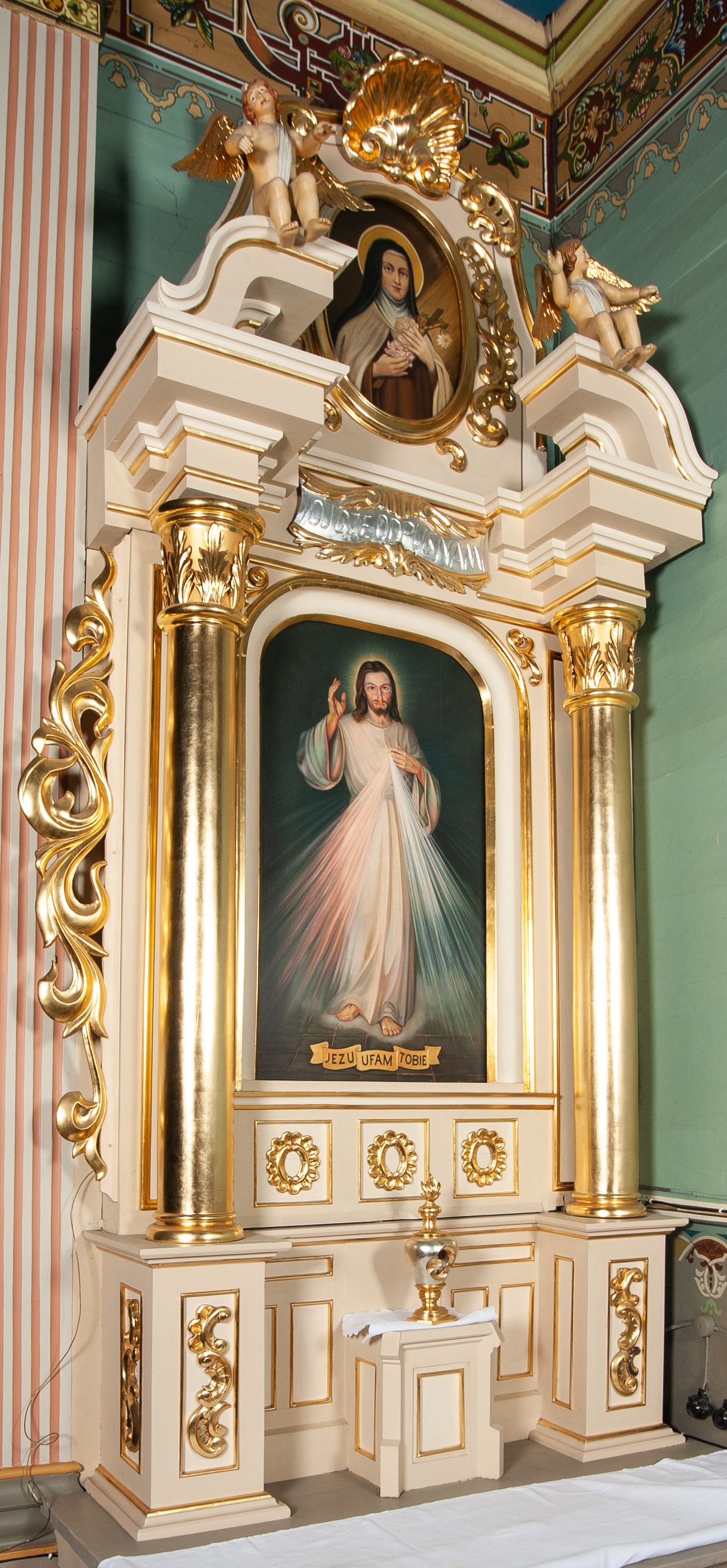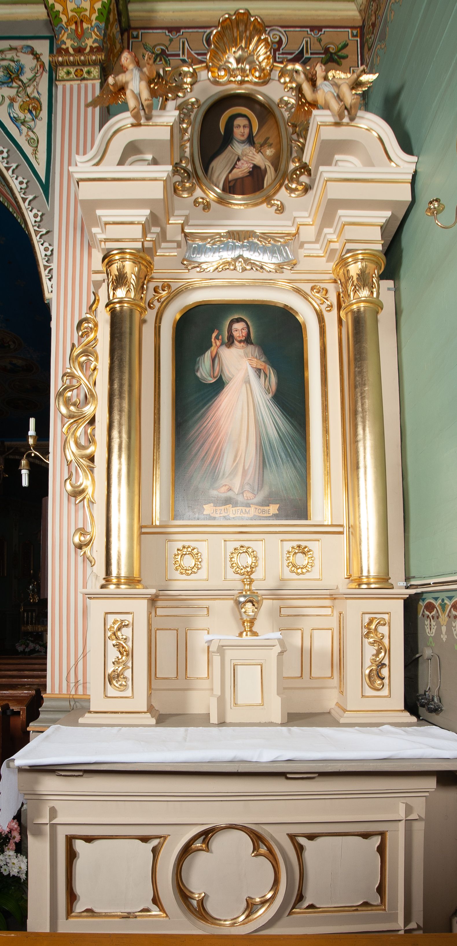 The side altar of the Church of the Nativity of the Blessed Virgin Mary in Krzęcin was made at the end of the 19th century or beginning of the 20th century and is a neo-baroque work. The image of the Christ Crucified and the image of Merciful Jesus [Jesus, I trust in You] is placed in its main area.