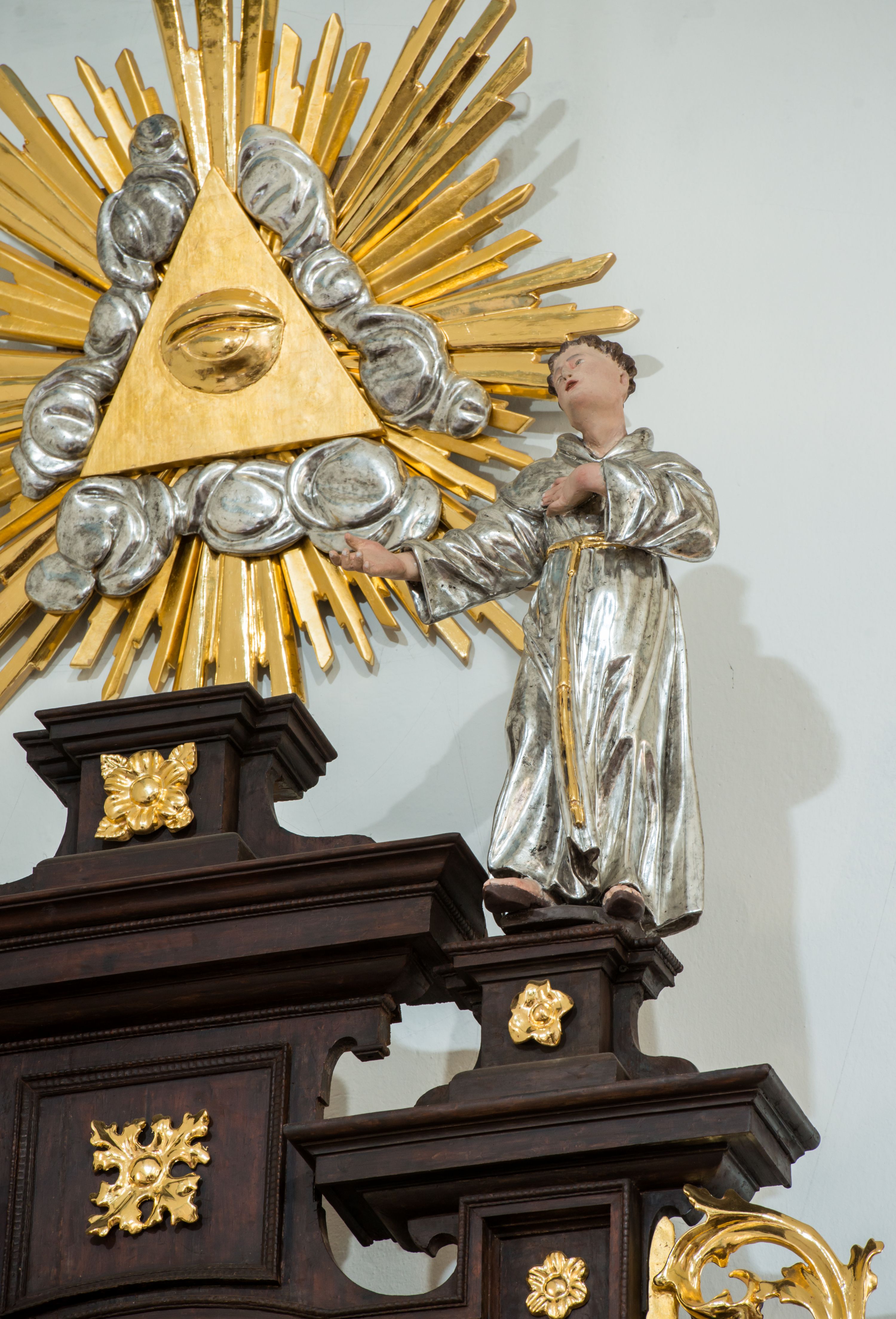 A late baroque altar has undergone a series of changes. Over the last half-century, the altar finial in a form of Eye of Providence has been added, the colour scheme of polychrome of the structure has been changed, and sculptures of saints, located on the second tier, have been interchanged with sculptures from the opposite side altar.