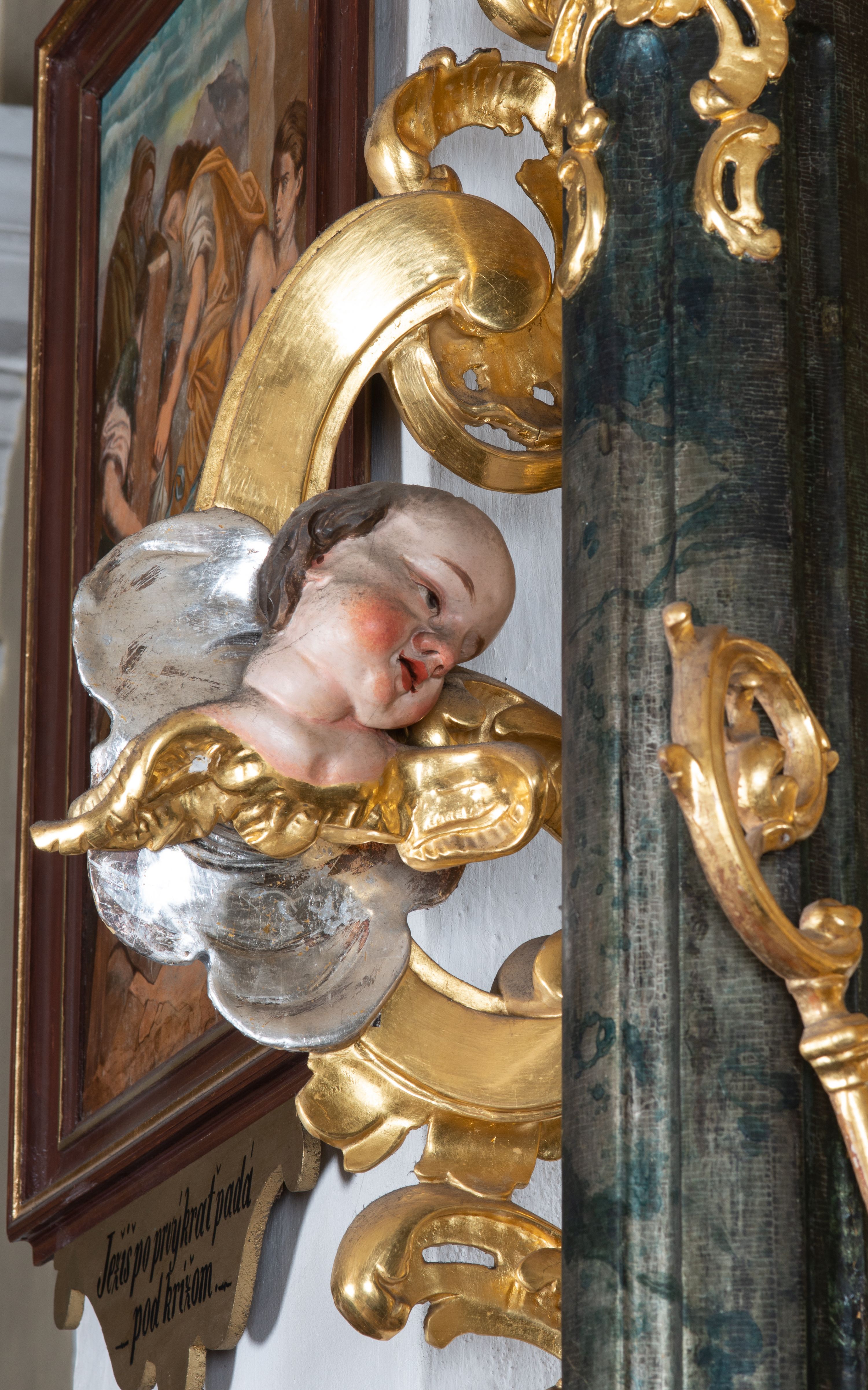 The high altar in the church in Łapsze Wyżne was built shortly after the construction of the temple in Rococo style, around 1777. It represents a single-storey, single-axis reredos with gates, decorated with a rococo ornament, typical of the time of creation. Together with the high altar, a second side altar and a pulpit, it forms an integral church decor, made by the workshop of artists from Kežmarok – Johann and Franciszek Feeg. One of funders of the altar is i.a. Jan Joanelli of Tolvano. The altar and its sculptures are examples of so-called Rococo of Spiš – a style that gradually developed from the 1740s and was characterised by exceptional decorativeness of means of expression.