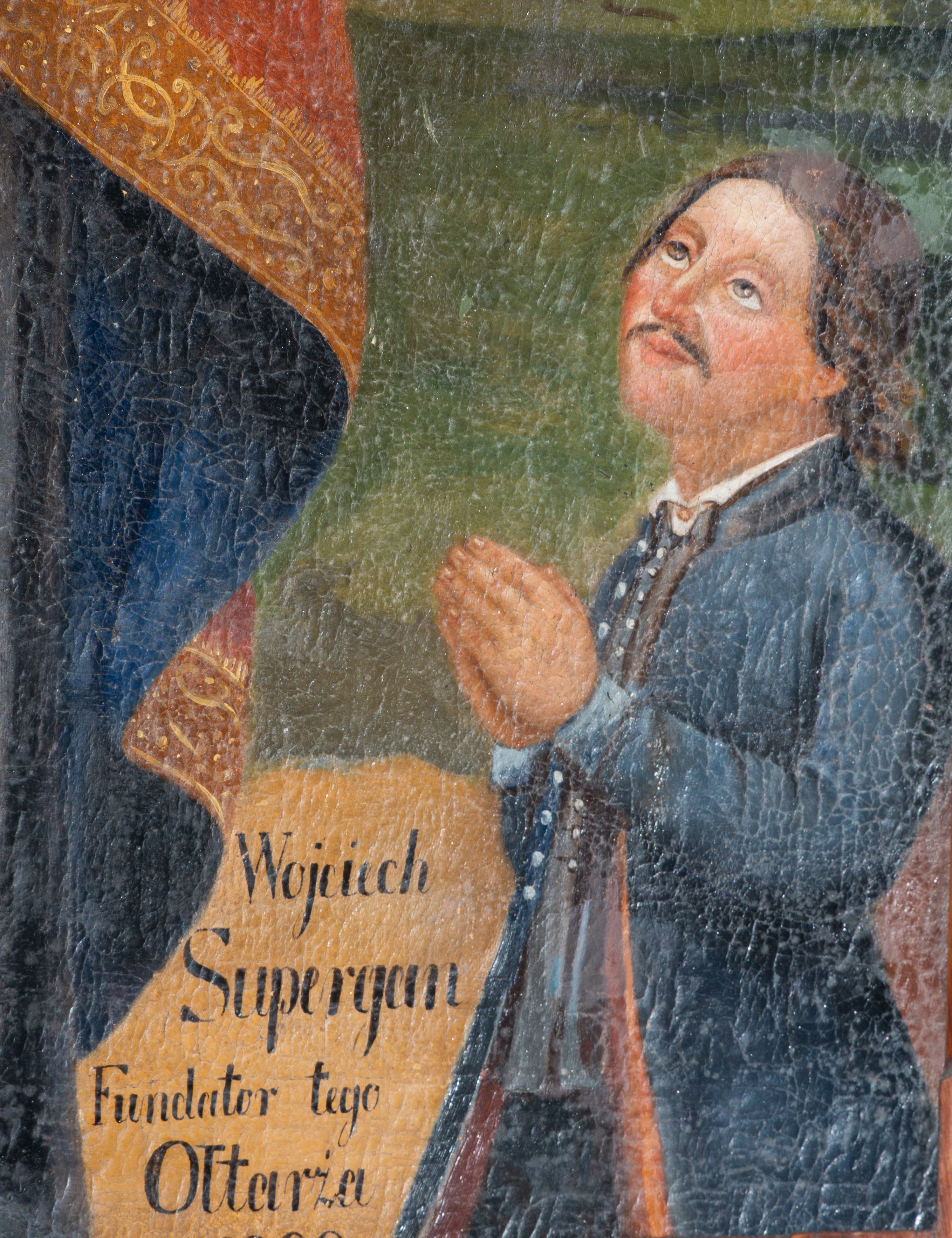 The painting of St. Adalbert was created around 1800 and was intended for the altar of St. Adalbert, funded by Wojciech Supergan. After 1912 it was moved to a new church in Jordanów. In 983 Saint Adalbert received episcopal consecration and later he became the Bishop of Prague. Adalbert went to Prussia on a mission to convert pagans, where he died a martyr's death. As he sailed there by boat across the Vistula river, an oar became his attribute.