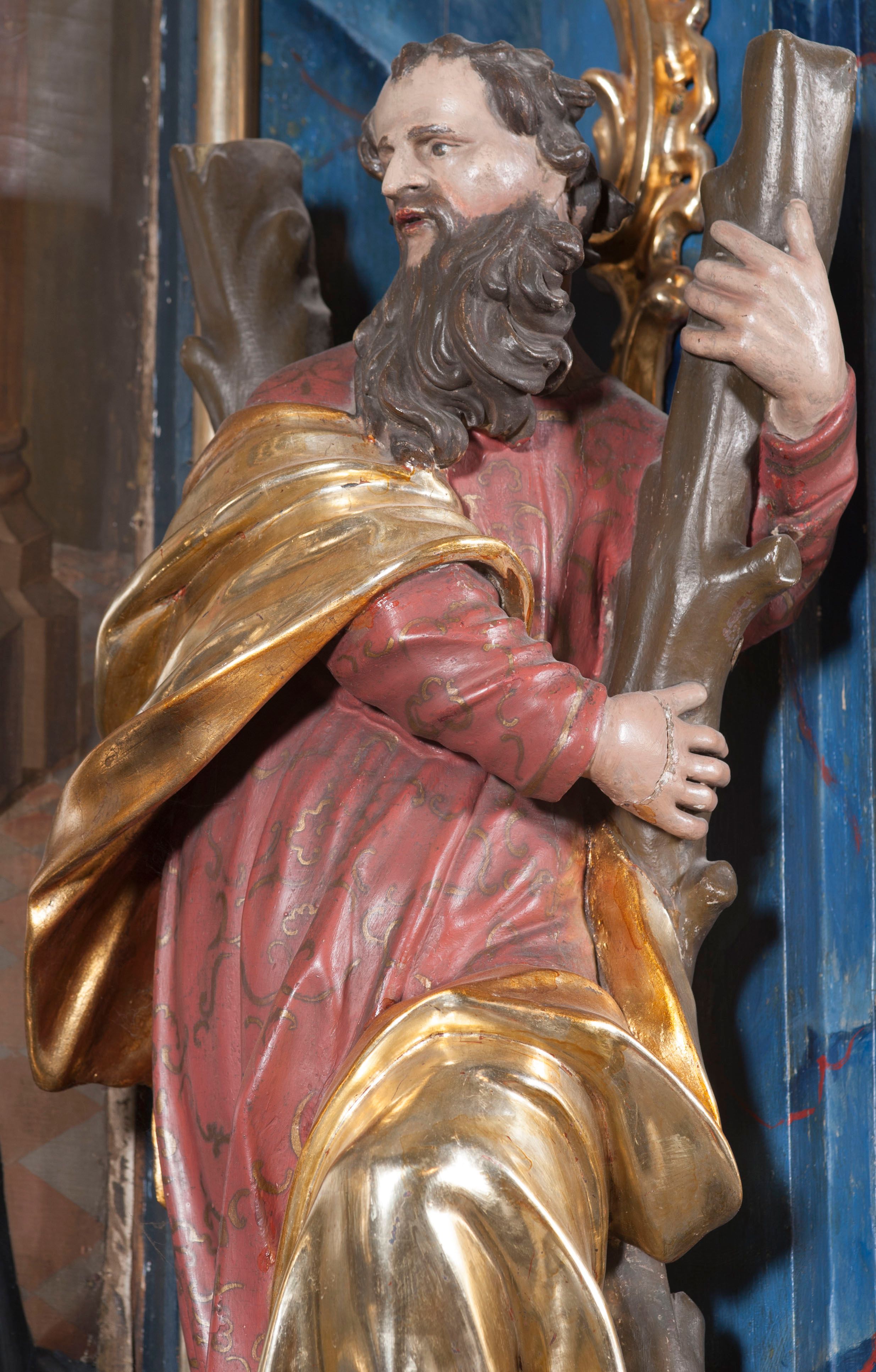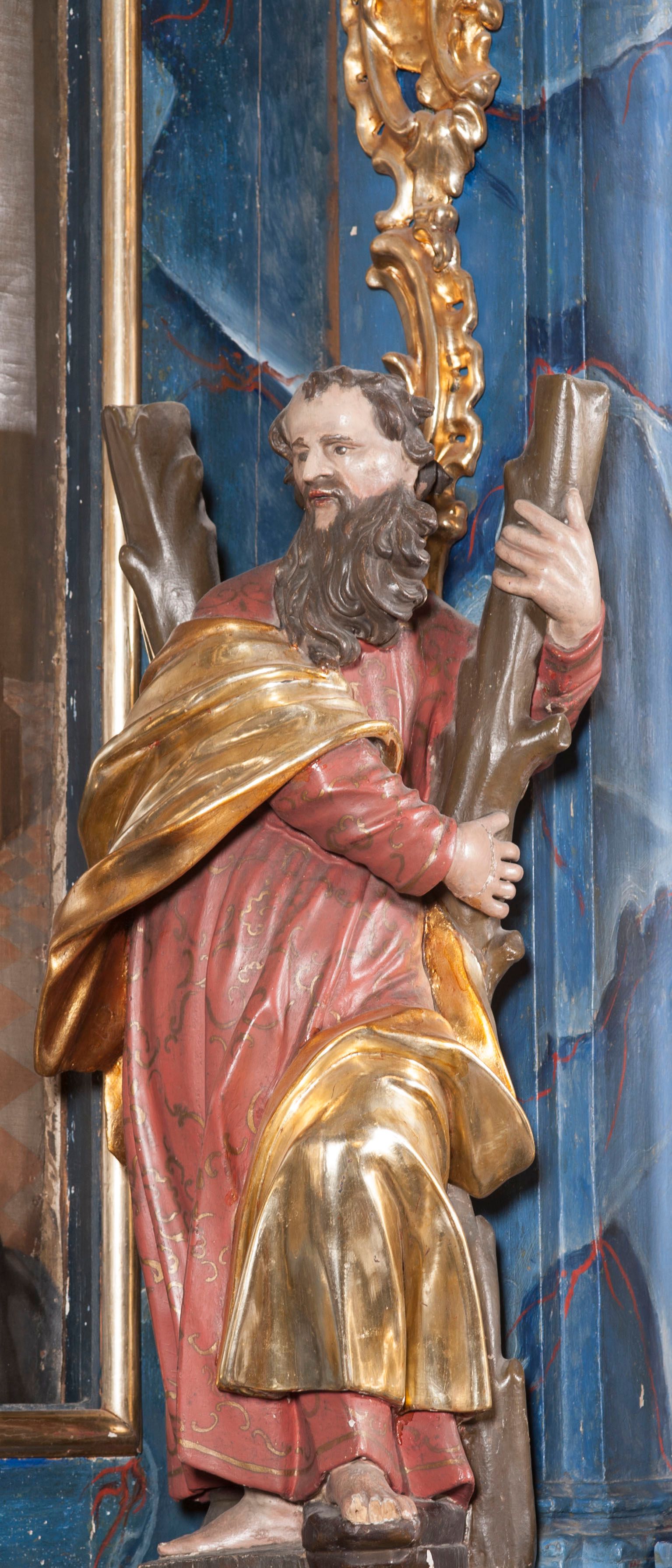 Architectural and sculptural furnishings of the church, including the statue of St. Andrew, were created after 1765, most probably in the workshop of the Kornecki family of Gdów. Saint Andrew can be identified by his attribute – the cross in the shape of the letter "X" (the so-called cross of St. Andrew), on which he suffered a martyr's death.