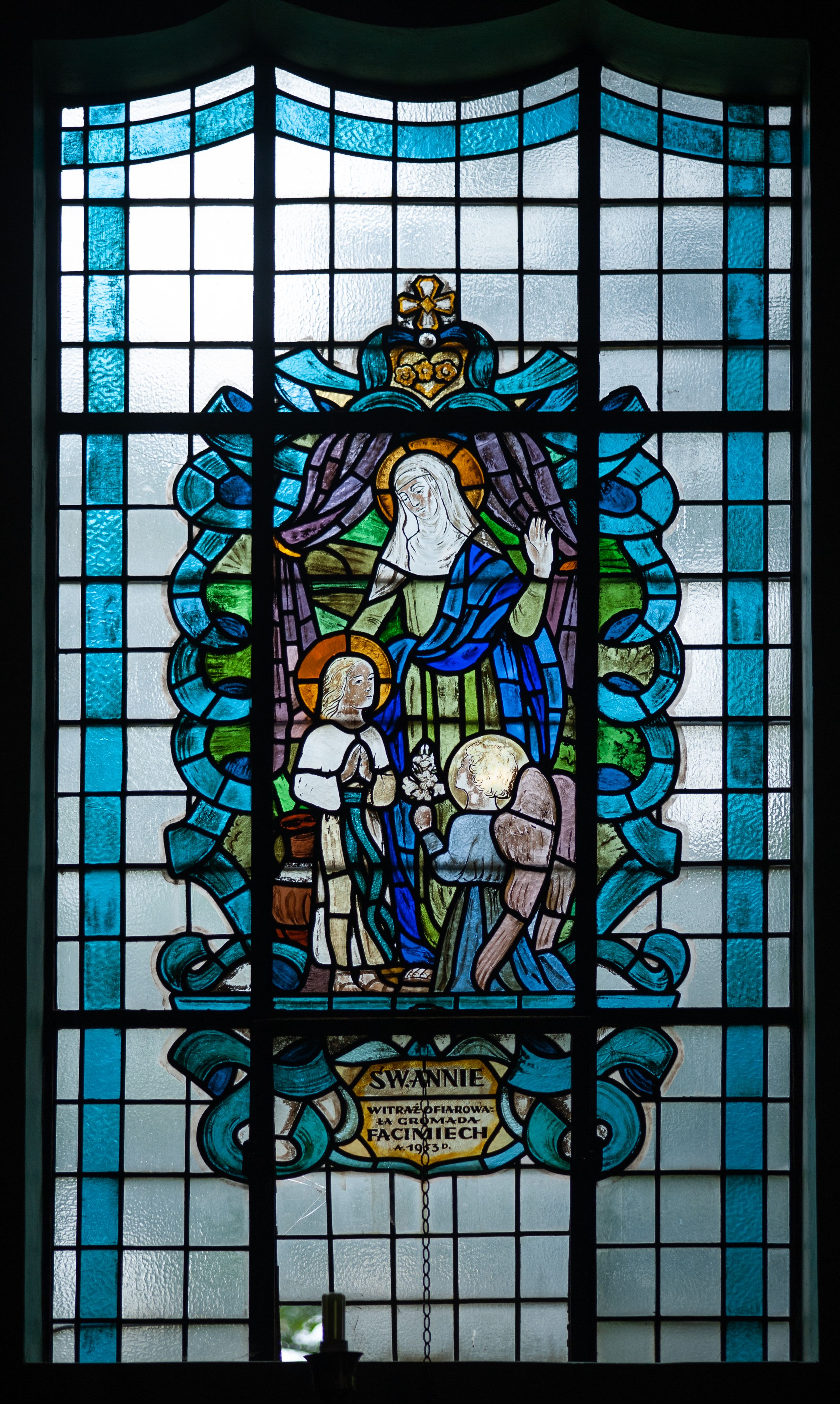 Stained glass with the representation of Saint Anne with little Mary and an angel kneeling in front of them was created in 1953 in a nationalised workshop, formerly known as "S.G. Żeleński" in Cracow. It was funded by Gromada Facimiech.