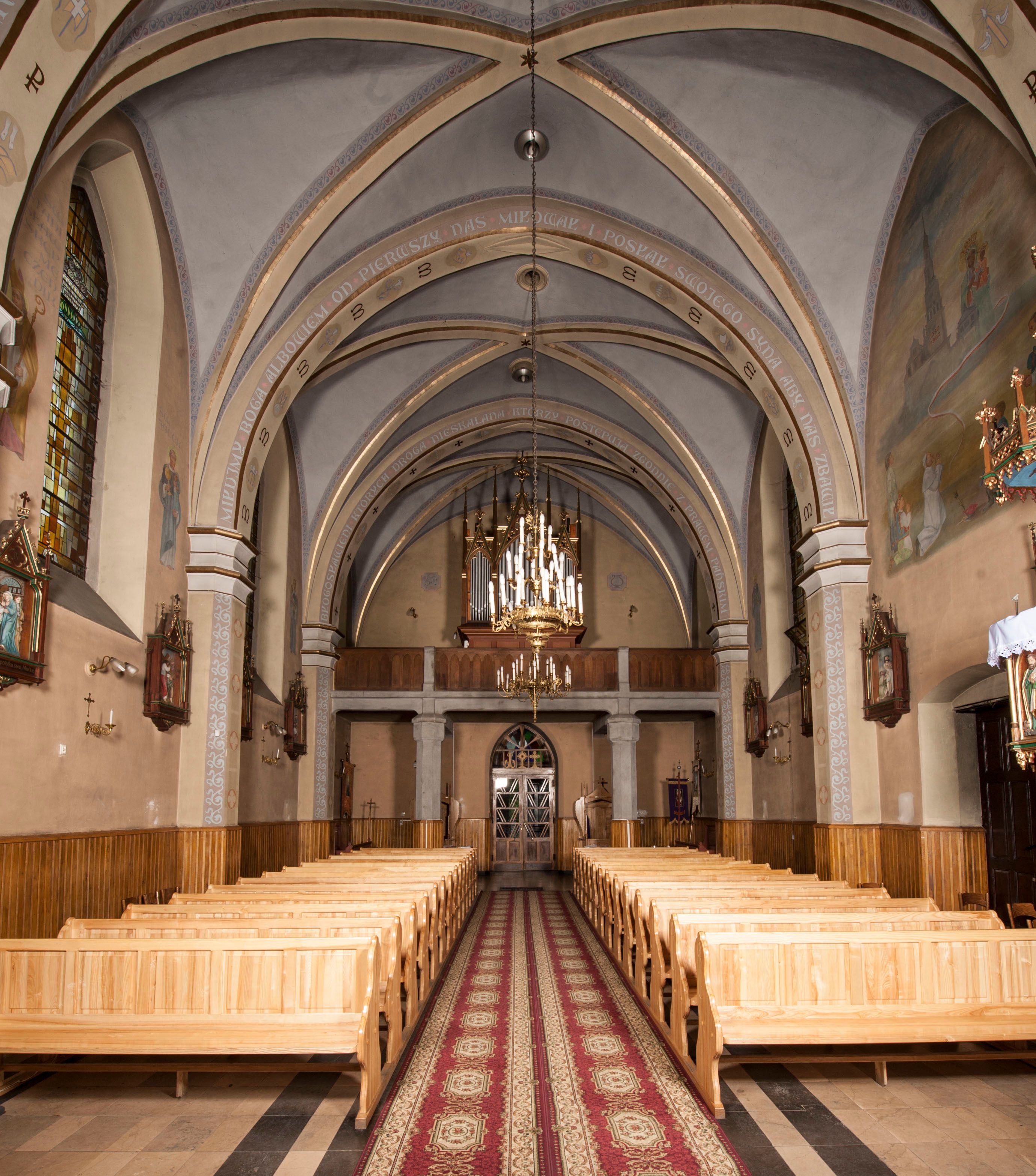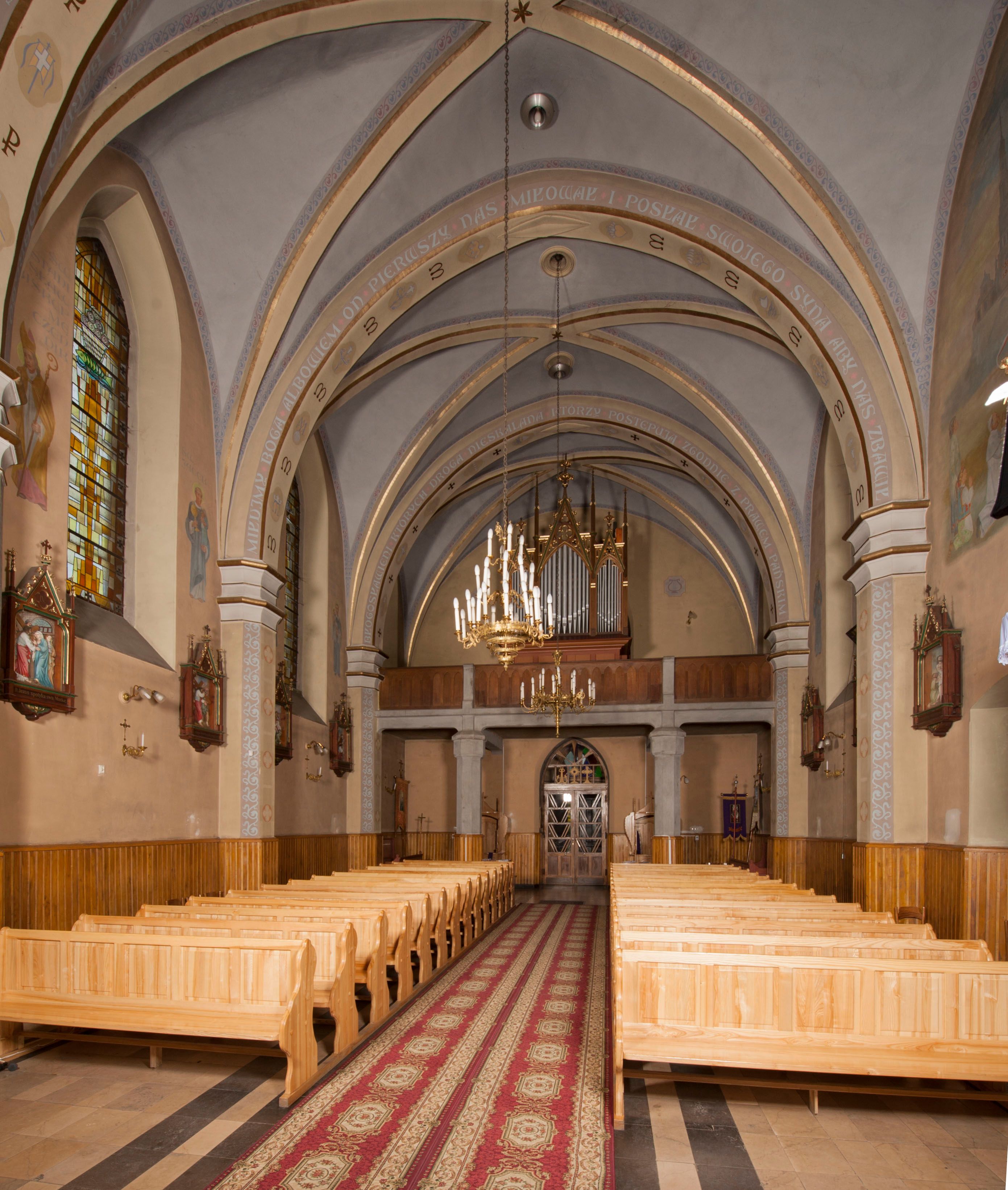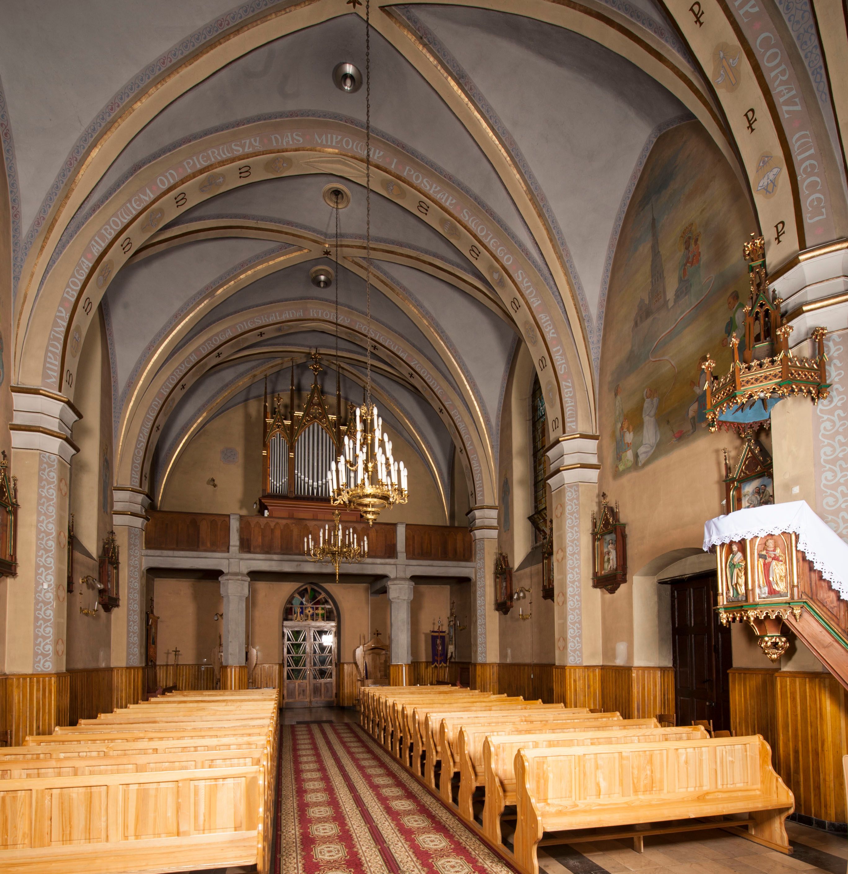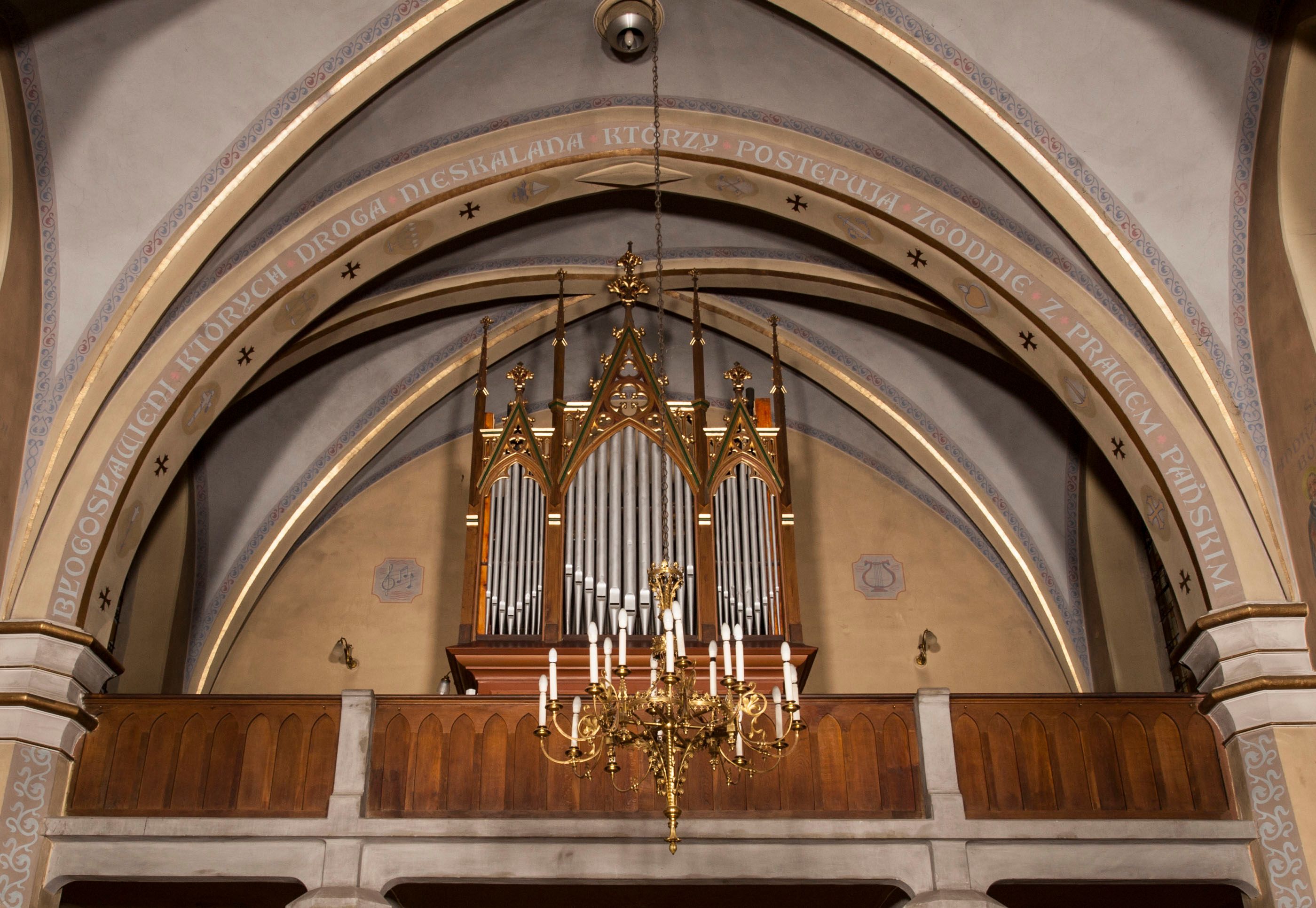 The church in Stryszawa of Saint Anne was built in 1892-1894 and was consecrated in 1897. It was created on the initiative of a resident Michał Trzop with the support of the Branicki family and the parish priest of the church in the neighbouring village of Sucha. It was designed in the neo-Gothic style, including the interior furnishings. Three neo-gothic altars in the chancel and main nave were carved by Stanisław Jarząbek from Kęty, the altar in the side chapel was made by local sculptors Ignacy Szklarczyk and Franciszek Laśniak. Tomasz Fall prepared the organs stylistically adapted for these furnishings. The statuette of the Risen Christ and the Stations of the Cross were brought from Tyrol, where thriving manufacturing centres of church furnishings housed in the 19th century.