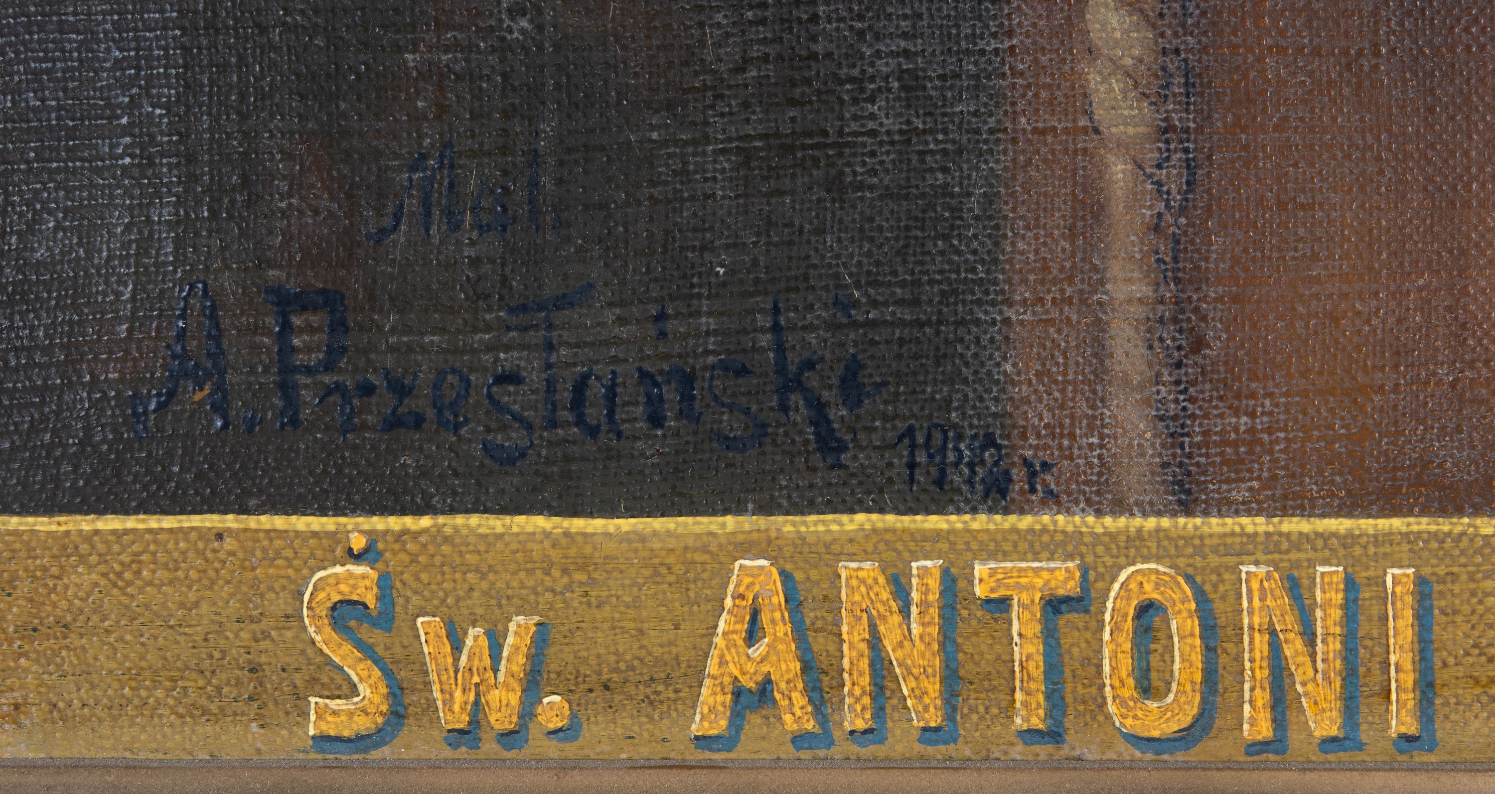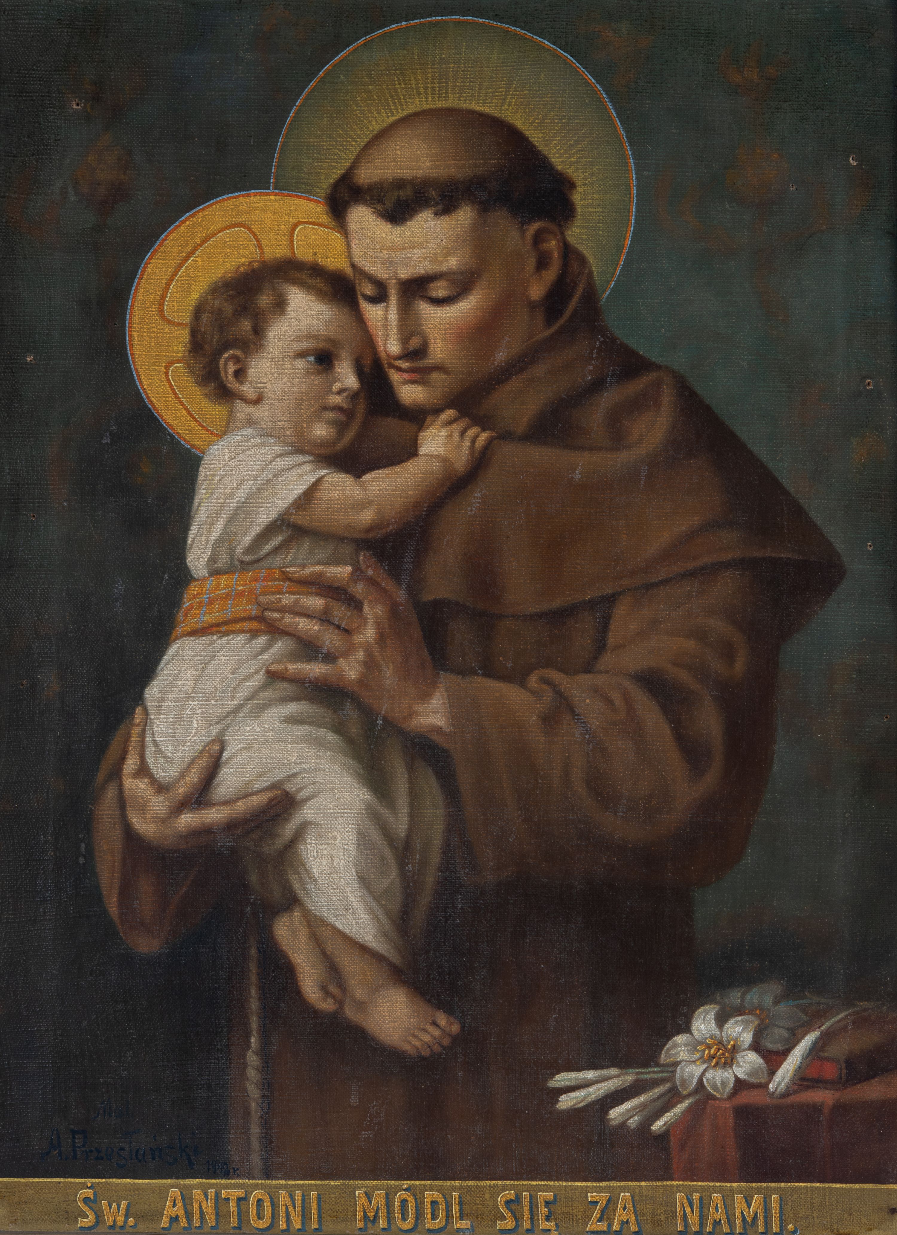 The painting of St. Anthony of Padua was made by Antoni Przesłański in 1942. It was given to the church in Raciechowice as a votive offering for the "graces received". In iconography, the saint is presented in a Franciscan habit and a tonsure on his head. He often holds or adores the Child, because, according to legend, Jesus appeared to the saint. His attribute is also a lily.