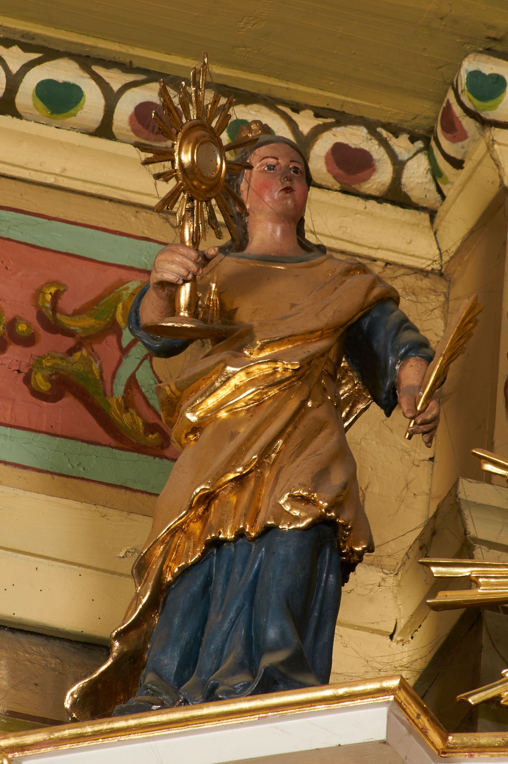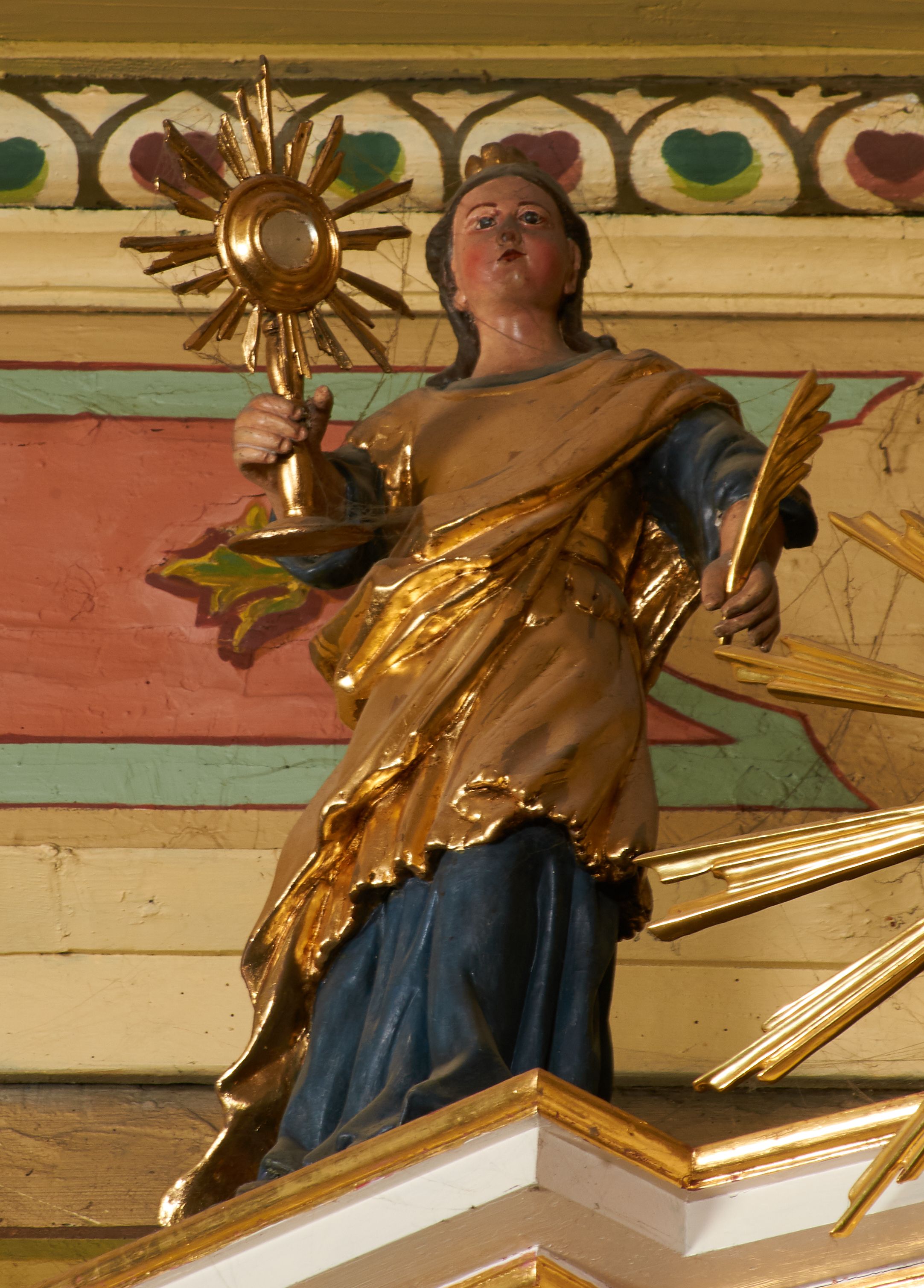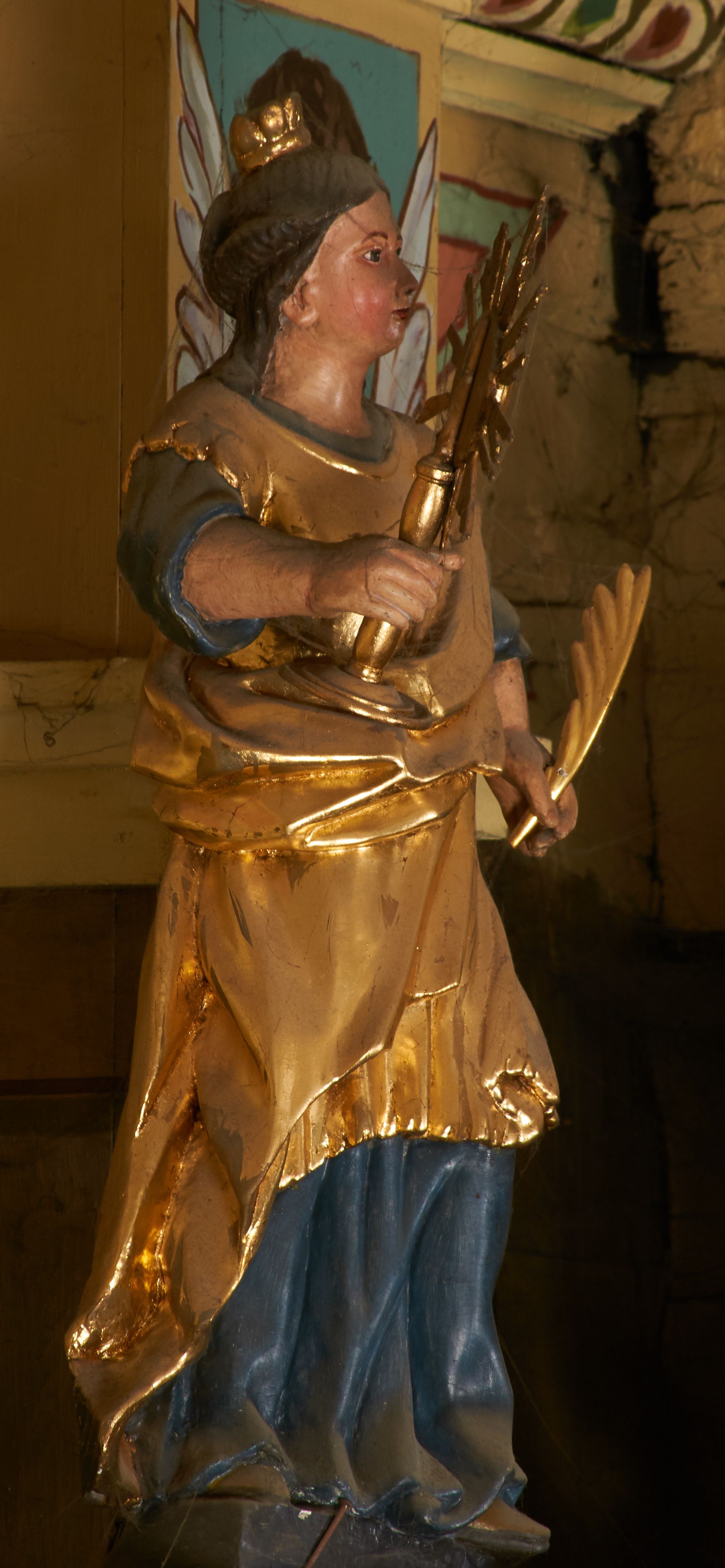 A statuette of St. Barabara originates from the original altar of the Transfiguration (before 1747) which was destroyed in 1914. In 1929, the altar was reconstructed, using preserved elements of the previous reredos, including the sculpture in question. Saint Barbara was daughter of a wealthy pagan, she secretly converted to Christianity in secret from her father and took vows of chastity, for which he locked her in the tower, and later she was sentenced to be beheaded. Her attributes are a chalice with the Host or (very rarely) a monstrance and a palm leaf.
