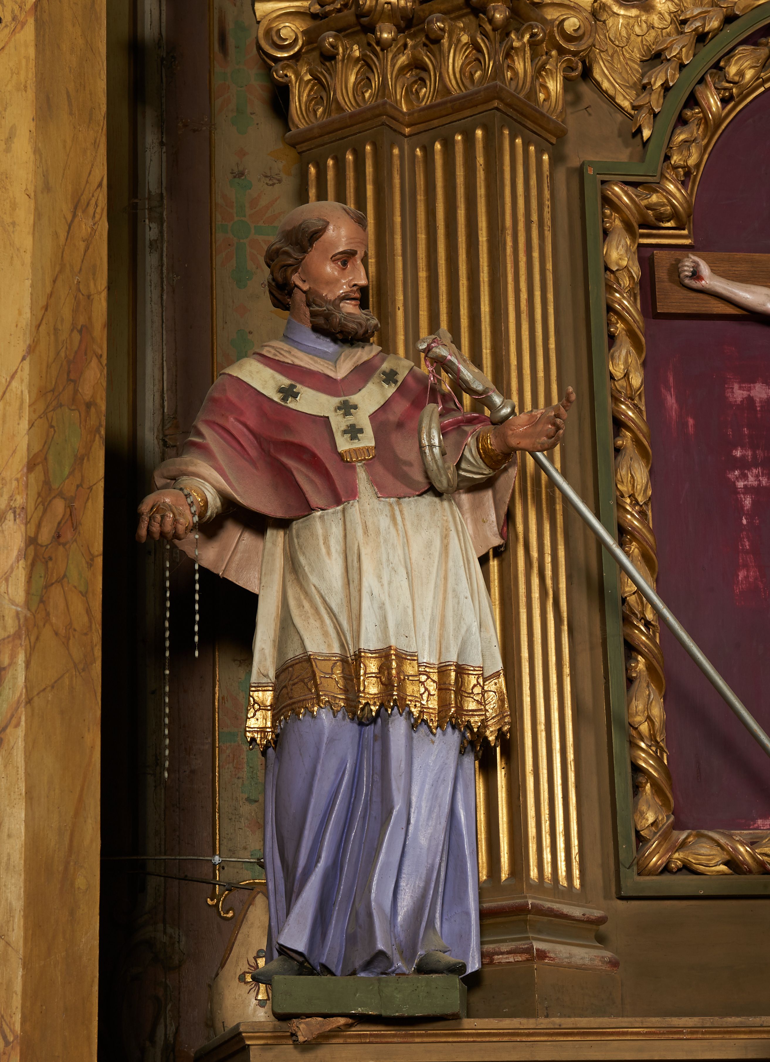 Statues of two bishops were (probably) originally located in St. Anne's altar in the chapel. The altar, together with the sculptures, was most probably made in the workshop of the Kornecki family before 1766. At the turn of the 19th anf 20th centuries, it was transferred to the nave. The statues were placed on the reredos, modelled on St. Anne's altar, which was set in the nave in front of the above-mentioned altar. The statue of saint is extremely similar (from the formal perspective) to the sculptures created in the workshop of the Kornecki family.