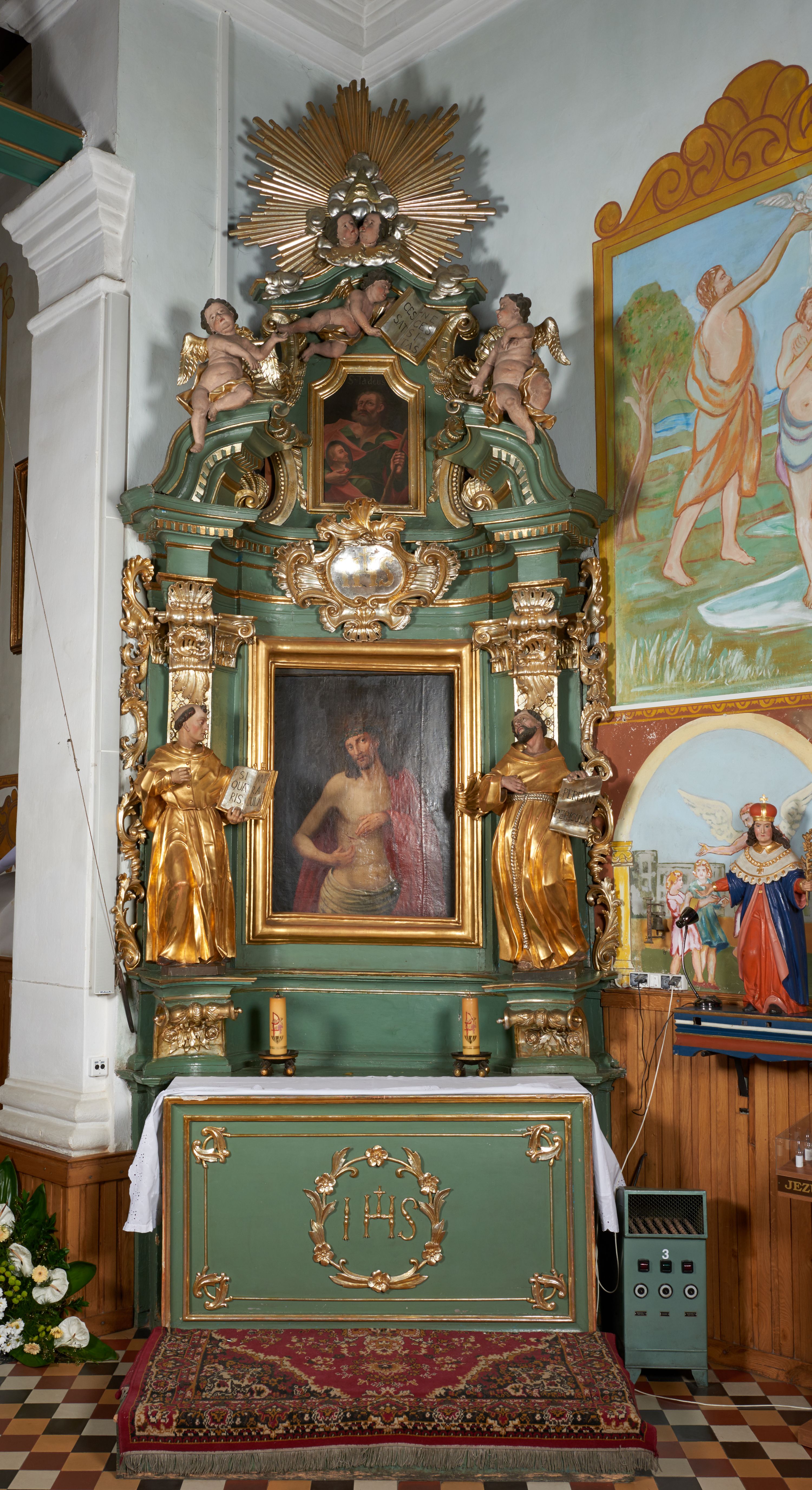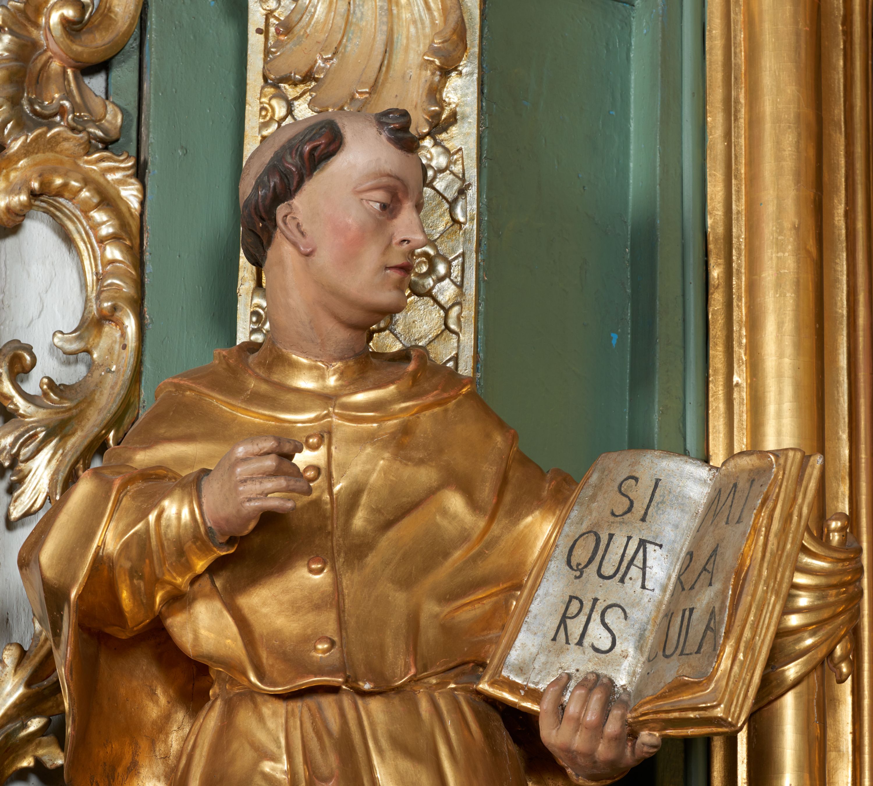 The statue of St. Bonaventure, together with the sculpture of St. Francis, was created along with the side altar, originally under the invocation of St. Anthony, before 1748. Their production is credited with Piotr Kornecki – the likely creator of all the furnishings of the church in Gdów. In previous literature, the statue was identified with St. Anthony of Padua. The statue most likely depicts St. Bonaventure, since he is holding an open book with the title verse of the responsory in honour of St. Anthony – "Si quaeris miracula," of which this saint was the author. The statue is dressed in a cassock and mozzetta – a clothing corresponding to his honourable position and iconography.