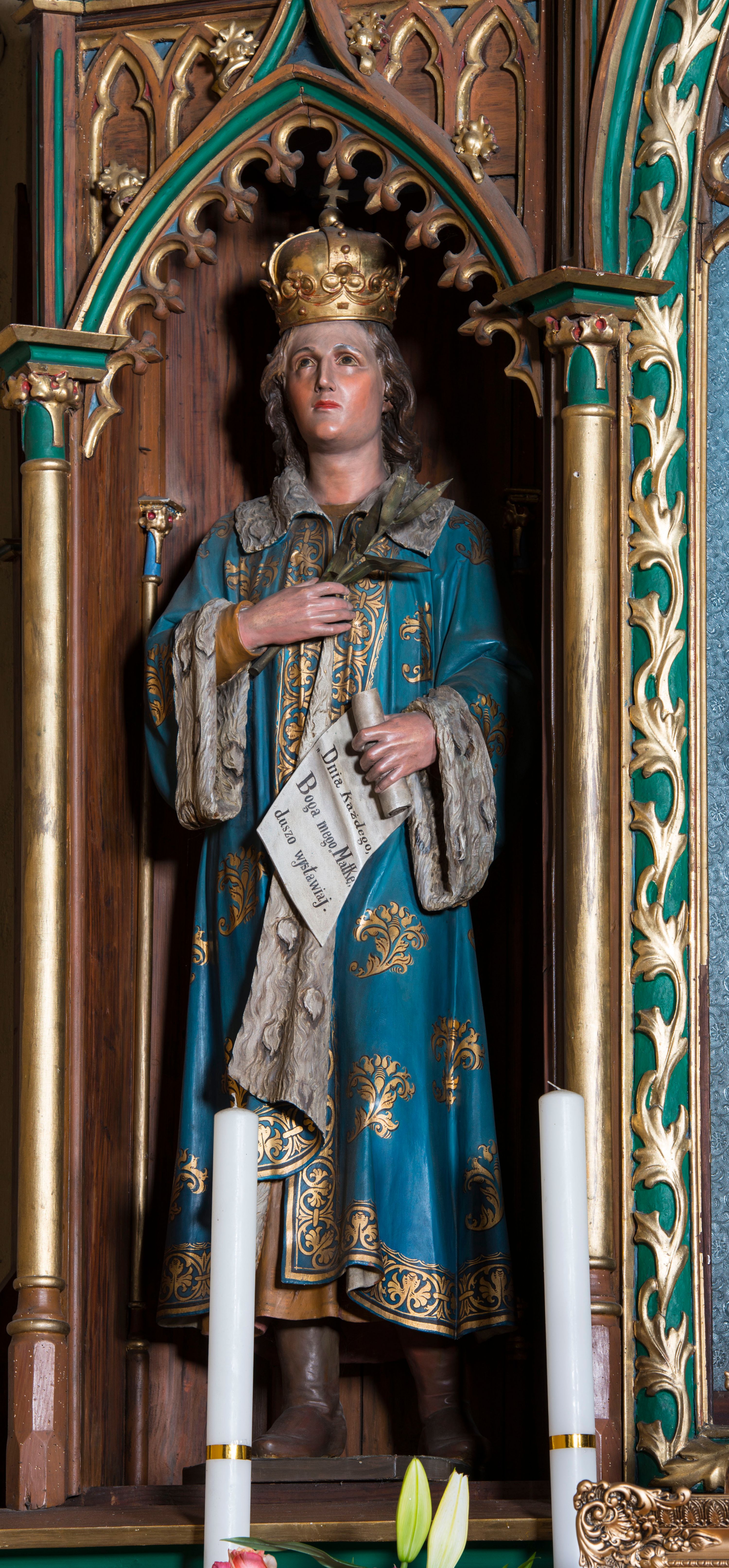 The statue of Saint Casimir was created at the end of the 19th century together with the altar made by Stanisław Jarząbek from Kęty. It is an example of an idealising sculpture of the 19th century and is characterised by good artistic quality.