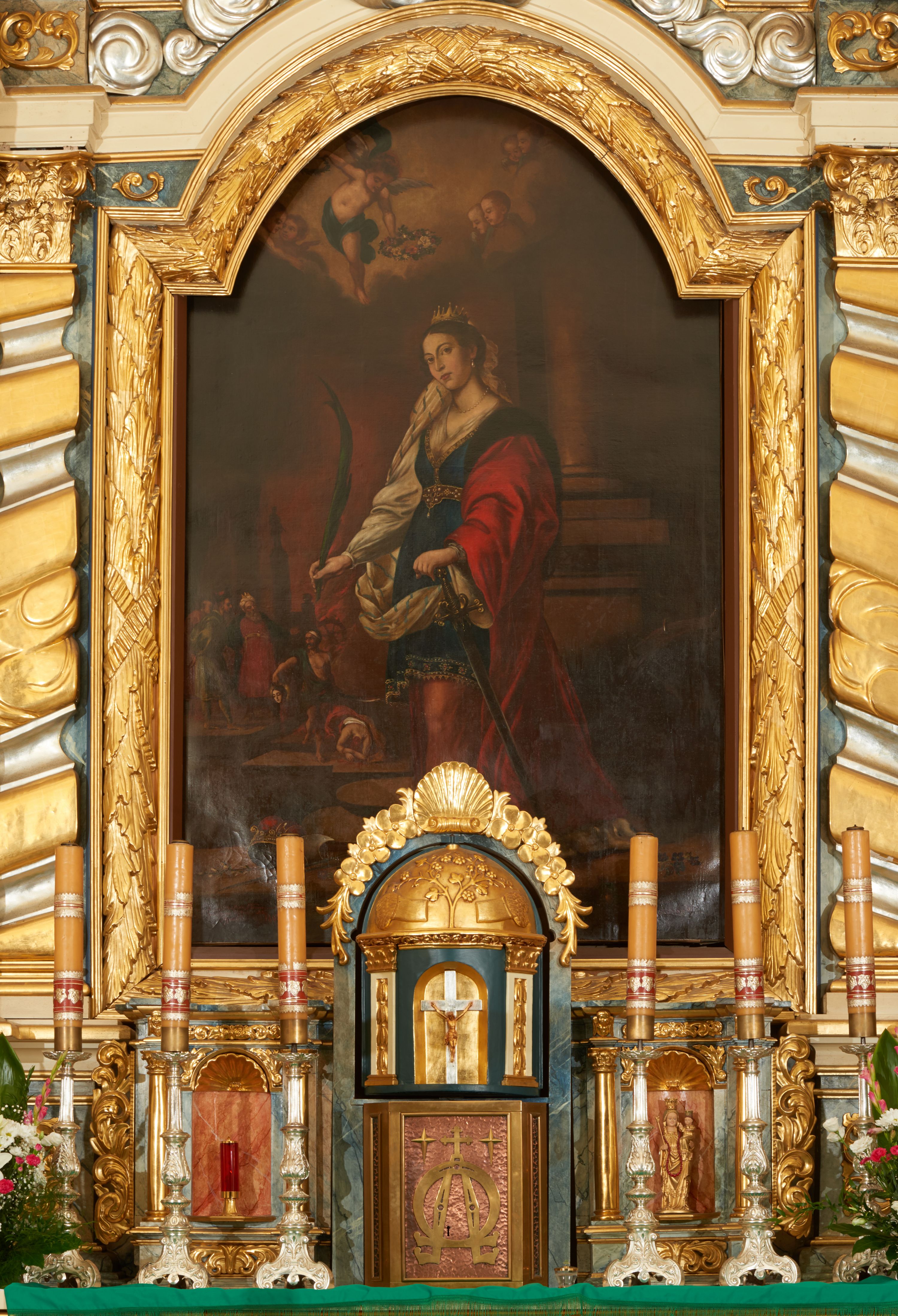 In the high altar of the church in Nowy Targ there is a painting of Saint Catherine of Alexandria, created by Władysław Rossowski in 1892 from the foundation of then parish priest Michał Wawrzynowski. Originally, a painting of the baroque painter Franciszek Lekszycki was placed here, decorated with 193 pearls and silver robes.