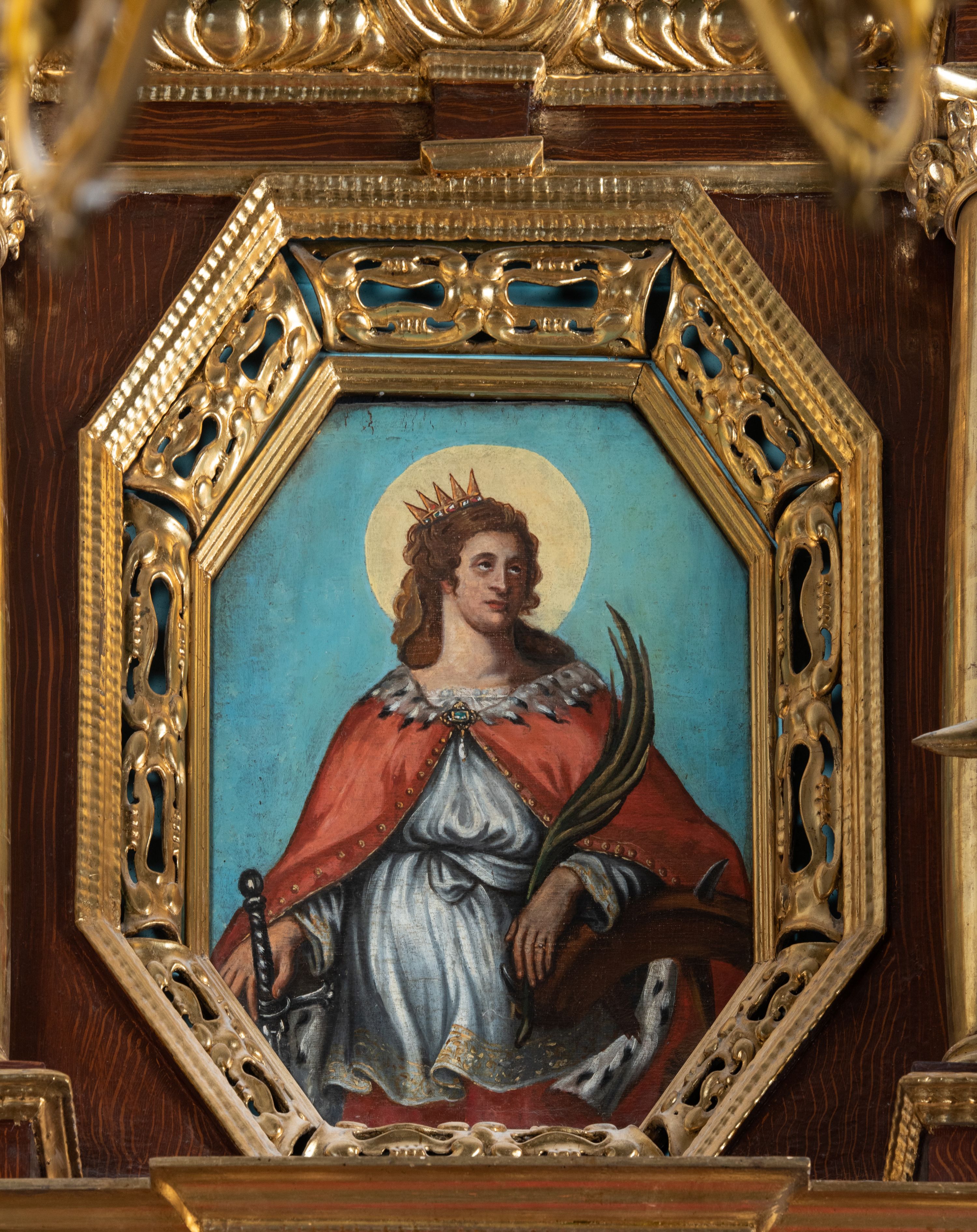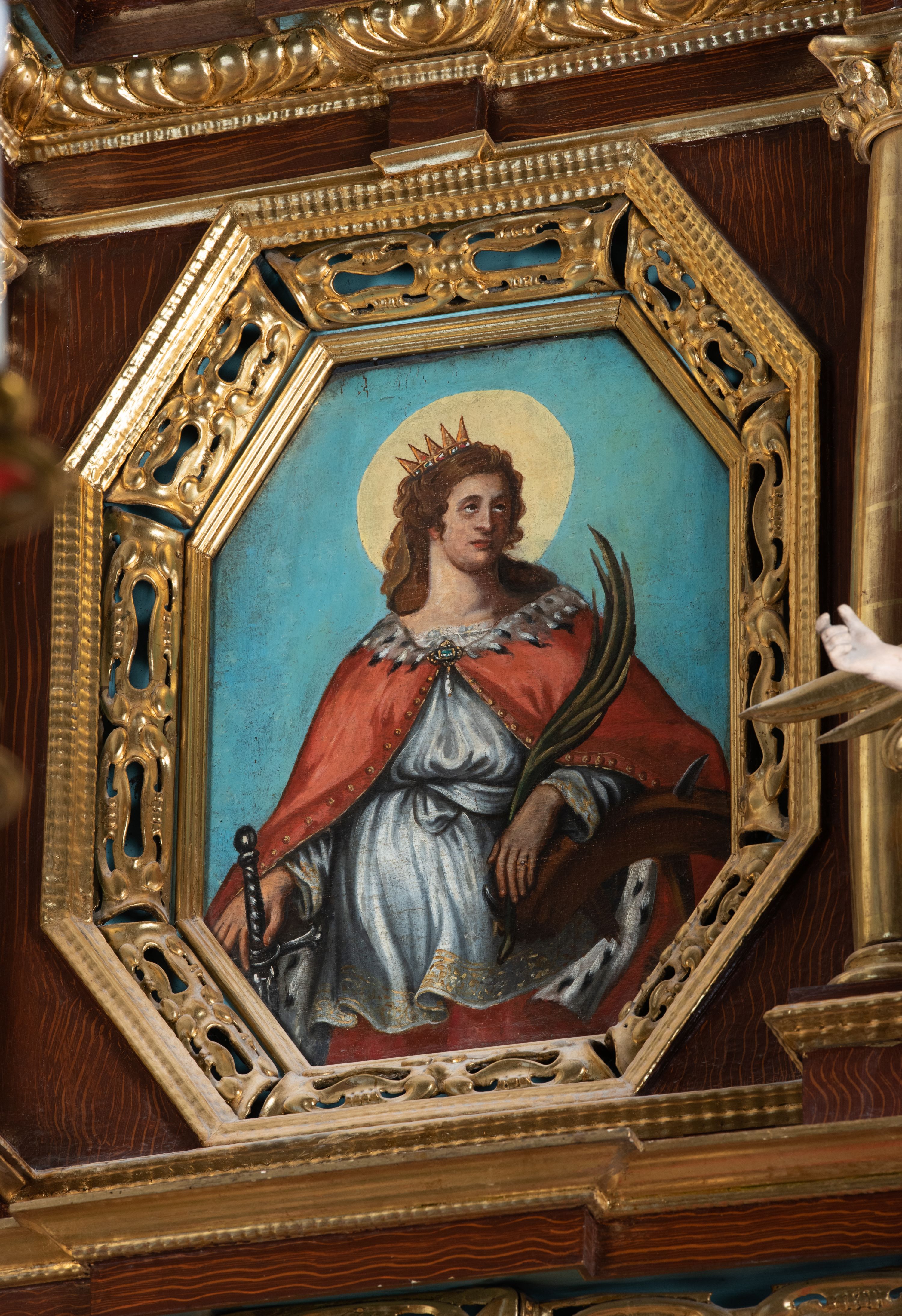The painting was produced in the 19th century by an unknown artist and it was inserted into an altar final of the Early Baroque. It depicts St. Catherine of Alexandria, a patroness of Christian philosophers and universities.