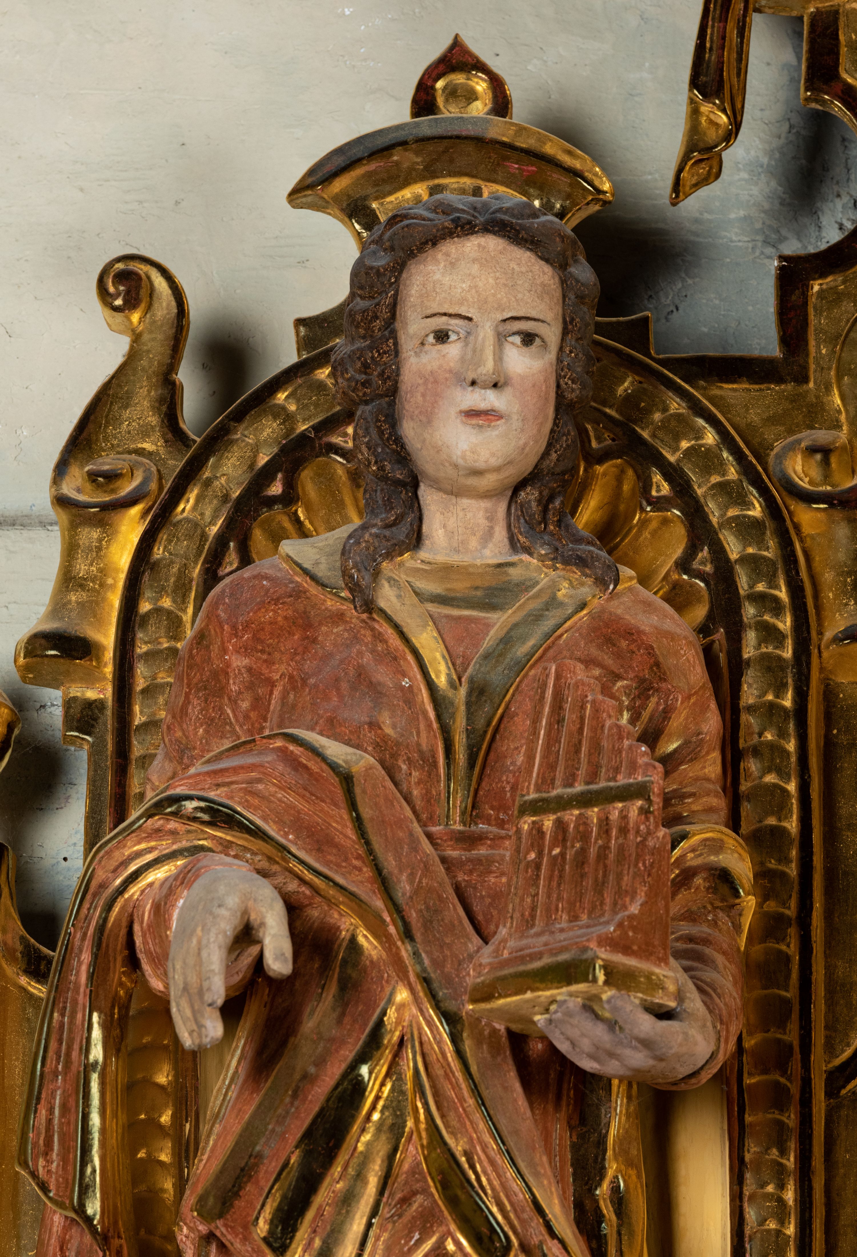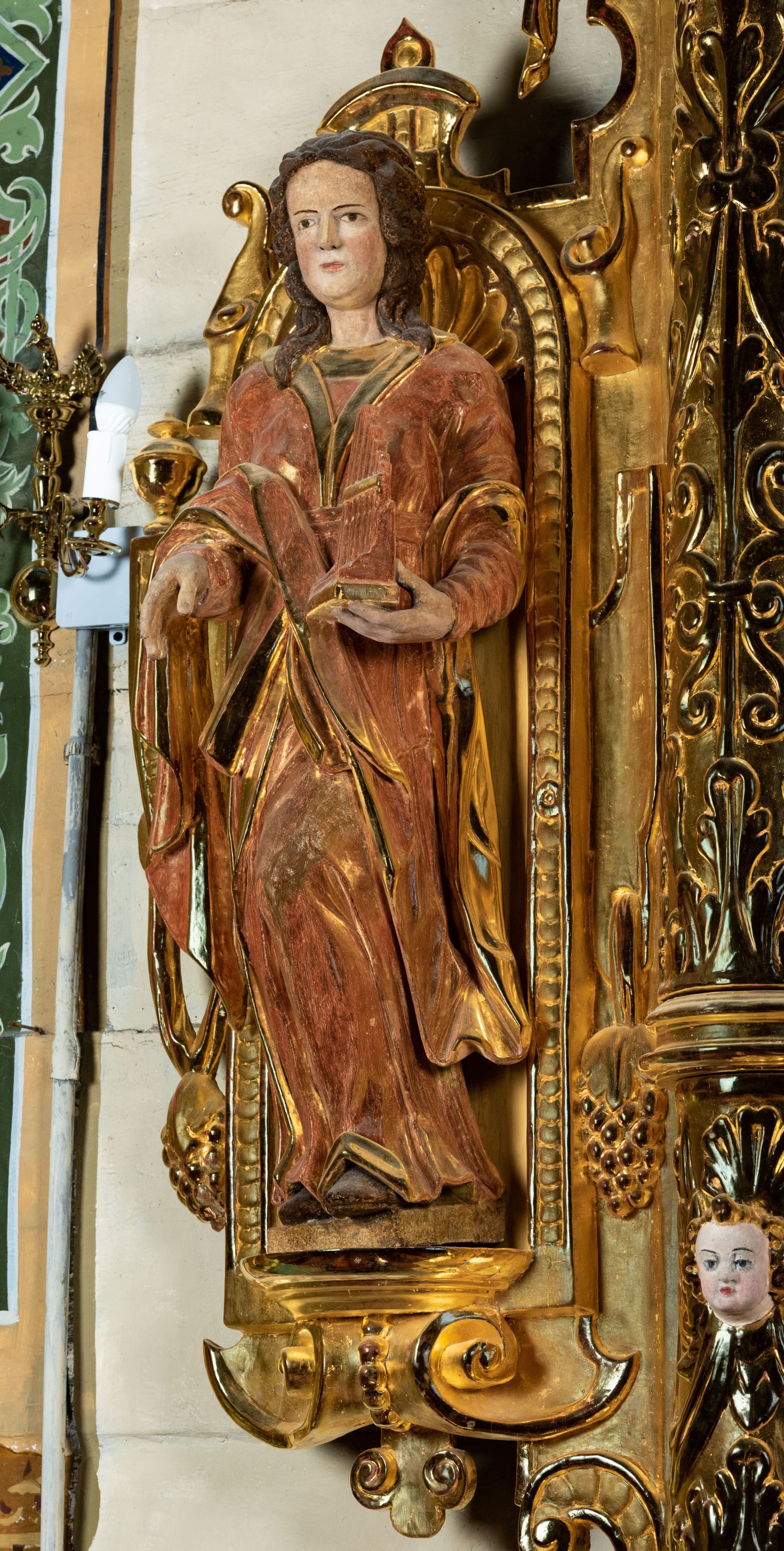 Sculpture of Saint Cecilia in the left surplus of the mannerist altar of Saint Nicholas with the statue of Saint Teresa of Ávila on the right are works of unidentified origin. It is certain that they are not elements of the original furnishings of this altar. They were placed there at an unspecified time, before 1833, replacing earlier, slightly smaller carved statues of saints. Both sculptures were created in the same, probably Lesser Poland, wood carving and sculpting workshop in the 17th century (after 1622, i.e. the date of canonization of Saint Teresa). In the church of the Visitation of the Blessed Virgin Mary in Paczółtowice they were first recorded in the temple's inventory in 1833. Born in the 3rd century in Rome, Saint Cecilia is the patron of church music. Her main attributes include musical instruments, as well as a sword and wreath of white and red roses referring to her innocence and martyr's death.wreath In the case of the sculpture in Paczółtowice, the saint was depicted as a young woman holding a portative in her hand, i.e. a small, portable pipe organ.