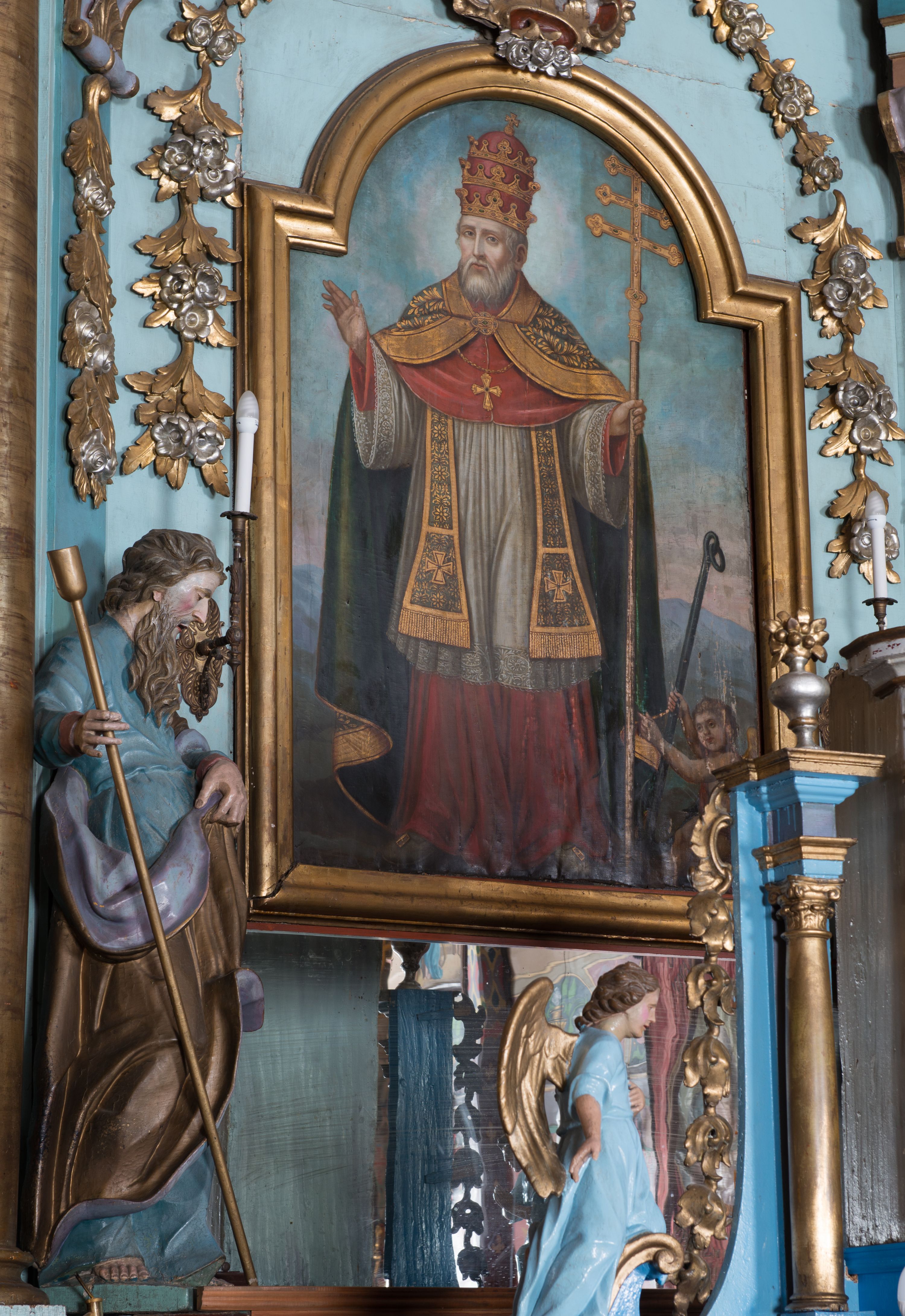 The painting of St. Clement of Rome was probably created in the first half of the 19th century and it was designed for the high altar. St. Clement of Rome was the third Pope after St. Peter (88-97). He is presented in attire in accordance with this dignity. According to reports, Emperor Trajan sent Clement into exile to Chersonesus (the Crimea) and then sentenced him to death by drowning in the Black Sea with the anchor around his neck, which is why it is his attribute.