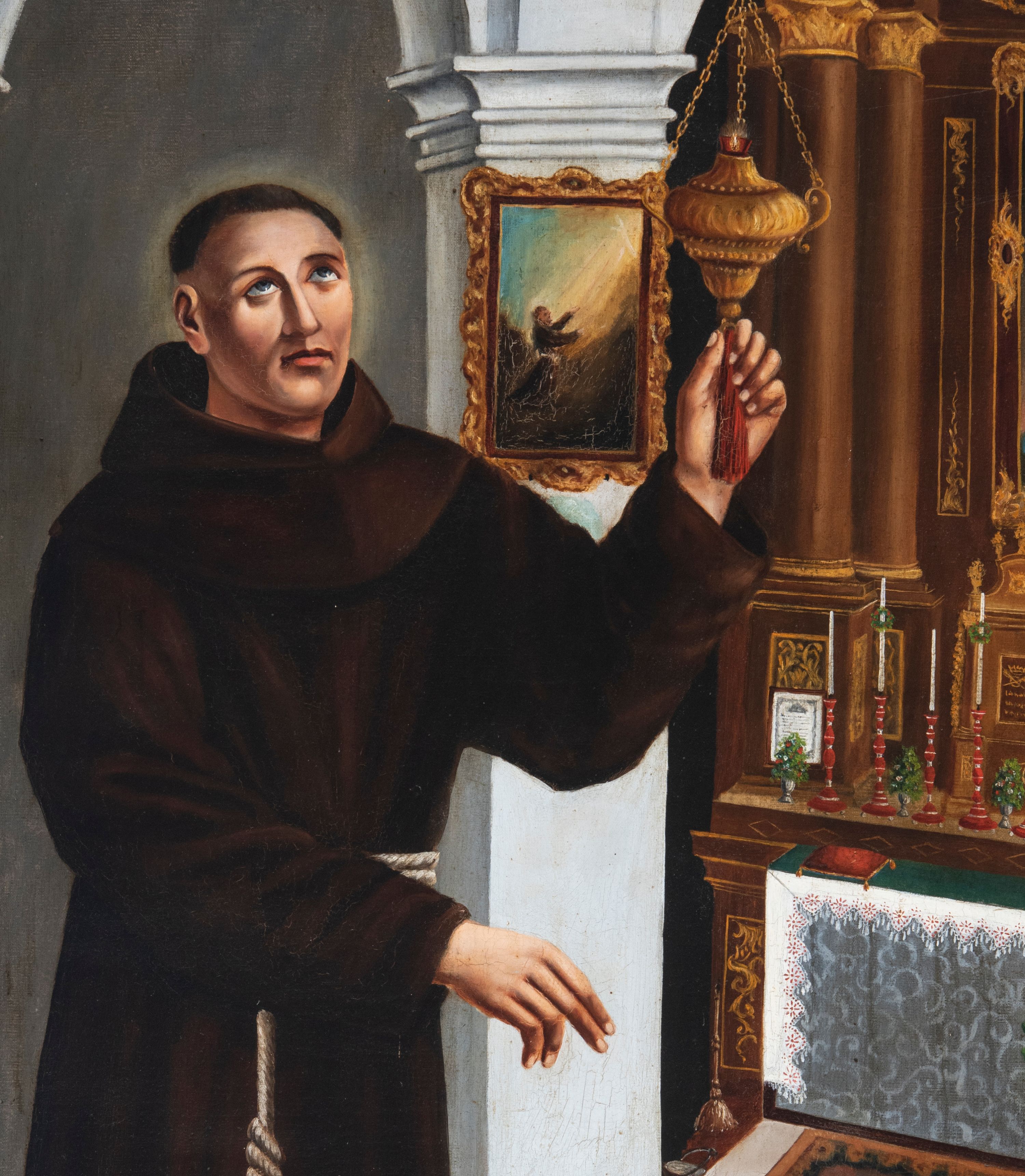 The painting located in the chapel erected in 1901 at the FPO Church in Kęty, depicts St. Didacus of Alcalá. The motif from the life of the Franciscan saint was painted in 1873 by his brother, Marcin Kowarz, a self-taught painter, who lived in Kęty.