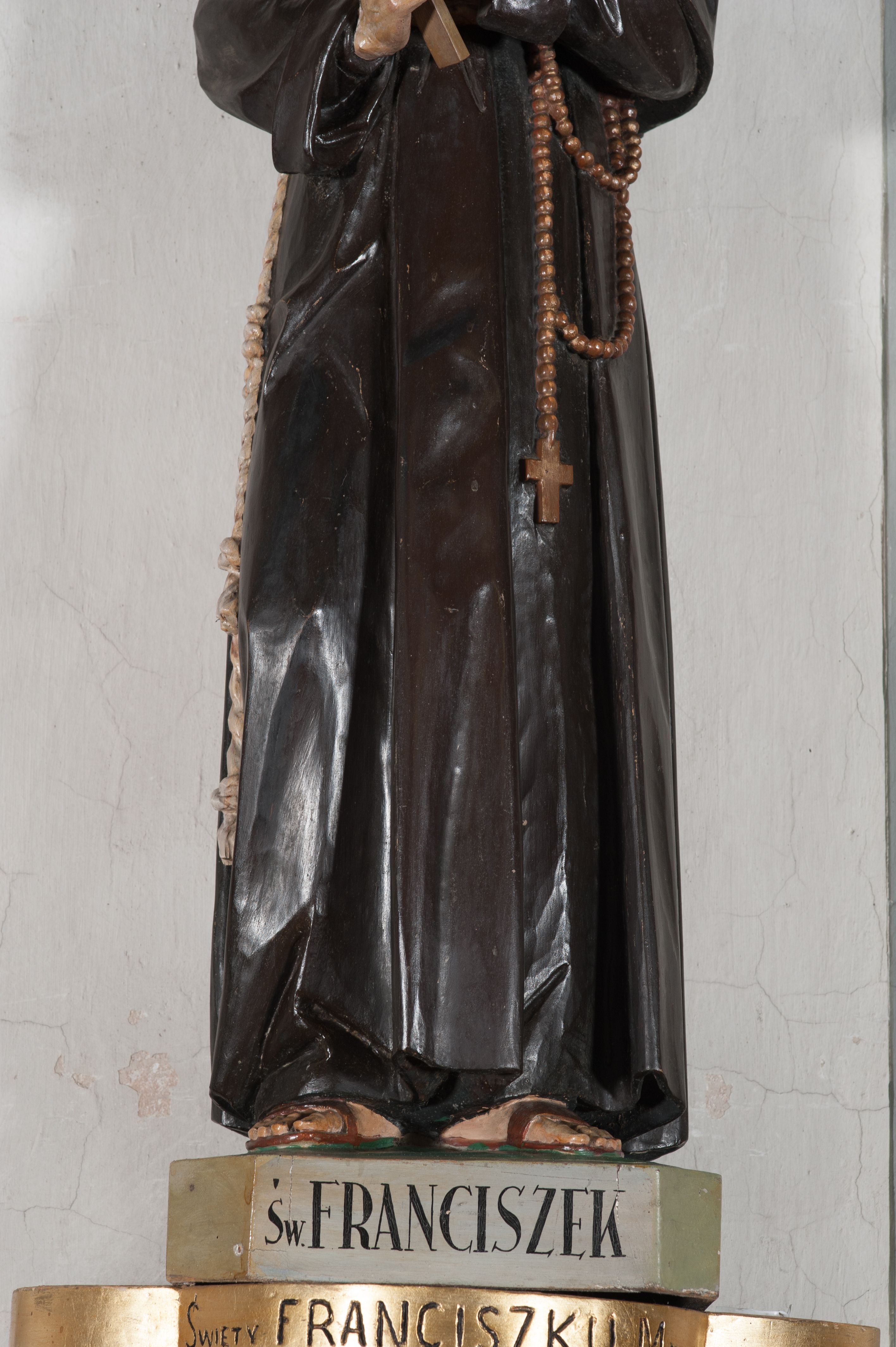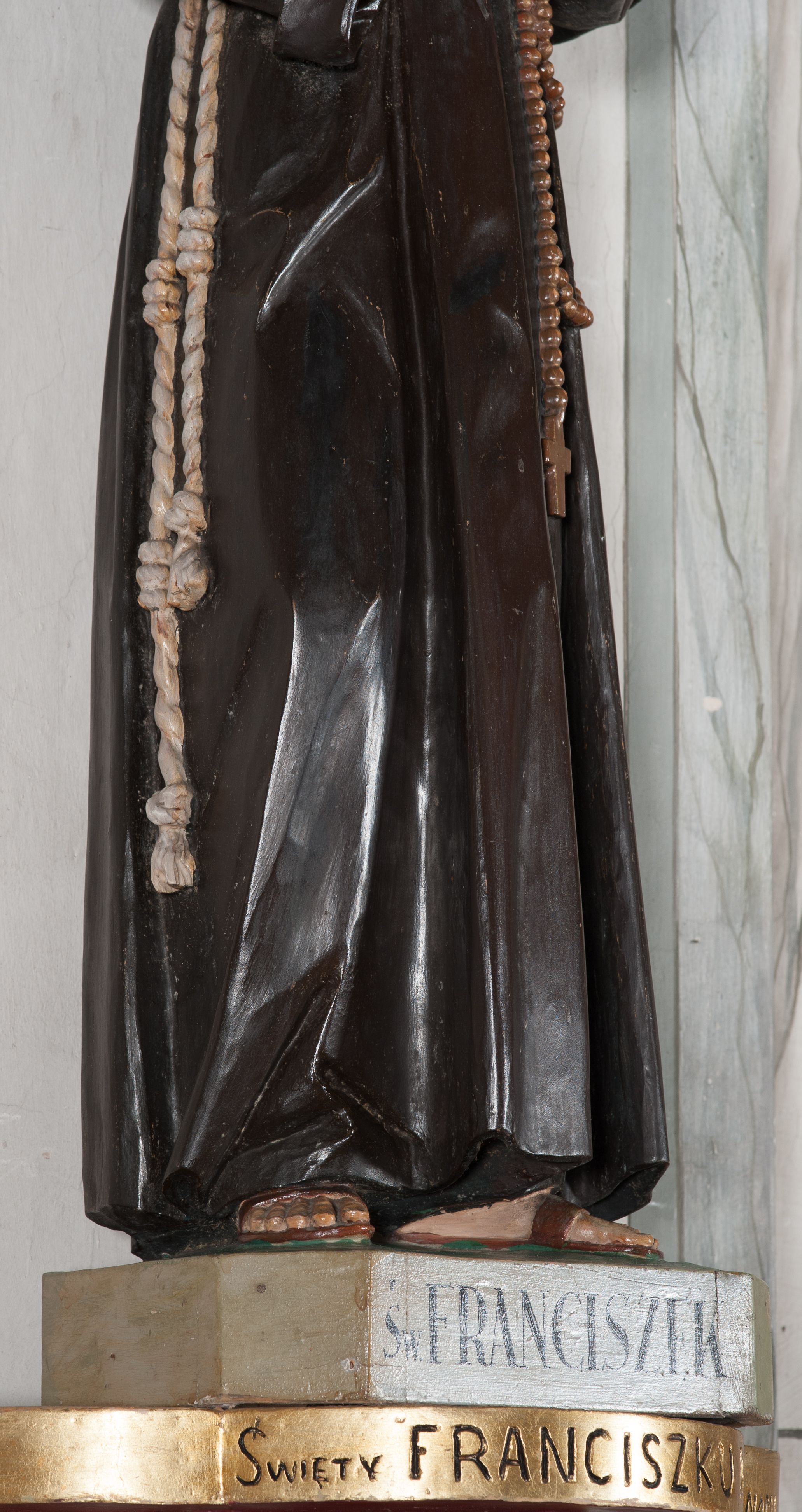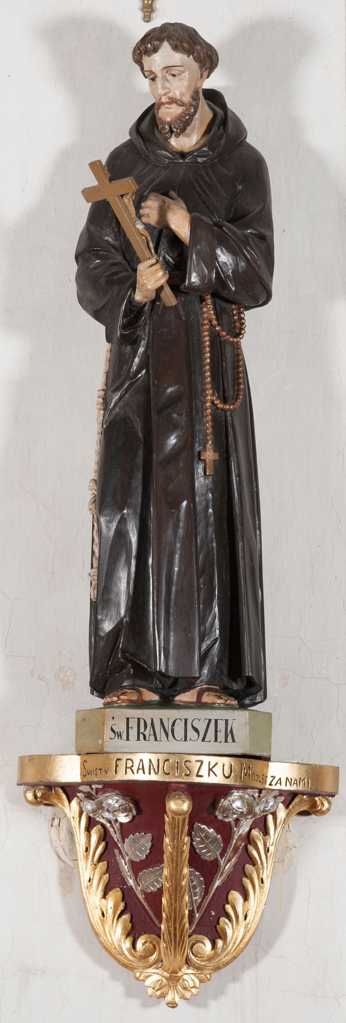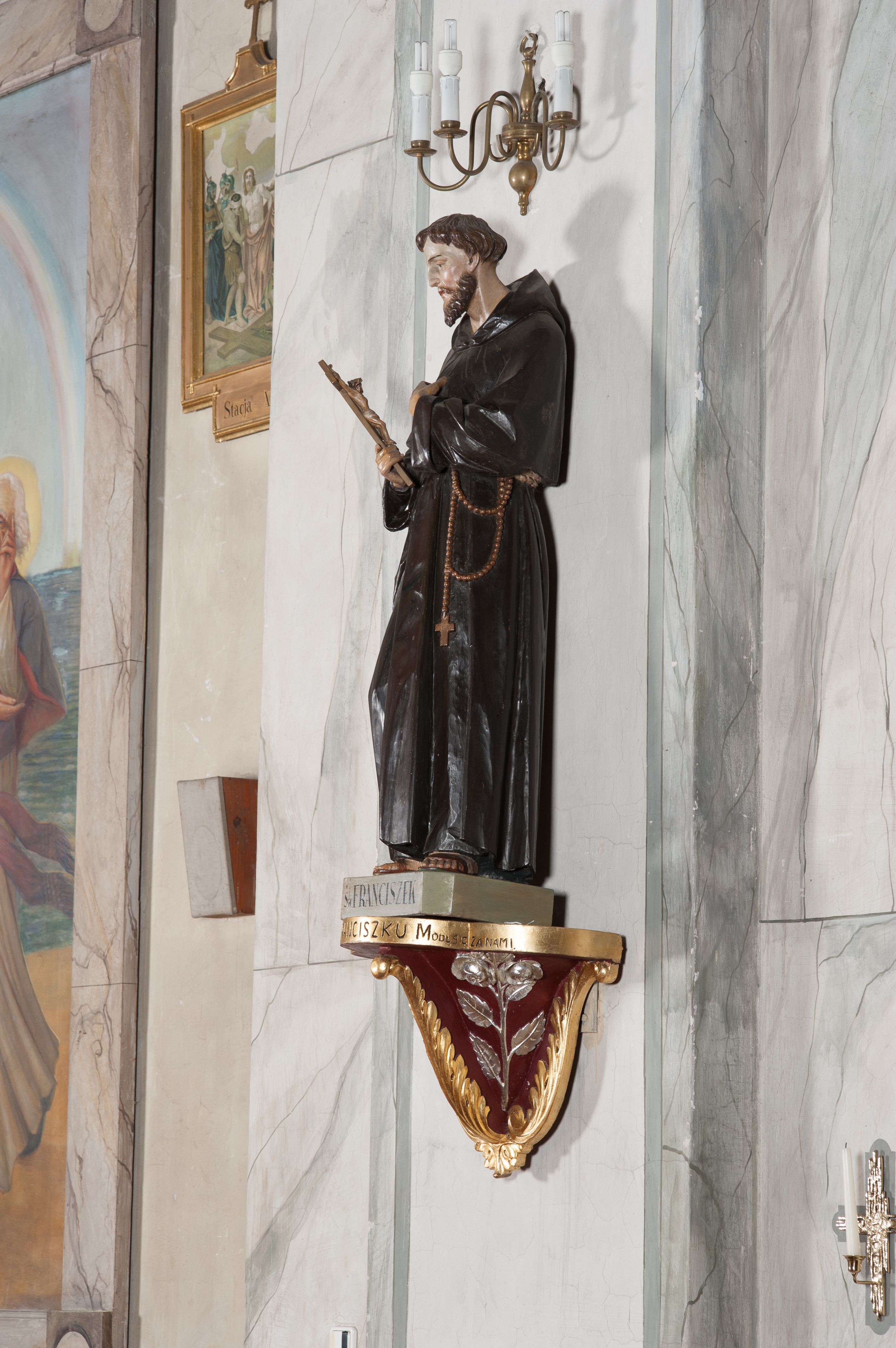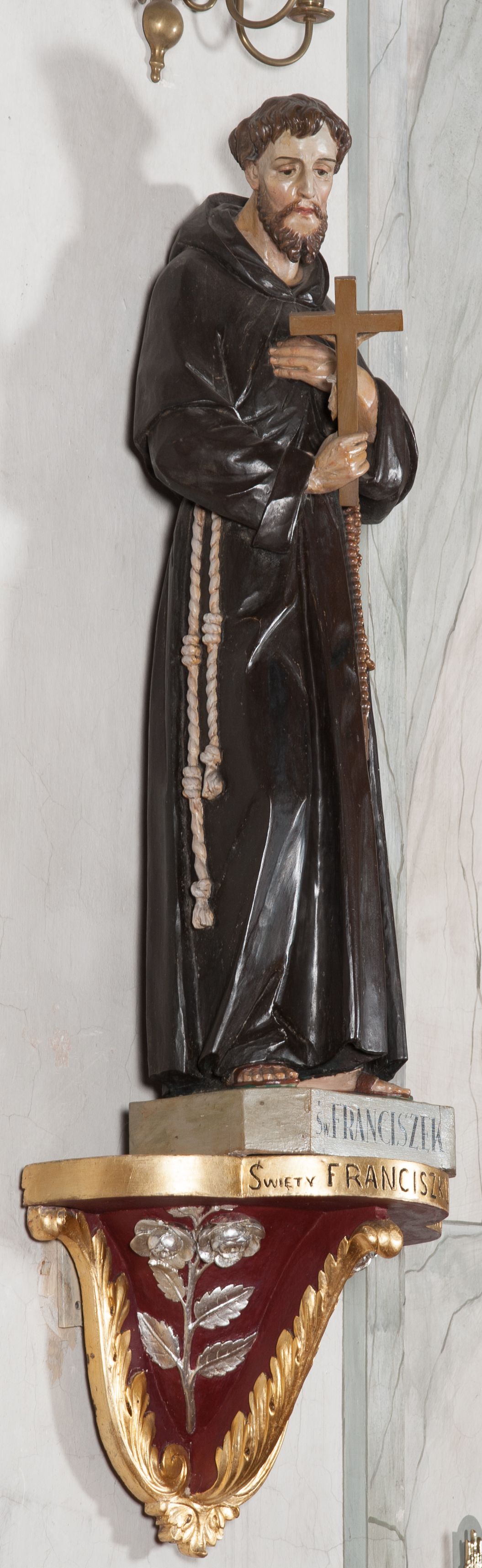 The sculpture was made in the early 1940s by Antoni Baran, an apprentice and collaborator of the Cracovian sculptor Wojciech Maciejowski. Antoni Baran is the only apprentice of Maciejowski known by name. He collaborated with his teacher, including at the restaurant of baroque furnishings of the Corpus Christi Church in Cracow, which began around 1939. In the early 1940s, the artists made many articles of furnishings for the church of Our Lady of Protection in Kamień. Antoni Baran worked mainly in wood and specialised in furnishing sacred interiors. Unlike his teacher's works, his works are characterised by a gentler folding of robes and a calmed expression. The sculpture depicts St. Francis of Assisi – a founder of the Franciscan order. In iconography he is depicted with a tonsure on his head, in a brown Franciscan habit wearing a girdle with three knots. In many images, also of the sculpture in question, he appeared with a crucifix in his hand. His attributes also include the skull - a symbol of penance and mortification, and stigmas.