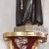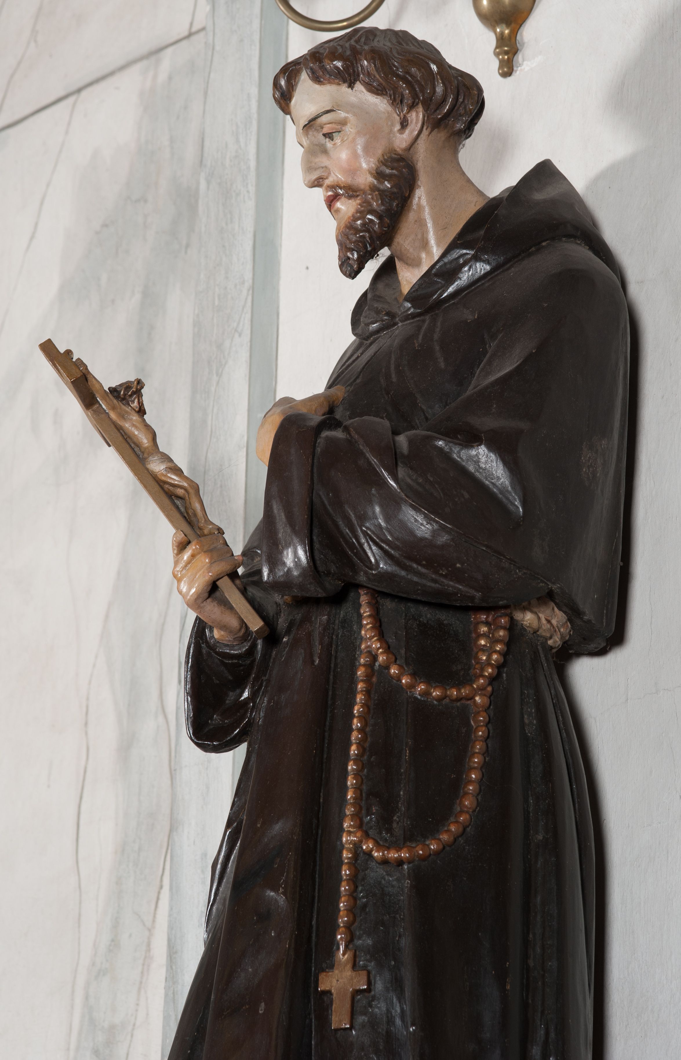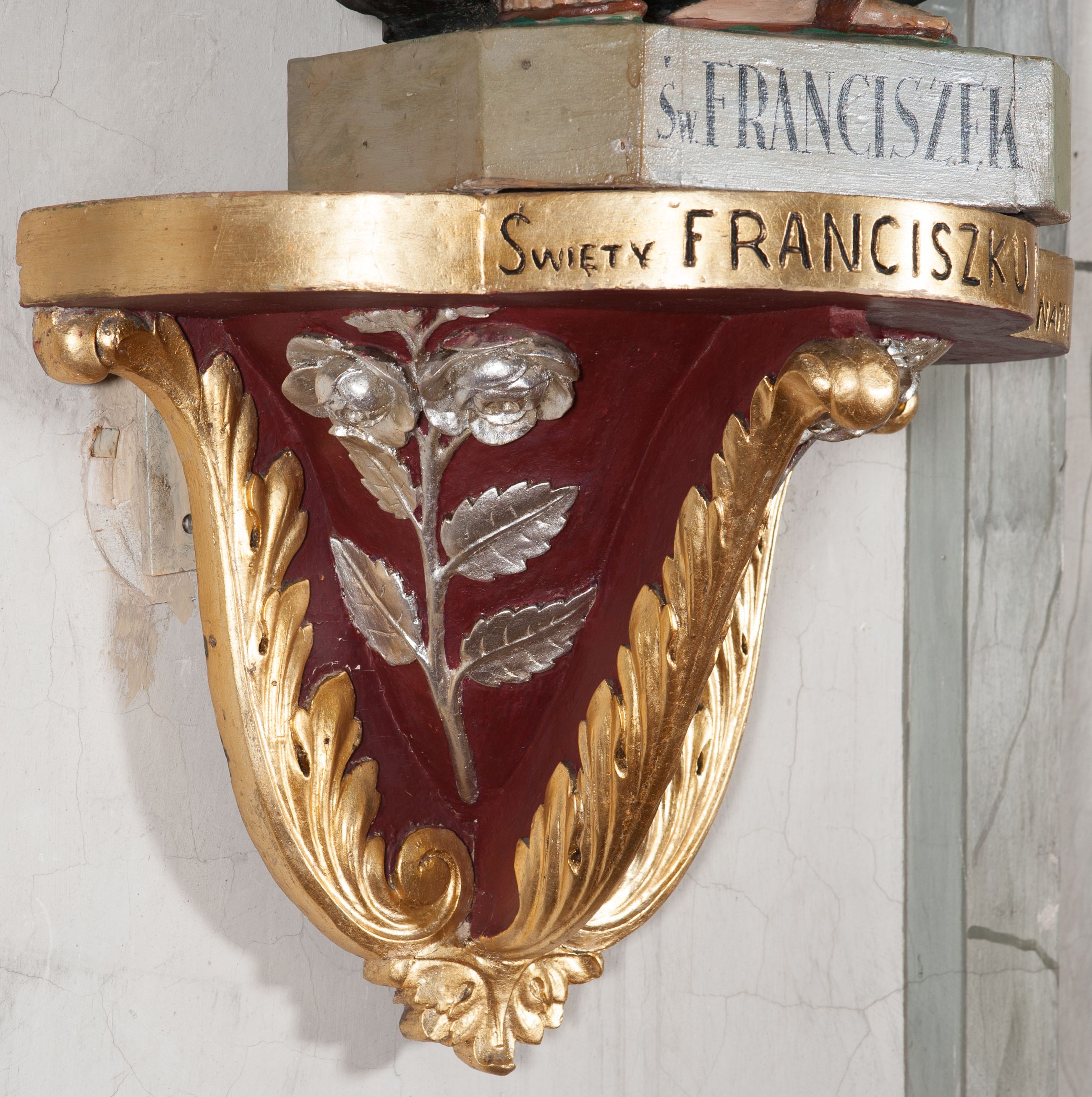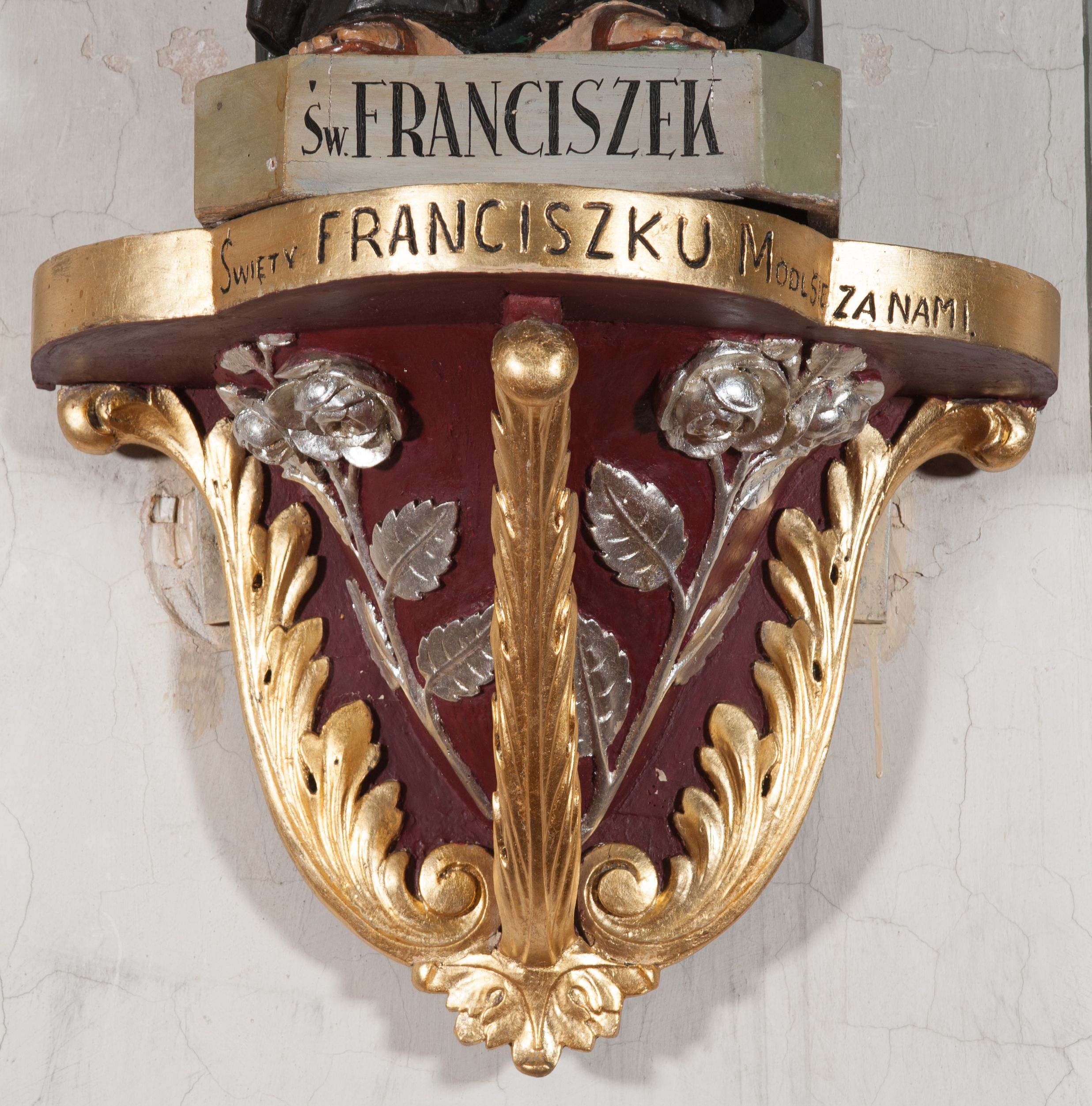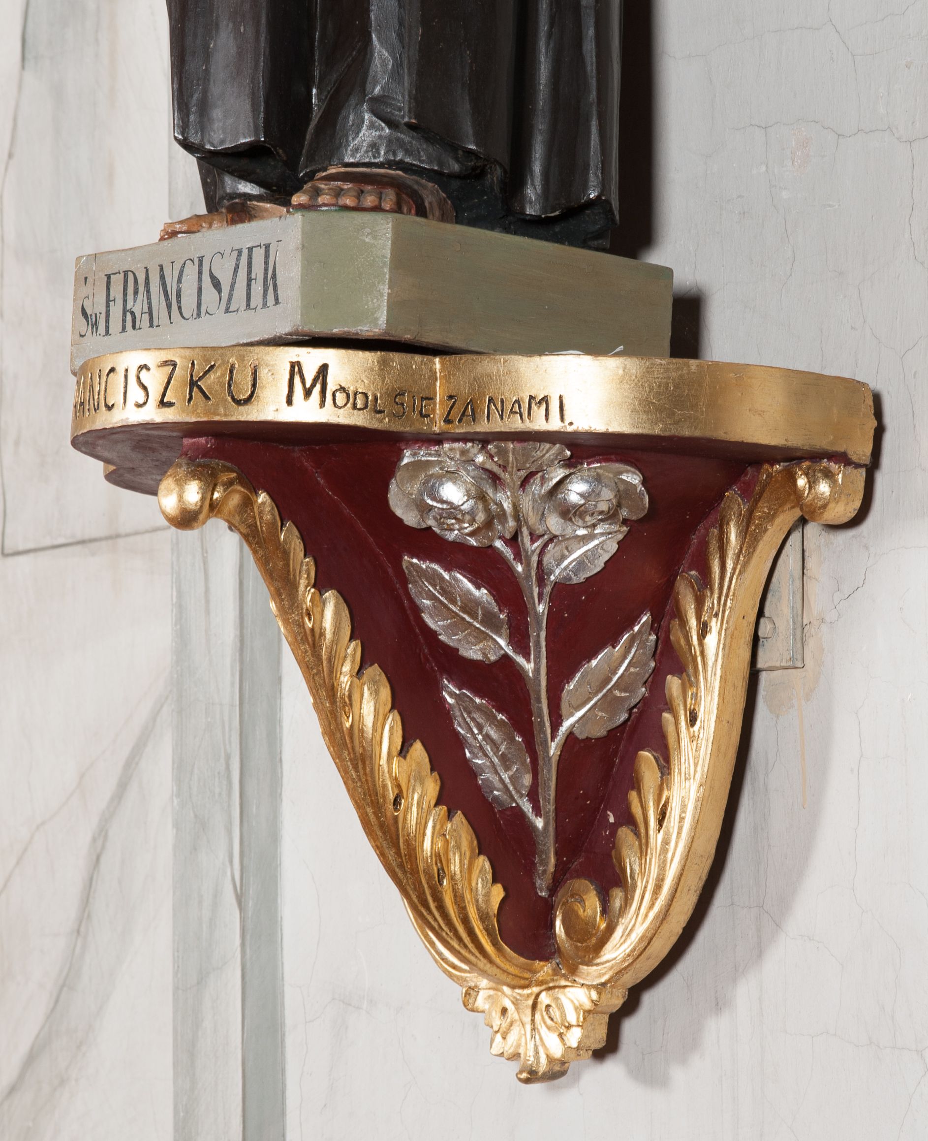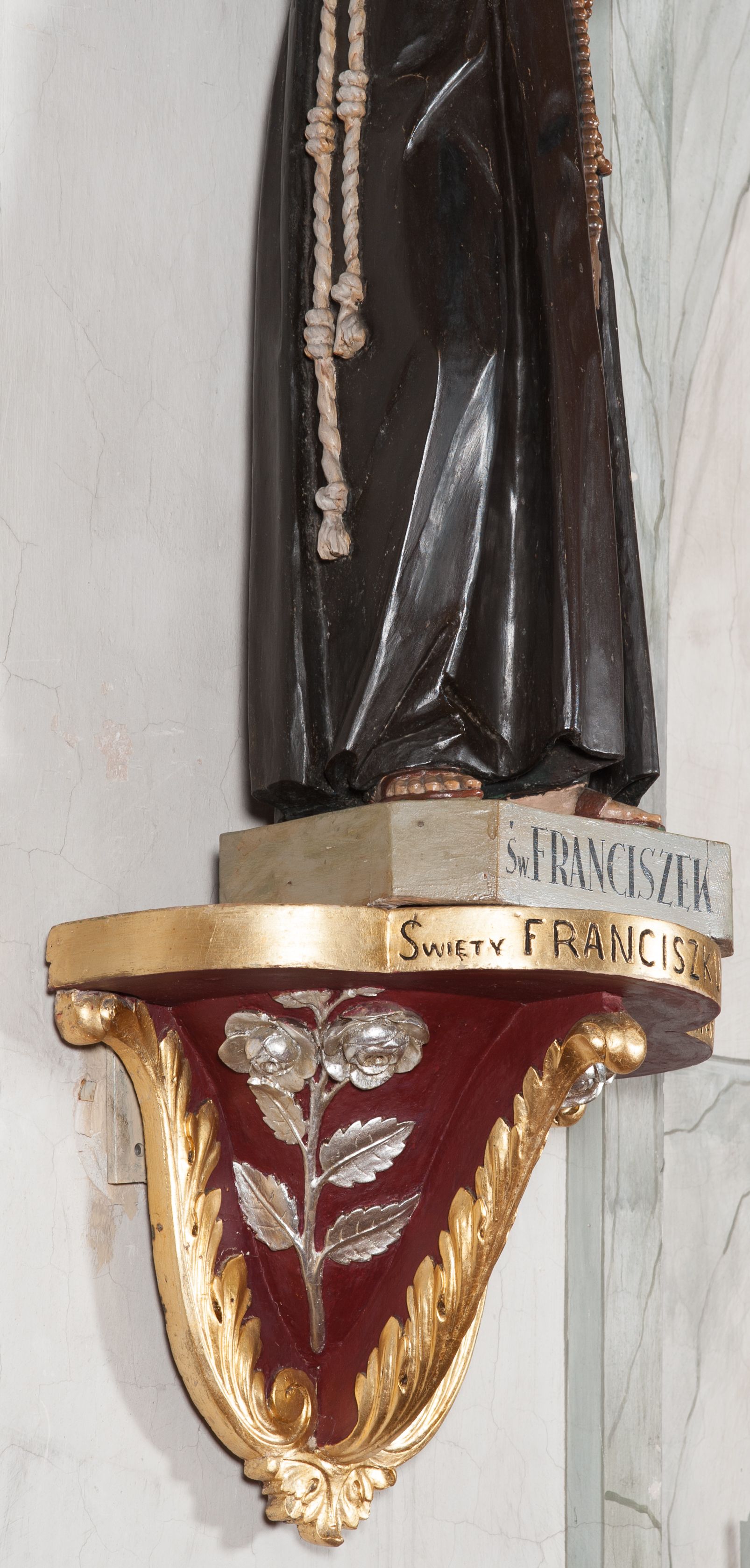 The sculpture was made in the early 1940s by Antoni Baran, an apprentice and collaborator of the Cracovian sculptor Wojciech Maciejowski. Antoni Baran is the only apprentice of Maciejowski known by name. He collaborated with his teacher, including at the restaurant of baroque furnishings of the Corpus Christi Church in Cracow, which began around 1939. In the early 1940s, the artists made many articles of furnishings for the church of Our Lady of Protection in Kamień. Antoni Baran worked mainly in wood and specialised in furnishing sacred interiors. Unlike his teacher's works, his works are characterised by a gentler folding of robes and a calmed expression. The sculpture depicts St. Francis of Assisi – a founder of the Franciscan order. In iconography he is depicted with a tonsure on his head, in a brown Franciscan habit wearing a girdle with three knots. In many images, also of the sculpture in question, he appeared with a crucifix in his hand. His attributes also include the skull - a symbol of penance and mortification, and stigmas.