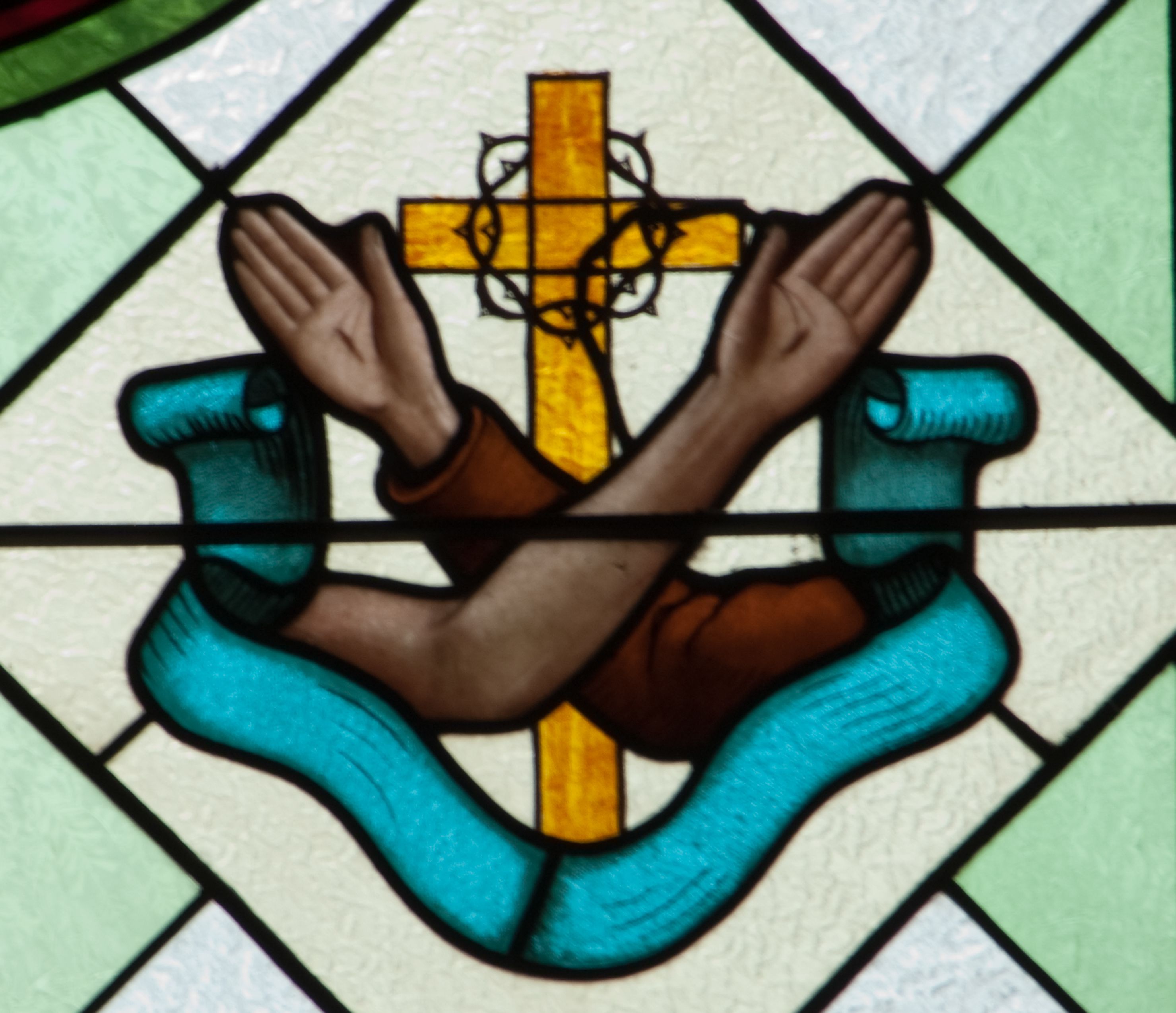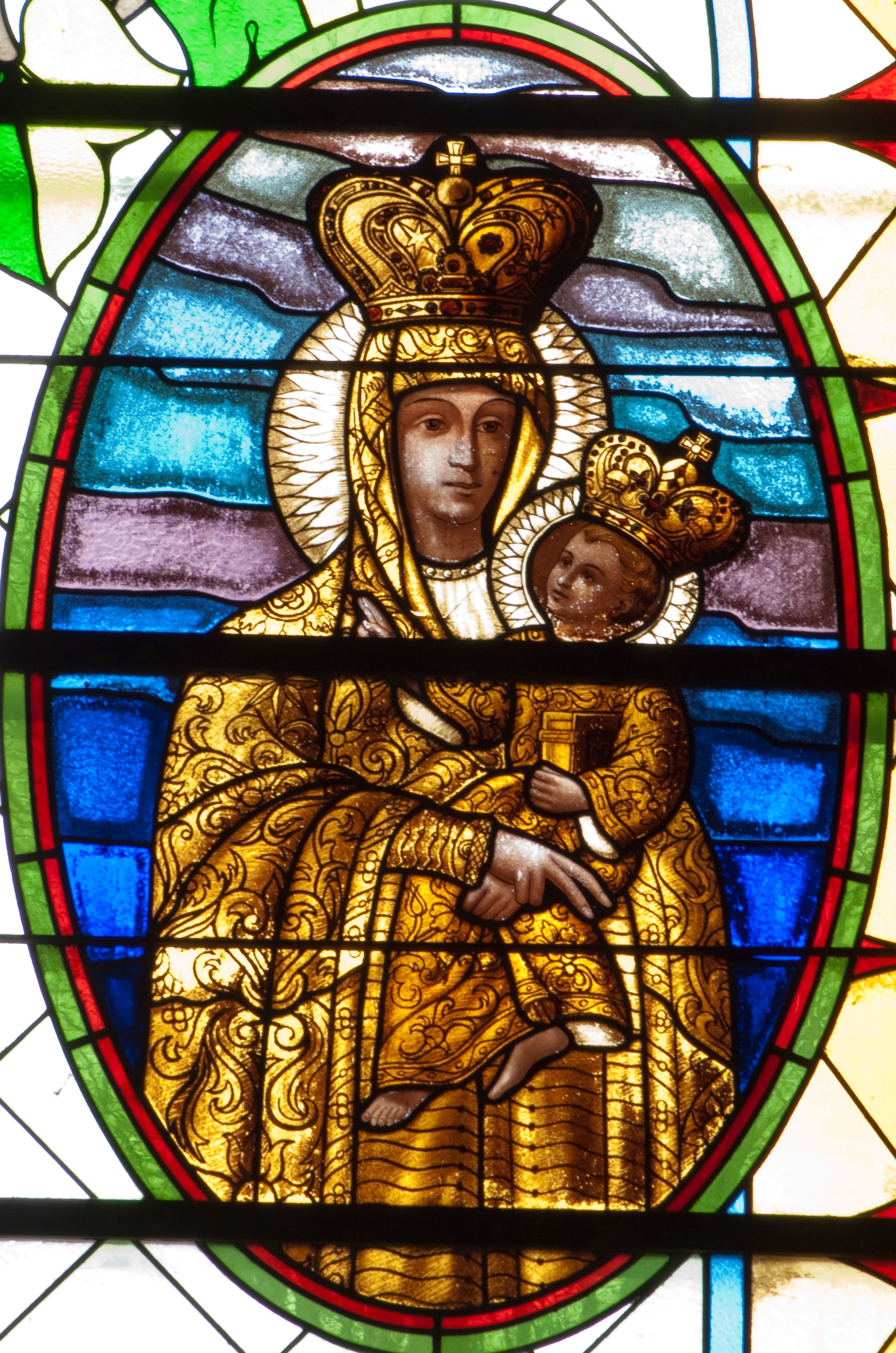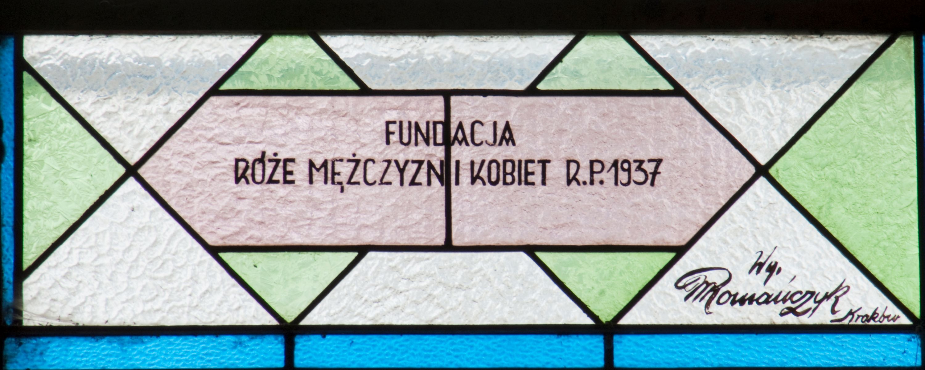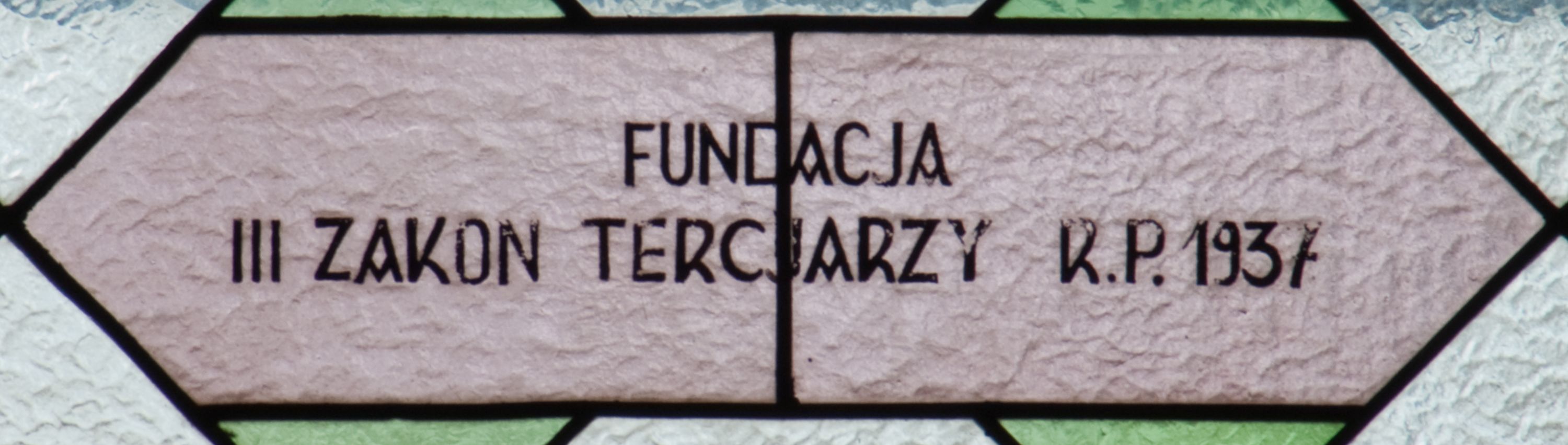 The stained glass was made in 1937 in a workshop carried out by Maksymilian Romańczyk at the following street: św. Jana 30, in Cracow. According to the inscription, placed at the lower part of a stained glass window, the work was funded by members of the Third Order of St. Francis (Tertiaries) and the men and women of the parish in Zabierzów Bocheński. The figures in the composition depict St. Francis of Assisi and Our Lady of the Snows. The image of St. Francis refers to the funders of stained glass windows - Third Order Franciscans, which is informed by the emblem of the Third Order of St. Francis, placed below the medallion. On the contrary, depiction of the Virgin Mary, funded by parishioners of Zabierzów, is a reproduction of the miraculous image of Our Lady of the Snows, also known as "Salus Populi Romani" (in italian Salvation of the Roman People), located in the Basilica di Santa Maria Maggiore in Rome.