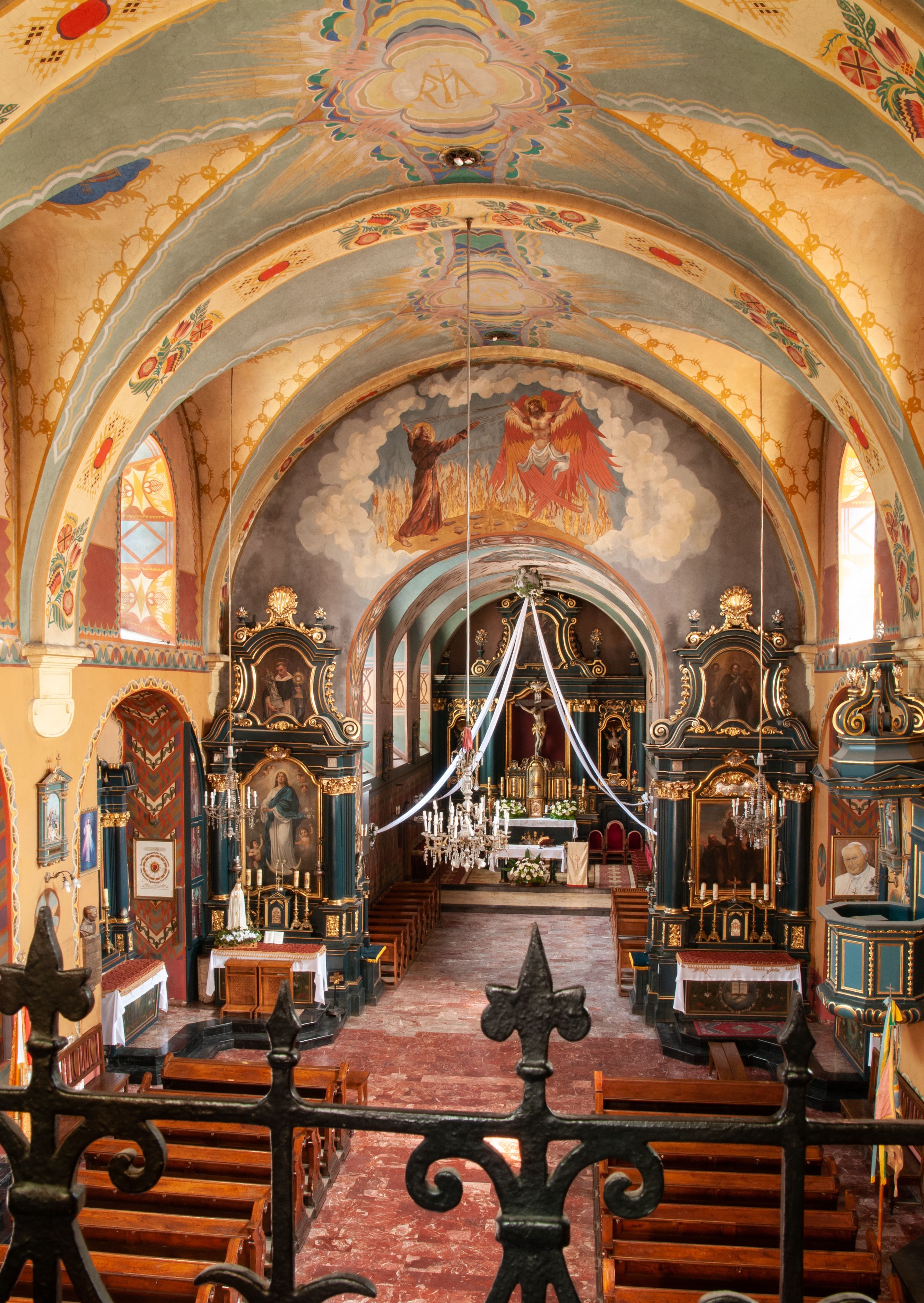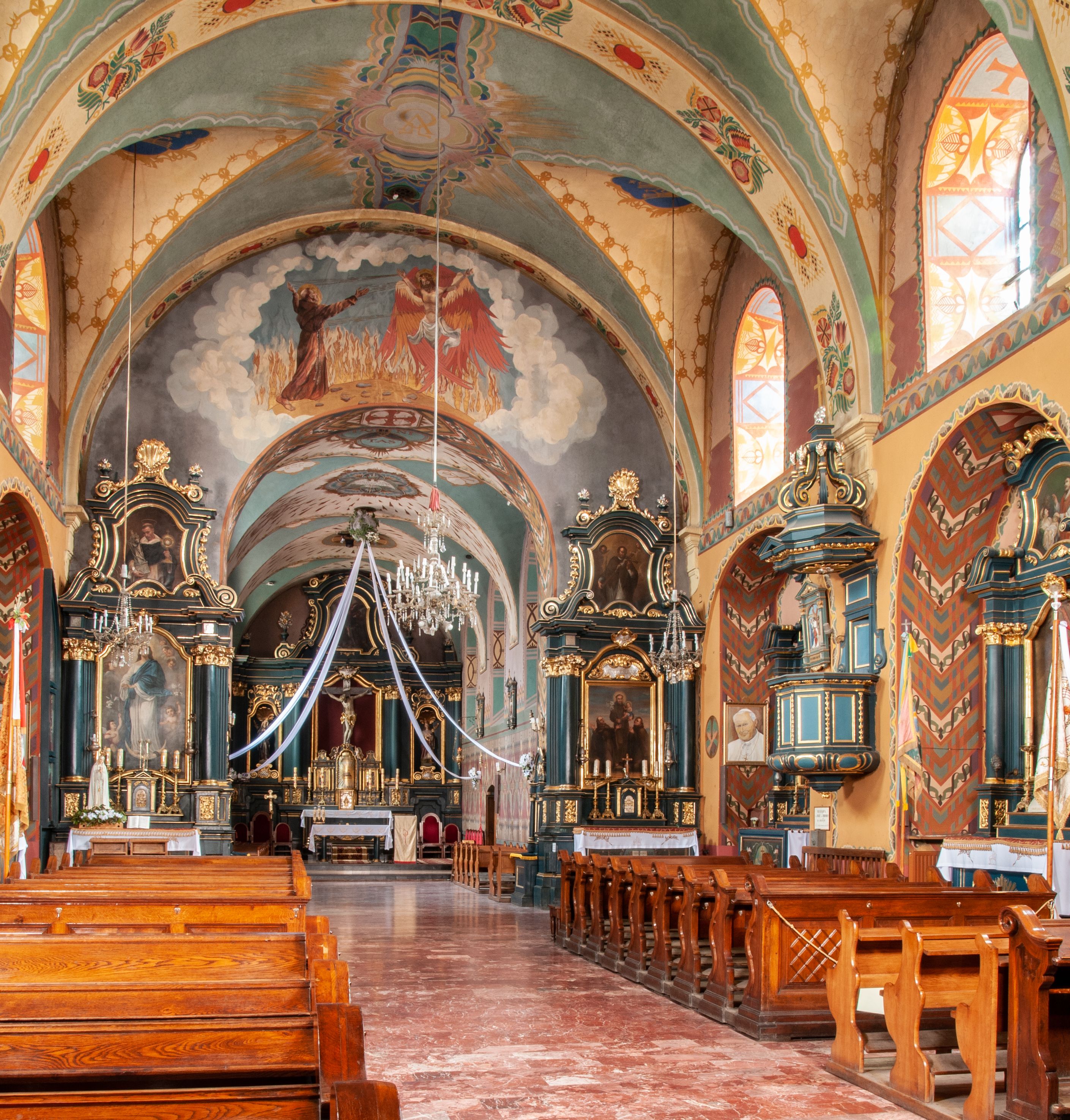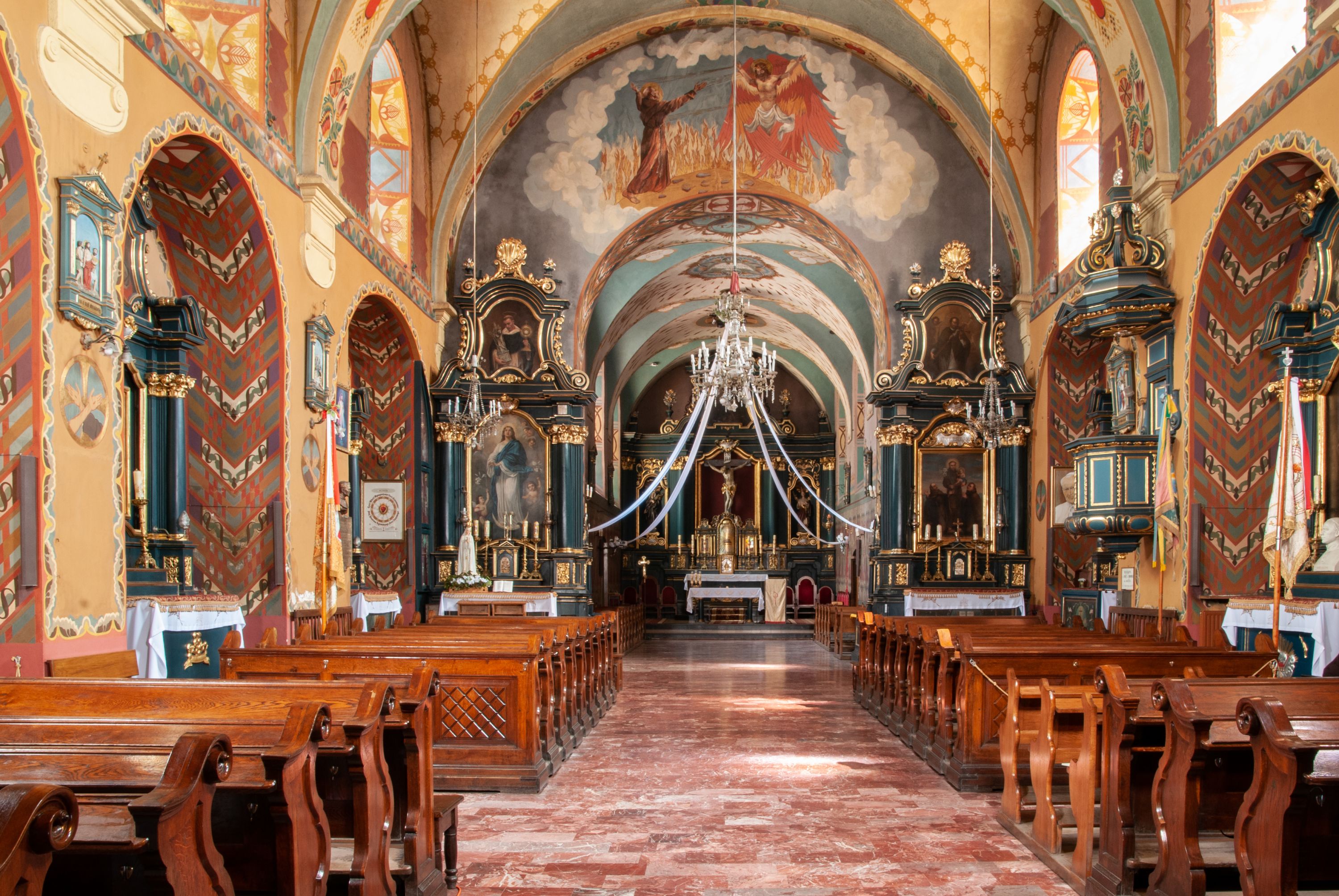 The church and monastery of Reformed Fransciscans in Wieliczka were funded by the Wieliczka council members, the management of the salt mines and king Sigmunt III. The works started in 1624 and were completed in 1626. The church was consecrated the same year, under the invocation of St. Francis of Assisi's Stigmas. The temple is a representative type of Baroque architecture solutions, implemented in a group of monastery Franciscan churches spread all over the region of Lesser Poland. Therefore, the architecture of the church is distinguished by its adaptation to the monasterial charisma, expressed by simplicity and modesty. The monks adopted a single-nave structure as the dominant type, with a narrower and extended chancel, enclosed with a straight wall and separated with a high altar. The chancel extension houses a monastic choir which was liquidated in the church in Wieliczka, and the high altar was moved towards the chancel wall. The church in Wieliczka has been recurrently referred to as a model for all reformation churches. The church furnishings (six side altars, high altar and a pulpit) was created after the fire of 1718. Special attention should be paid to: a painting created by Szymon Czechowicz, titled "St. Casimir Jagiellon", pieces created by Michał Stachowicz whose numerous works decorate altars in the church, and a painting of Our Lady of Graces which is currently presented in the chapel built in 1989-1990. According to the Franciscan tradition, the image is older than the very monastery complex and originates in a chapel dedicated to St. Anthony of Padua, the patron of miners. The painting of Virgin Mary was apparently left by Balkan or Italian merchants who presented it to local miners in exchange for salt. One of the characteristic features of the church in Wieliczka is its relationship with the miners who not only funded it, but contributed to the funding of the altars and the paintings. Many images of Saint patrons, placed on the altars, are Saints who have been glorified by miners themselves, such as St. Kinga of Poland, St. Barbara, or St. Anthony of Padua. The Madonna of Częstochowa painting originally came from the Wieliczka mine, where it was placed on the side, altar and transferred from one of the mine's shaft bottoms.
