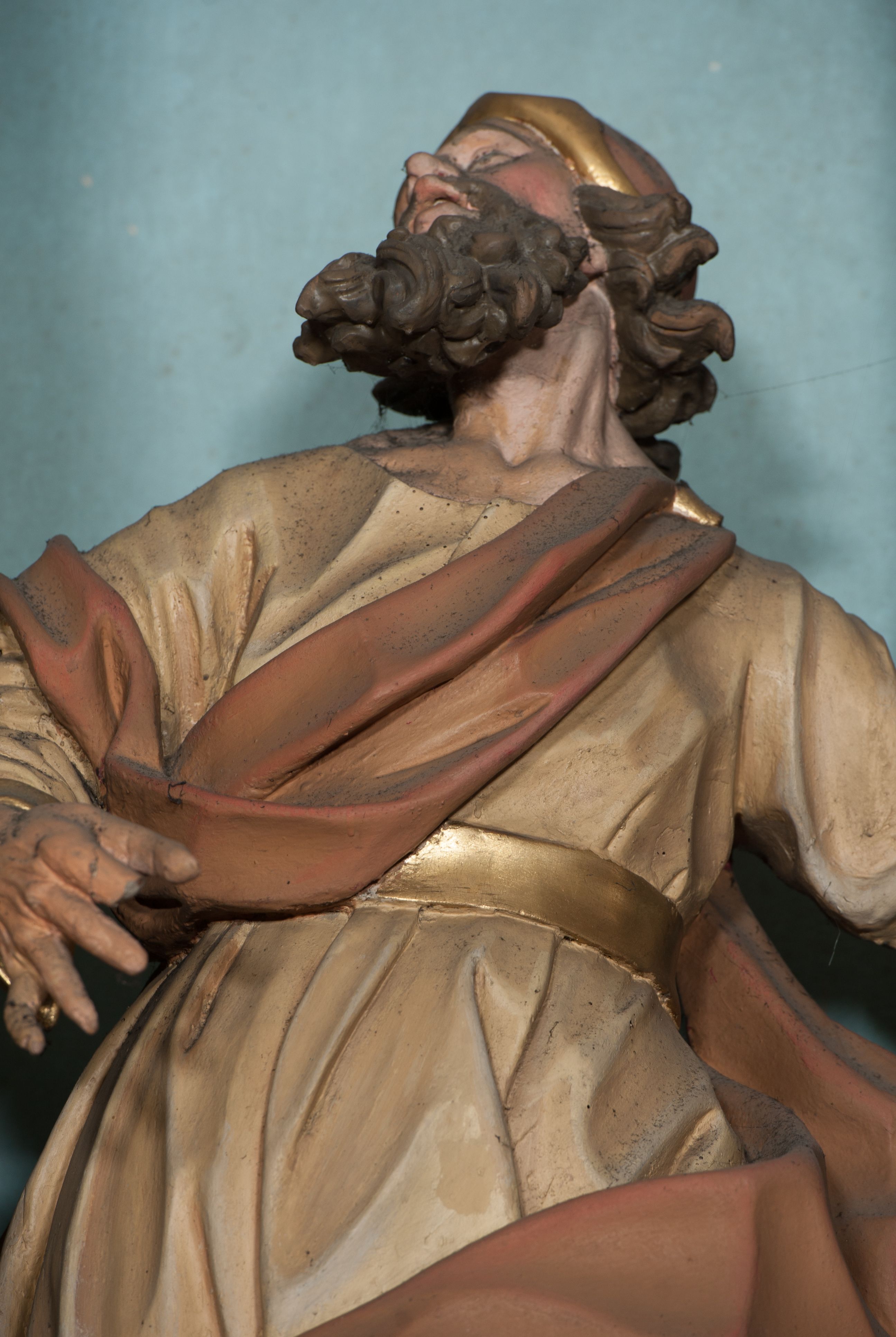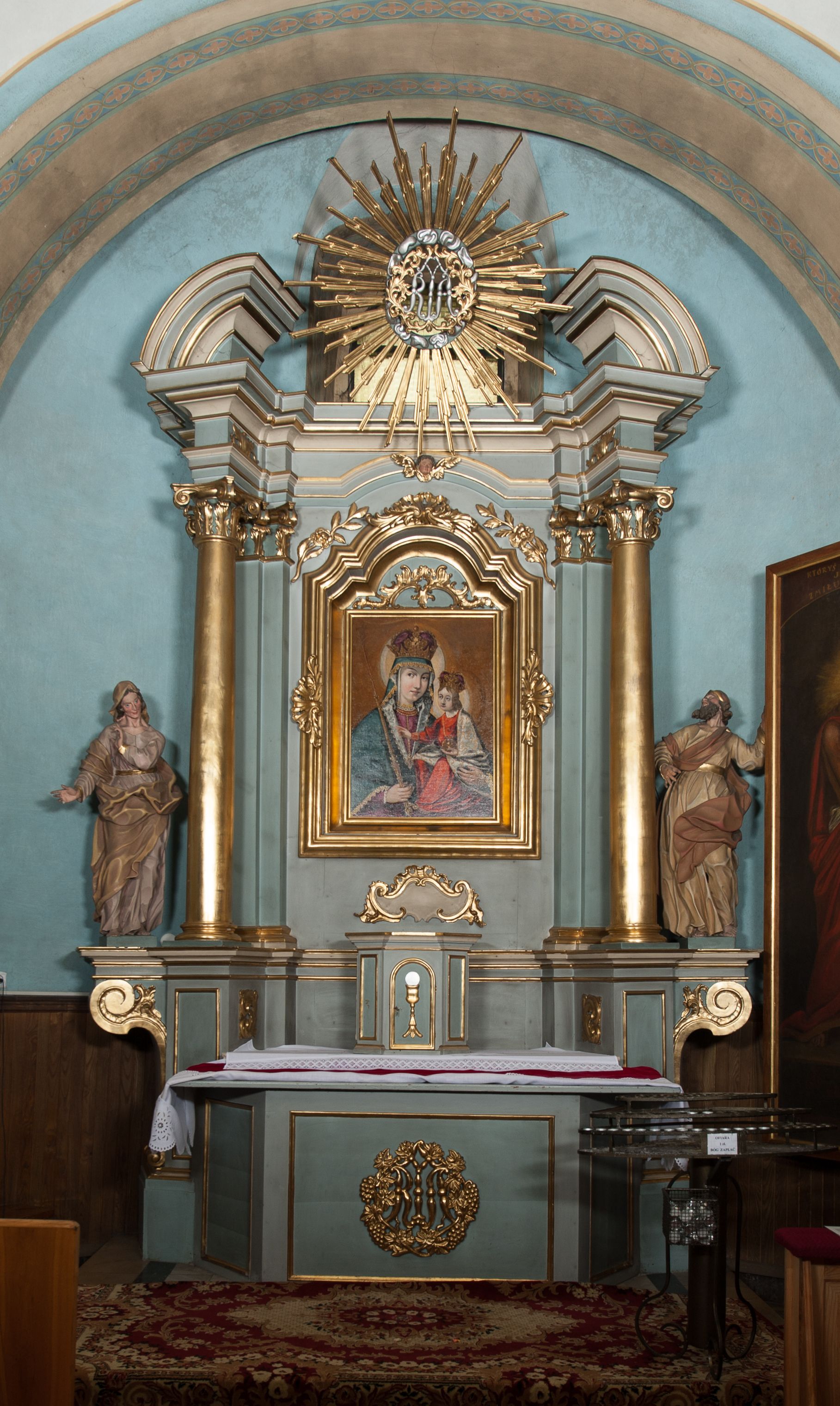The altar for the chapel of the Virgin Mary, together with statues of St. Anne and St. Joachim, was built before 1765. Most likely it was made in the workshop of the Kornecki family of Gdów. The statue is closely related to the iconographic programme of the altar centered around the statue of Mary, whose image is presented in the main area. Saint Joachim was portrayed as a mature or elderly man, because thanks to his prayers and fasting in the wilderness, he became a father of a child – Mary – in old age (according to tradition). He is usually depicted in the company of his wife – St. Anne.