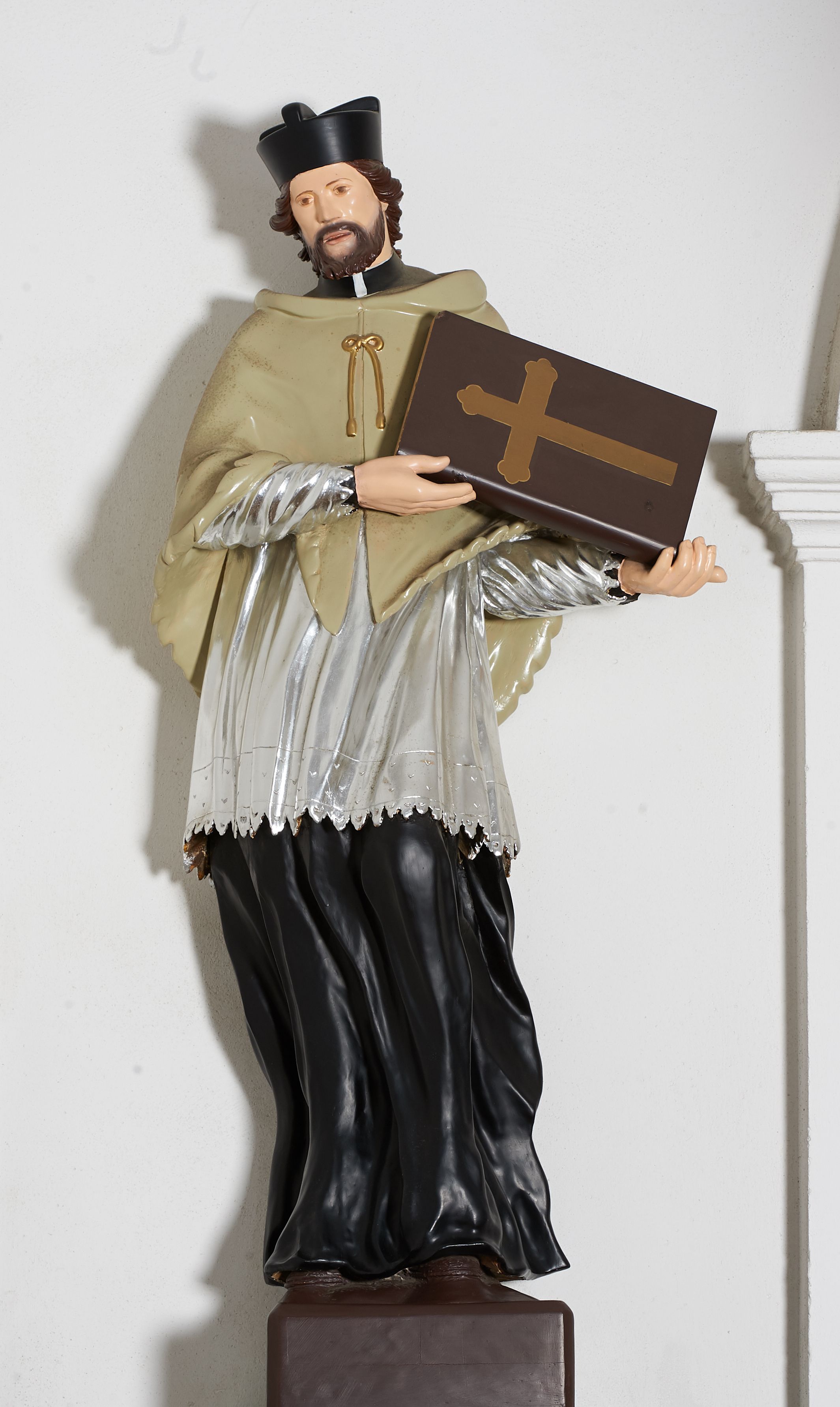 The statue was most likely made in 19th century. Saint John of Nepomuk was a canon of the Collegiate Church of St. Giles in Prague, which is why he is portrayed in attire corresponding to this position. The position of the arms of the statue in question shows that its hands probably held the crucifix, which is an attribute of the saint, instead of holding a book.