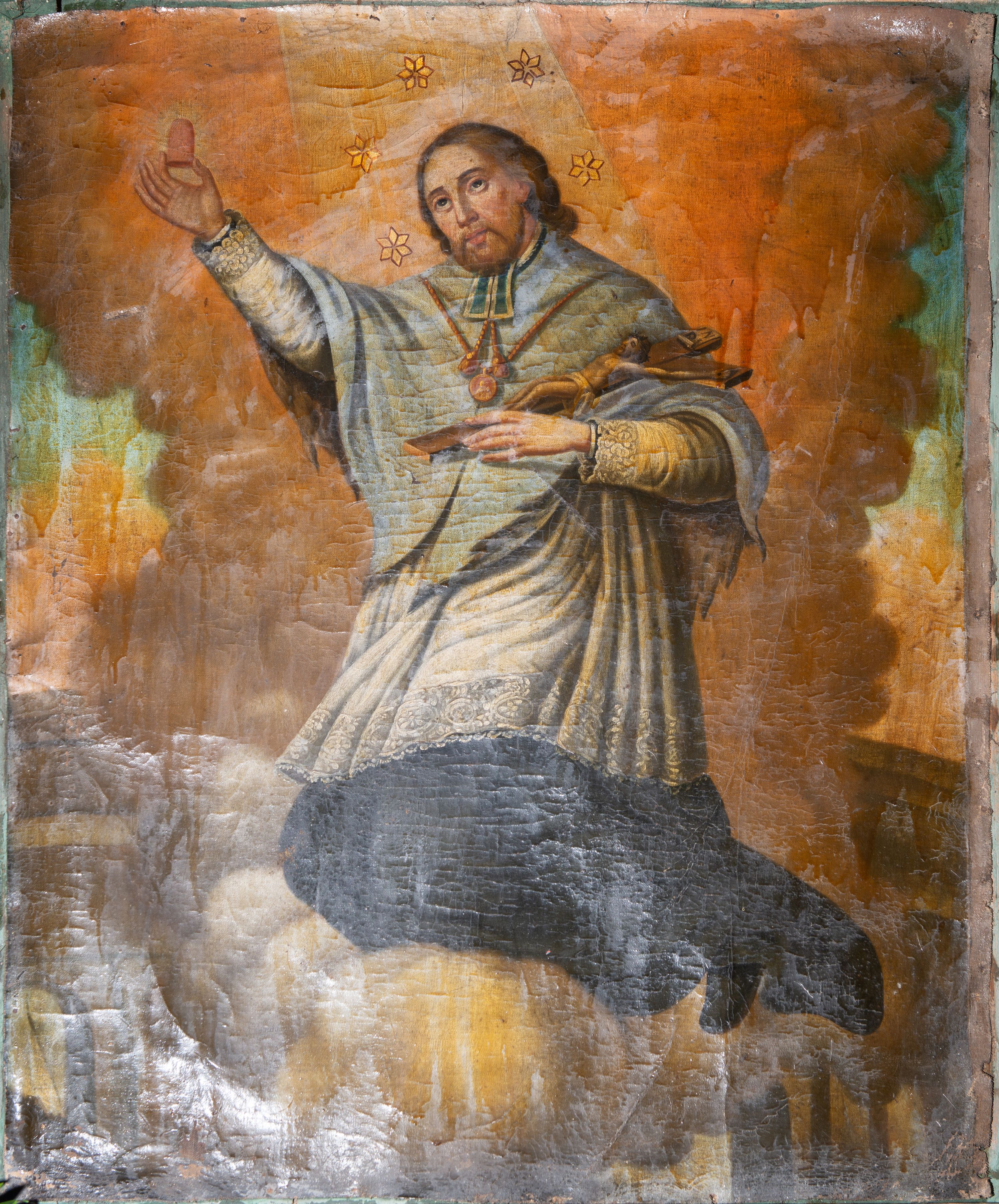 Picture of St. John of Nepomuk was painted in the 18th century. Unfortunately the author remains unknown. The central part of the composition presents St. John of Nepomuk who was a canon at St. Giles Collegiate Church in Prague. Thus, in the picture he is presented in attire in accordance with this dignity. The cross which he hold in his hand reminds of his special reverence for Christ Crucified.