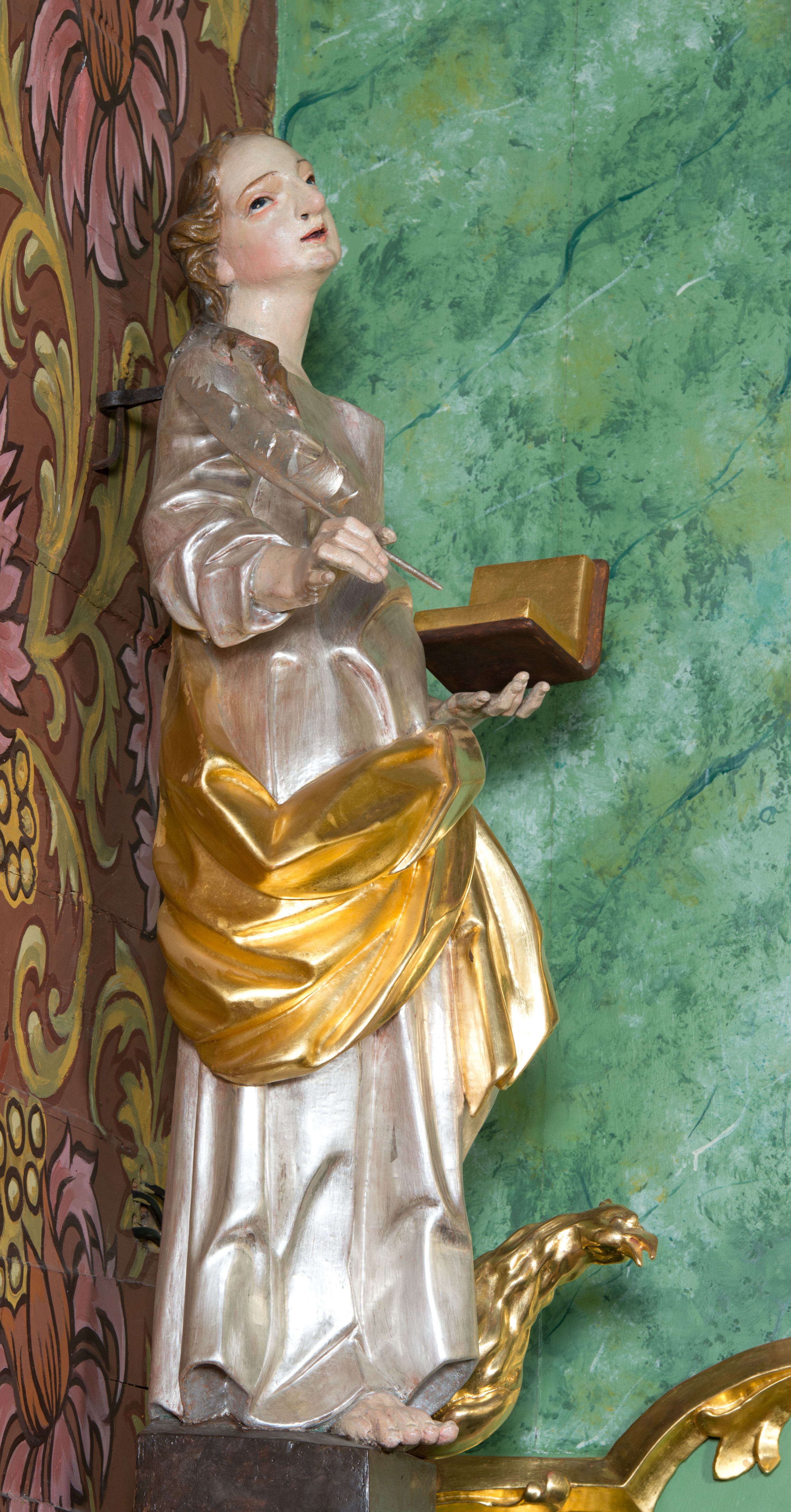 The sculpture depicting Saint John the Evangelist was made before 1773 by Kežmarok sculptor Johann Feeg. The characters of his authorship can be recognised by the characteristic features of the face and the way the folded robes are shown.