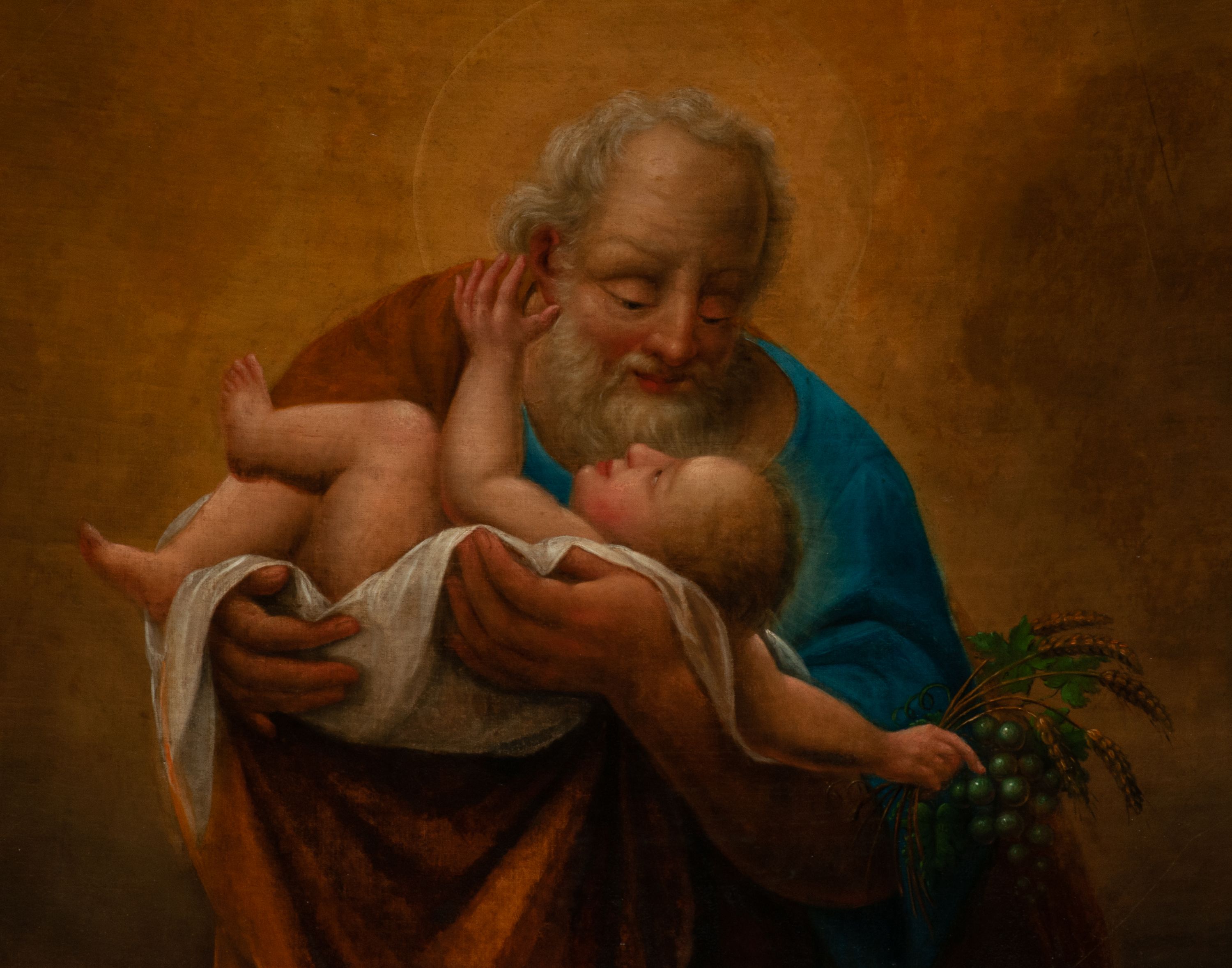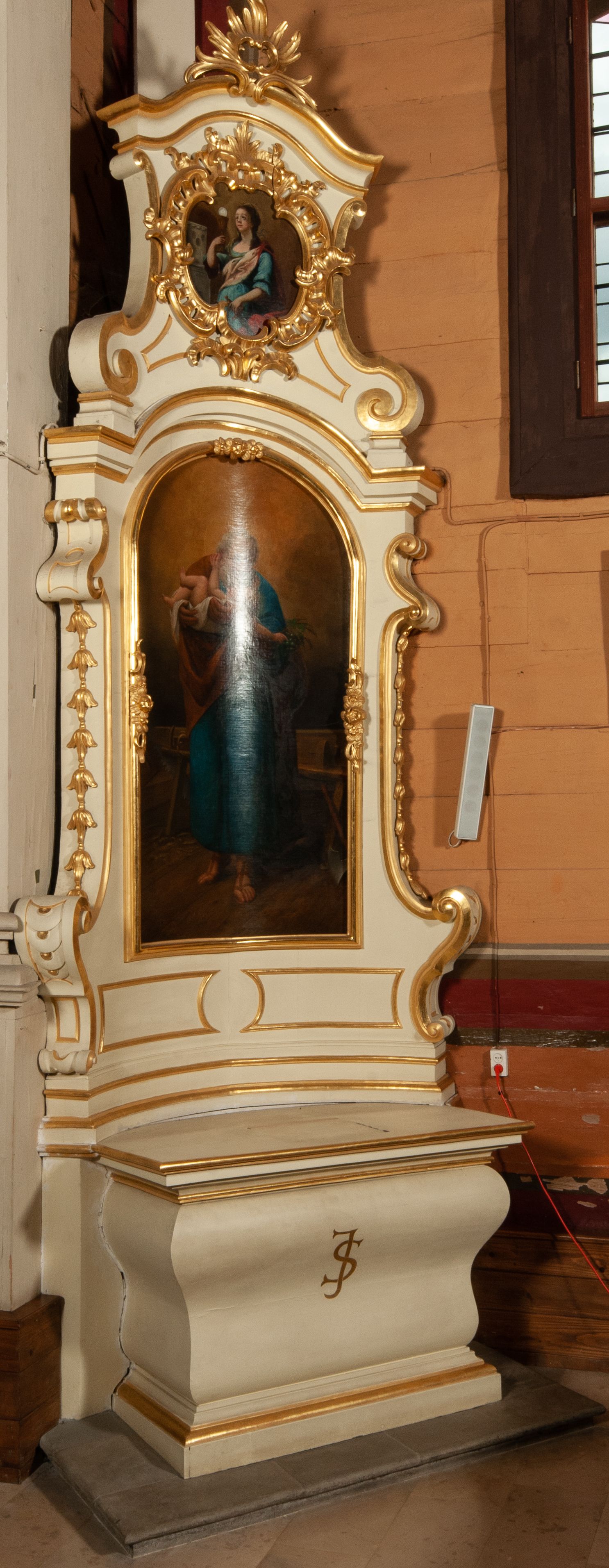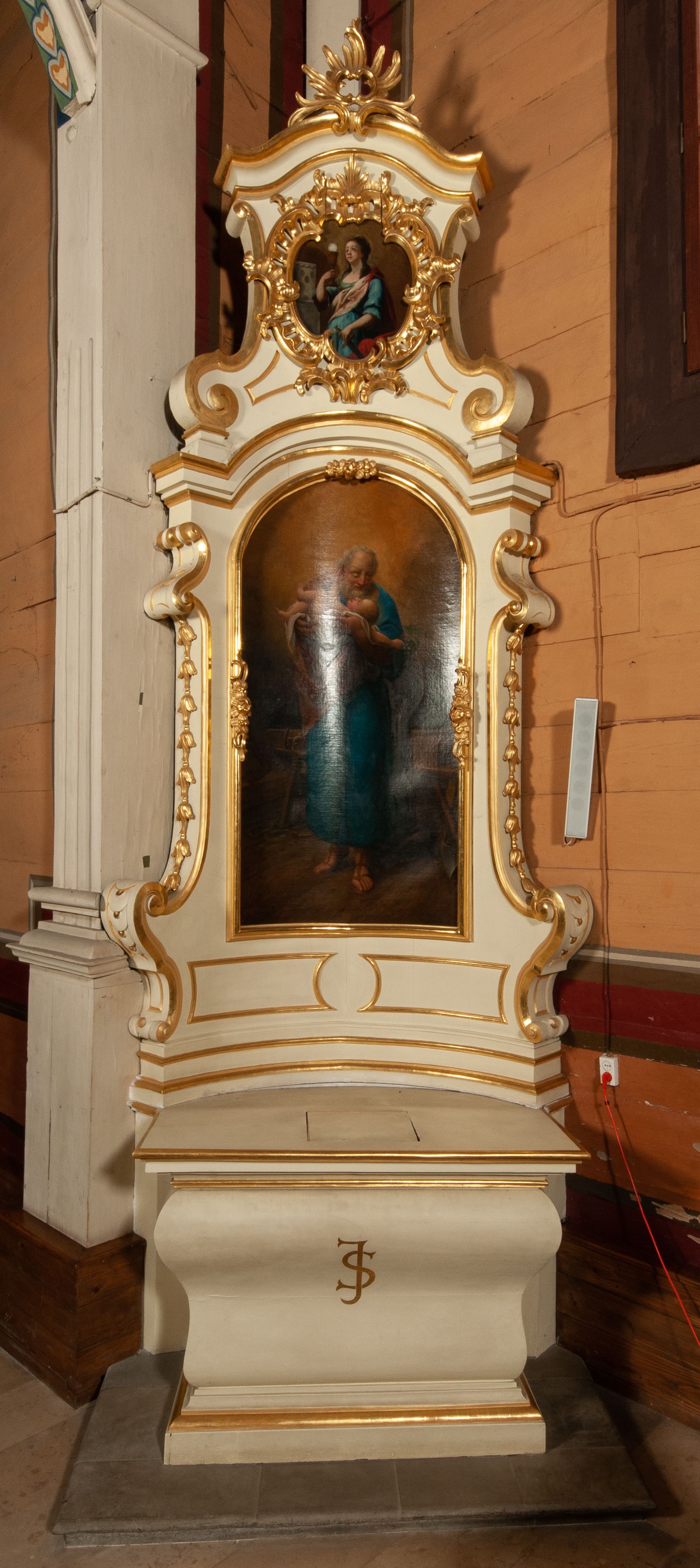 The painting "St. Joseph” was painted in 1868 by Cracovian painter Teodor Baltazar Stachowicz (1800-1873). On the opposite side of the church nave, there is his second painting depicting Our Lady of the Immaculate Conception. The paintings were most probably ordered after the fire of the church in 1867, which partially consumed the previous painting decor of the side altars. In the painting, Saint Joseph was portrayed in a traditional iconographic convention – with Baby Jesus in his arms to show him as the protector of the Son of God.