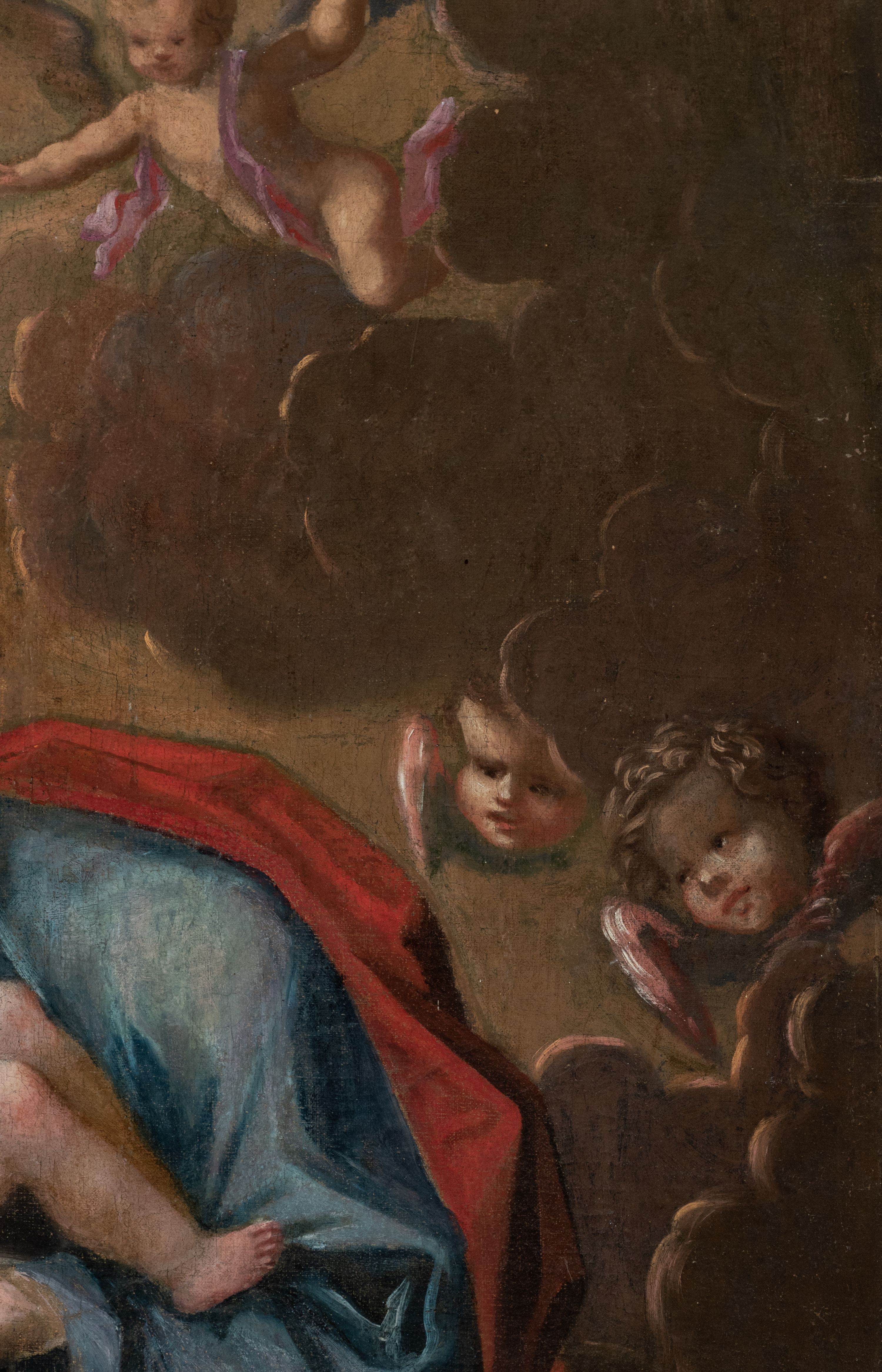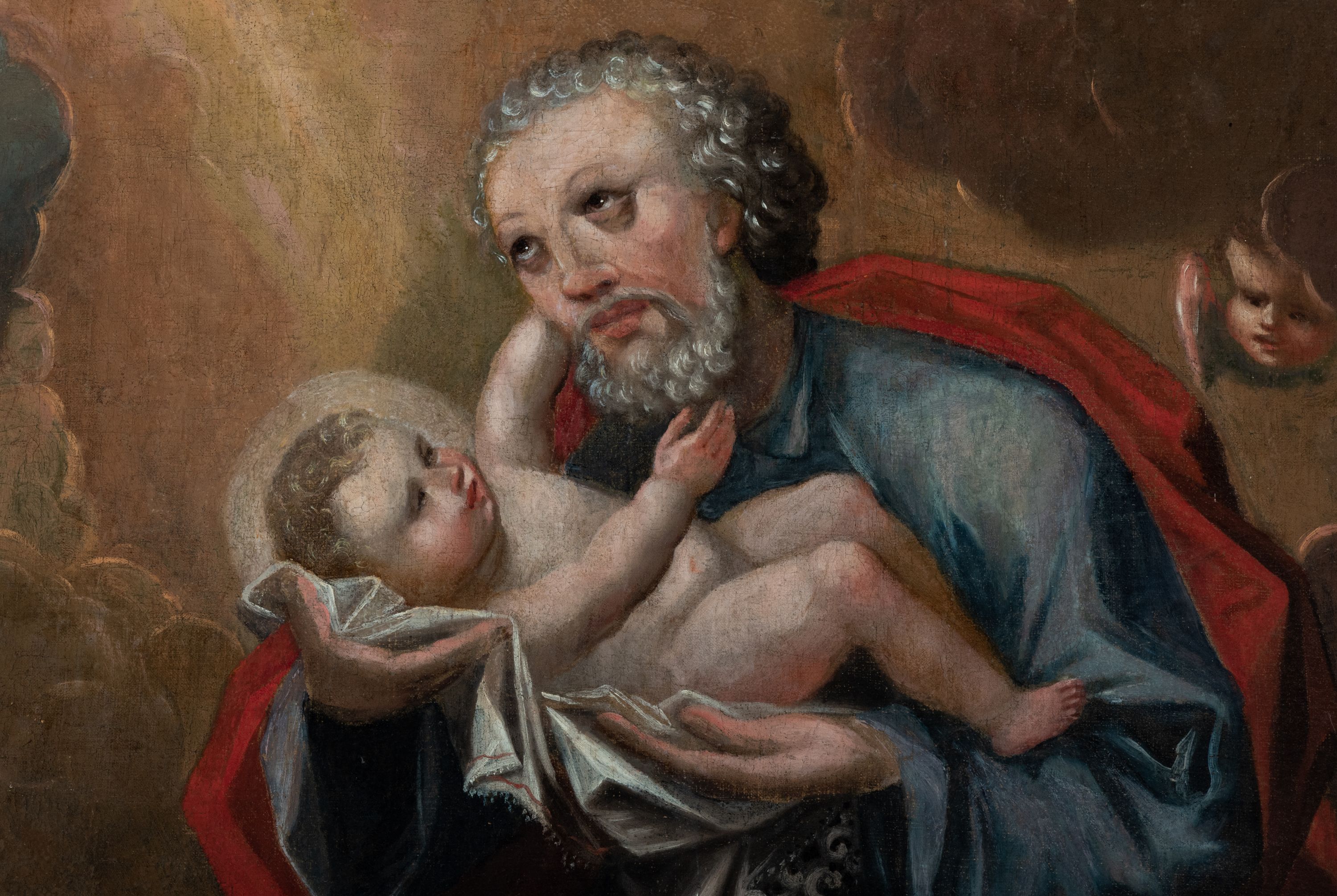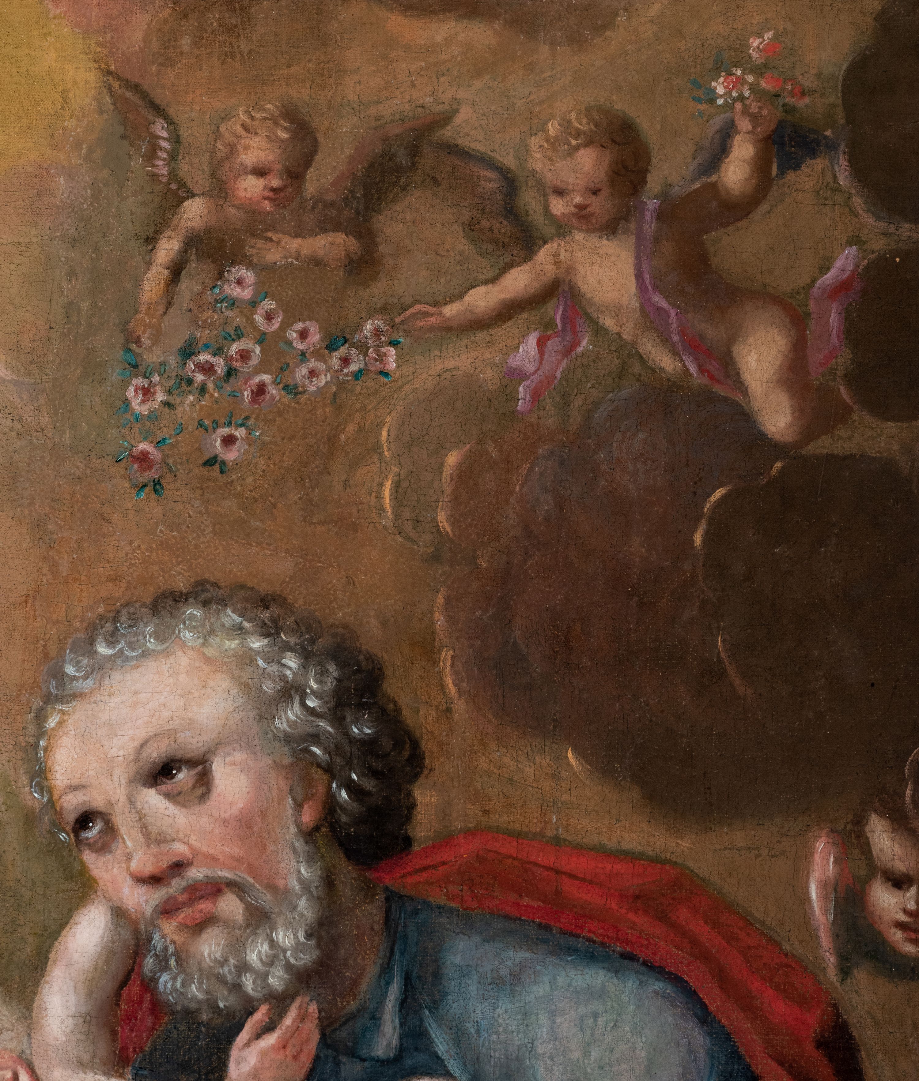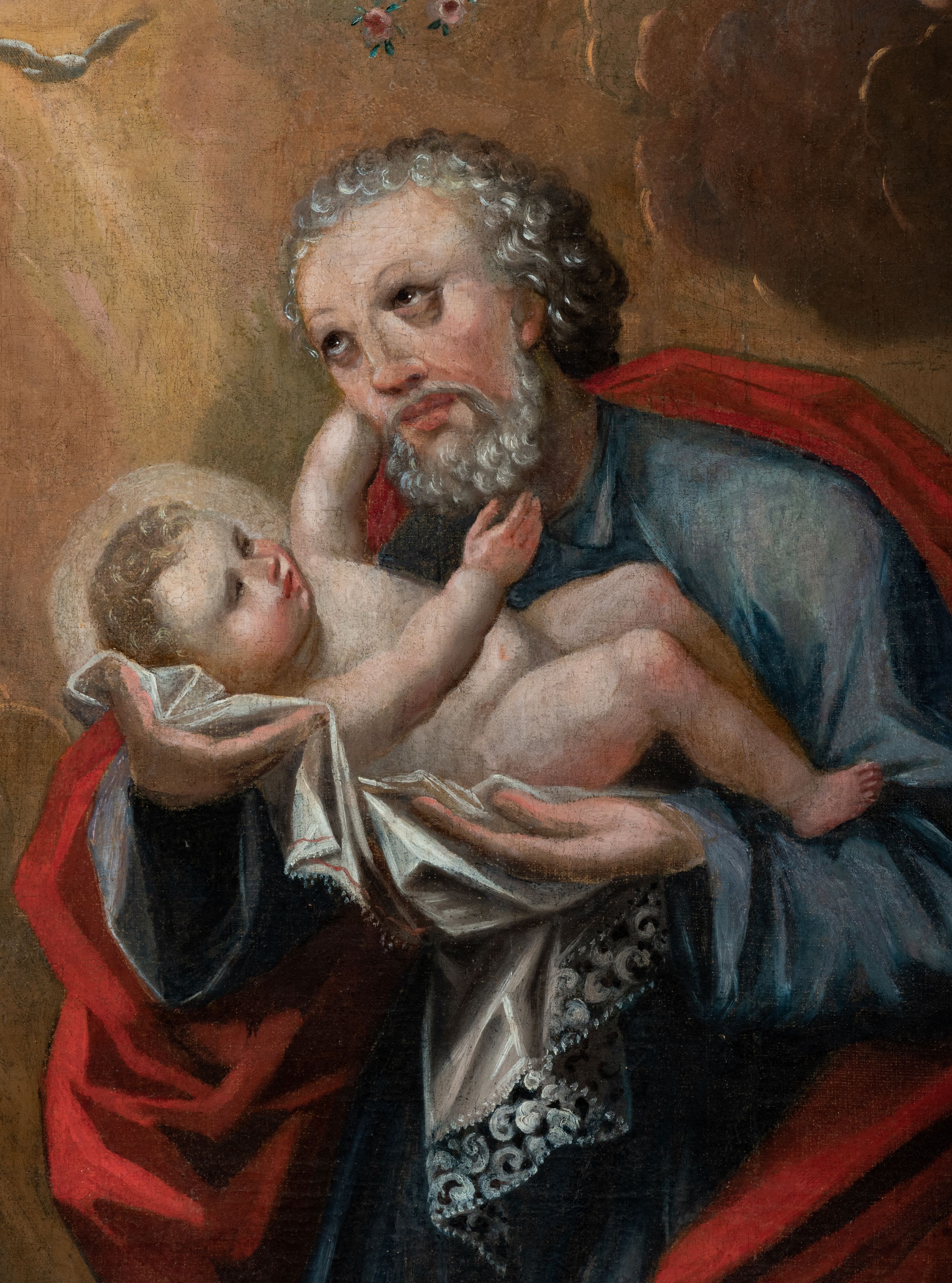 The altar of Saint Joseph was created at the beginning of the 18th century, before 1728. It is known that it was consecrated in 1771 by the suffragan bishop of Chełm, Dominik Józef Kiełczewski, as evidenced by the inscription preserved on the mensa. In 1851, it was renovated at the expense of Józef Mianowski (d. in 1854) and his wife Teodora née Oczosalska (d. in 1884), most probably by the painter and gilder Wojciech Dembowski. In the years 1994–1995 it was conserved in Cracow by Filip Kowalczyk. In artistic terms, it is a pair with the altar of Saint Joachim and Saint Anne made at the same time and probably in the same wood carving workshop. The date 1528, placed in a medallion in the altar finial, according to Teresa Małkowska-Holcerowa – a monographer of the church in Paczółtowice, refers to an older reredos with the same invocation. The title painting depicts the saint holding Baby Jesus against clouds and surrounded by winged angel heads and putti. The image in the finial during canonical visitations and inventories of the church in Paczółtowice was described as the representation of Saint John the Evangelist, however, Teresa Małkowska-Holcerowa believes that it shows Mary, whose image "ideally completes the scene of the title image." Research carried out during the last restoration of the reredos has shown that both paintings were not originally intended for this altar. Their dimensions were adapted to the frames in which they were placed.