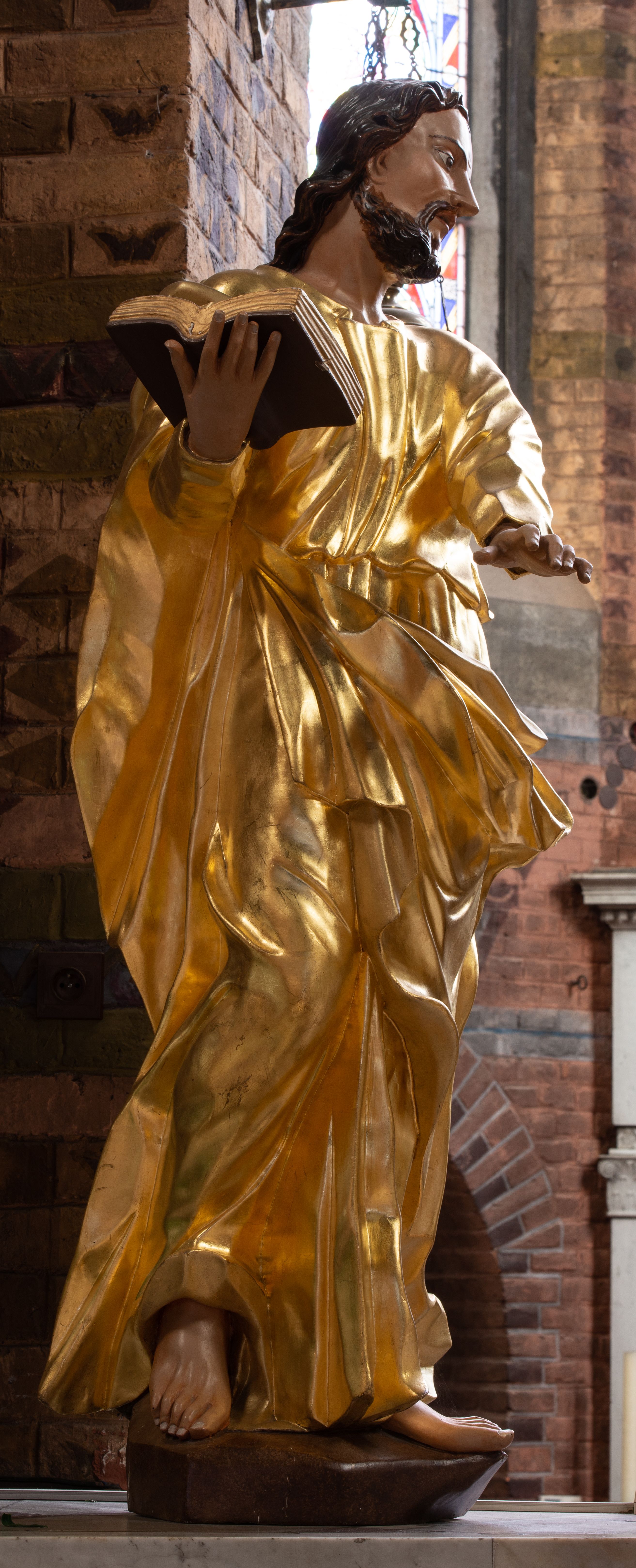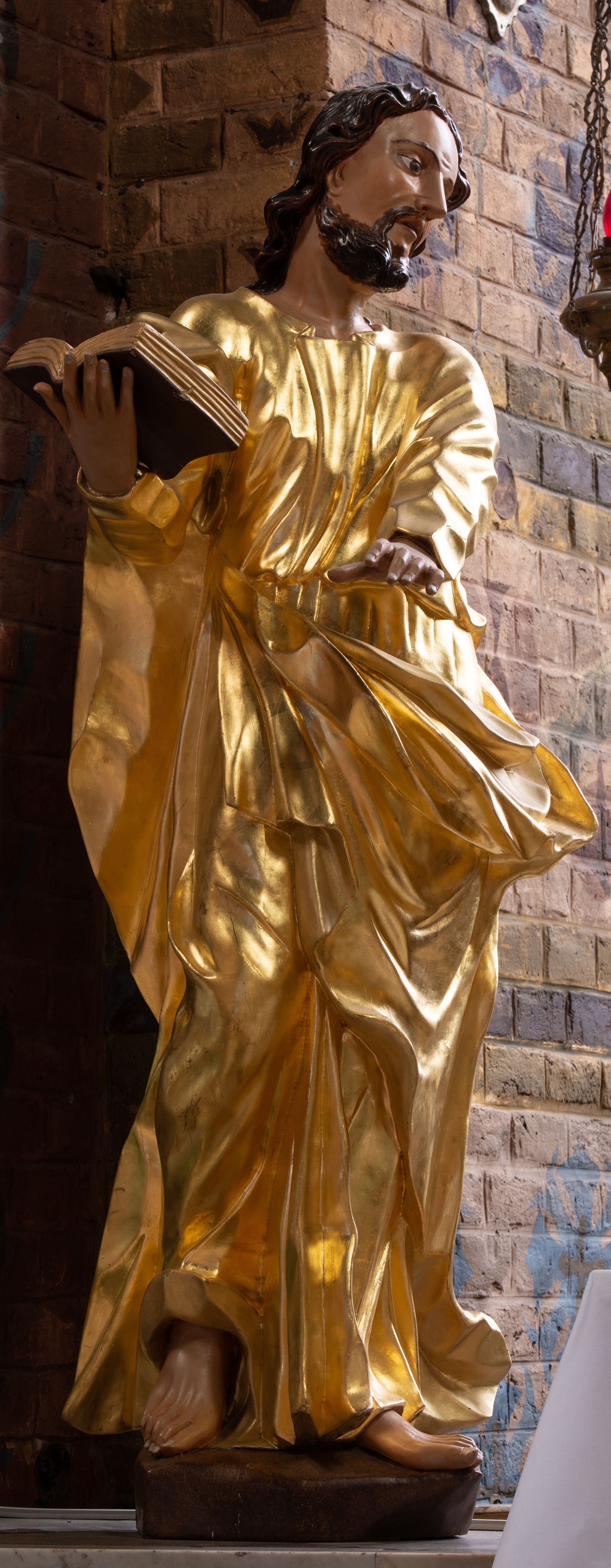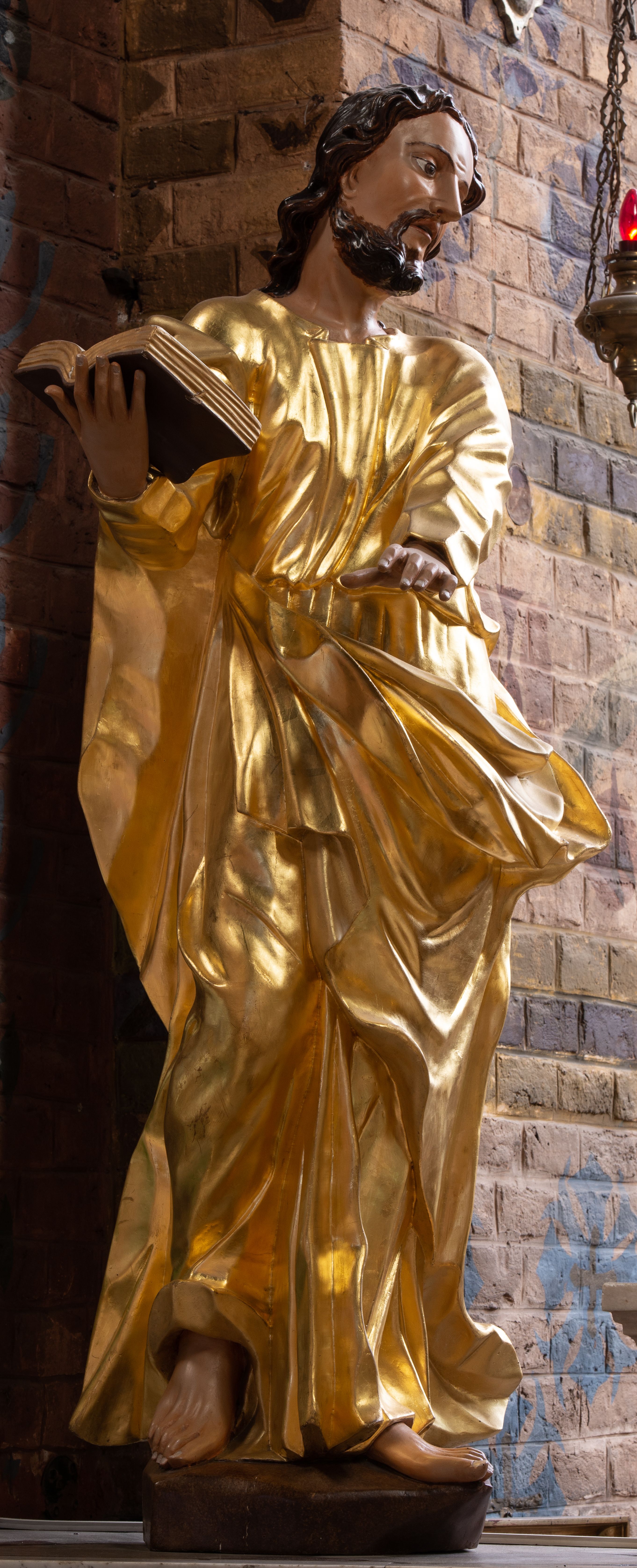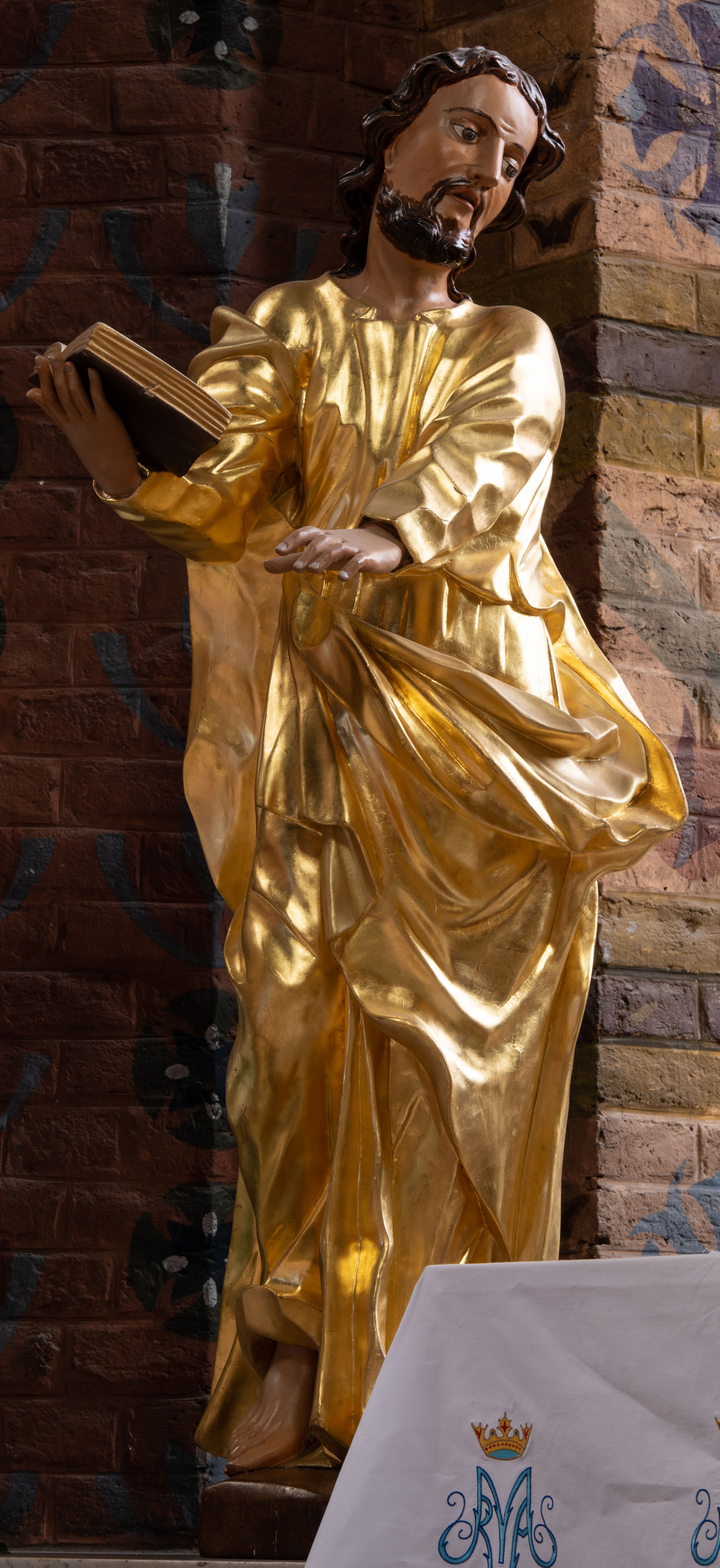 A late baroque statue of St. Luke was originally placed in the side left altar of an old church. It was transferred and placed on the altar of a new church in 1971.