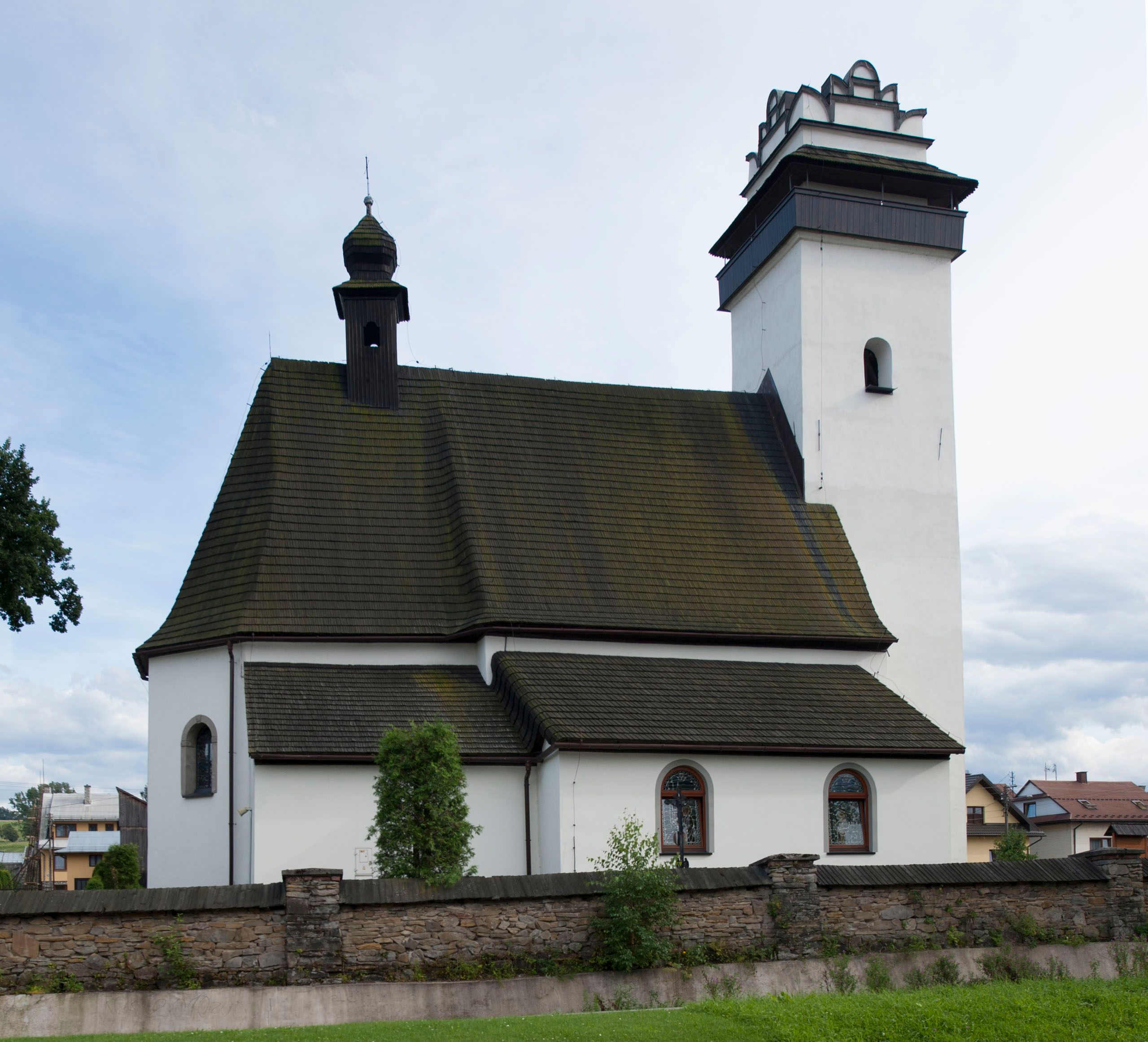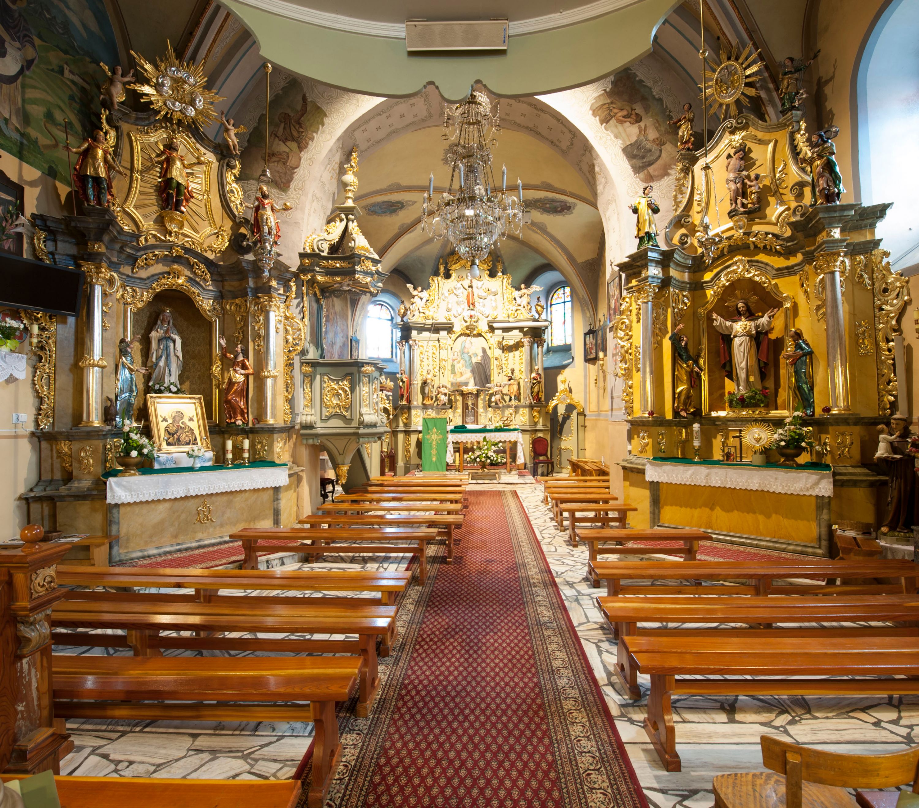 The present St. Martin's Church in Krempachy was erected around the middle of the 16th century. The temple changed its invocation three times. Originally it was dedicated to St. Servatius, then to All Saints, and at the end of the 19th century to - St. Martin. The church is a modest building of transitional type from Gothic to Renaissance. The temple has style characteristics of both periods. For example, the tower in the western part of the temple is decorated with a renaissance attic, but at the same time it has a Gothic hoarding. Attic, the so called Polish one, had close connotations with neighbouring countries, and in particular with Slovakia. Attics were very popular at that time. An additional architectural element was a wooden gallery at the top of the tower. It was significant both for observational and defensive purposes. Hoardings, or brattices, date back to the Middle Ages, and derive from starlings crowning the towers and fortified towers. The interior of the temple, decorated with Rococo furnishings, was entirely different, and is nowadays filled with works of art from the 18th century. According to some researchers of the history of the church, the high altar was built around 1725, as evidenced by a record in the parish chronicle from the same year, in which information about a newly carved reredos painted, silver-plated and gilded by an Austrian painter Jan Grimm was noted. However, the altar is richly decorated with Rococo ornamentation, which forms a coherent whole with its structure, thus suggesting that it may rather date back to the second half of the 18th century. The construction of the new reredos could have been linked to a fire of the church roof in 1788. When visiting the church in Krempachy, the musical choir is also worth noting, which was made in the late Baroque style with a concave-convex balustrade typical for that period. Painted decorations in the form of stylised flower compositions on a black background placed in the windowsills come from much later, probably the 19th century.