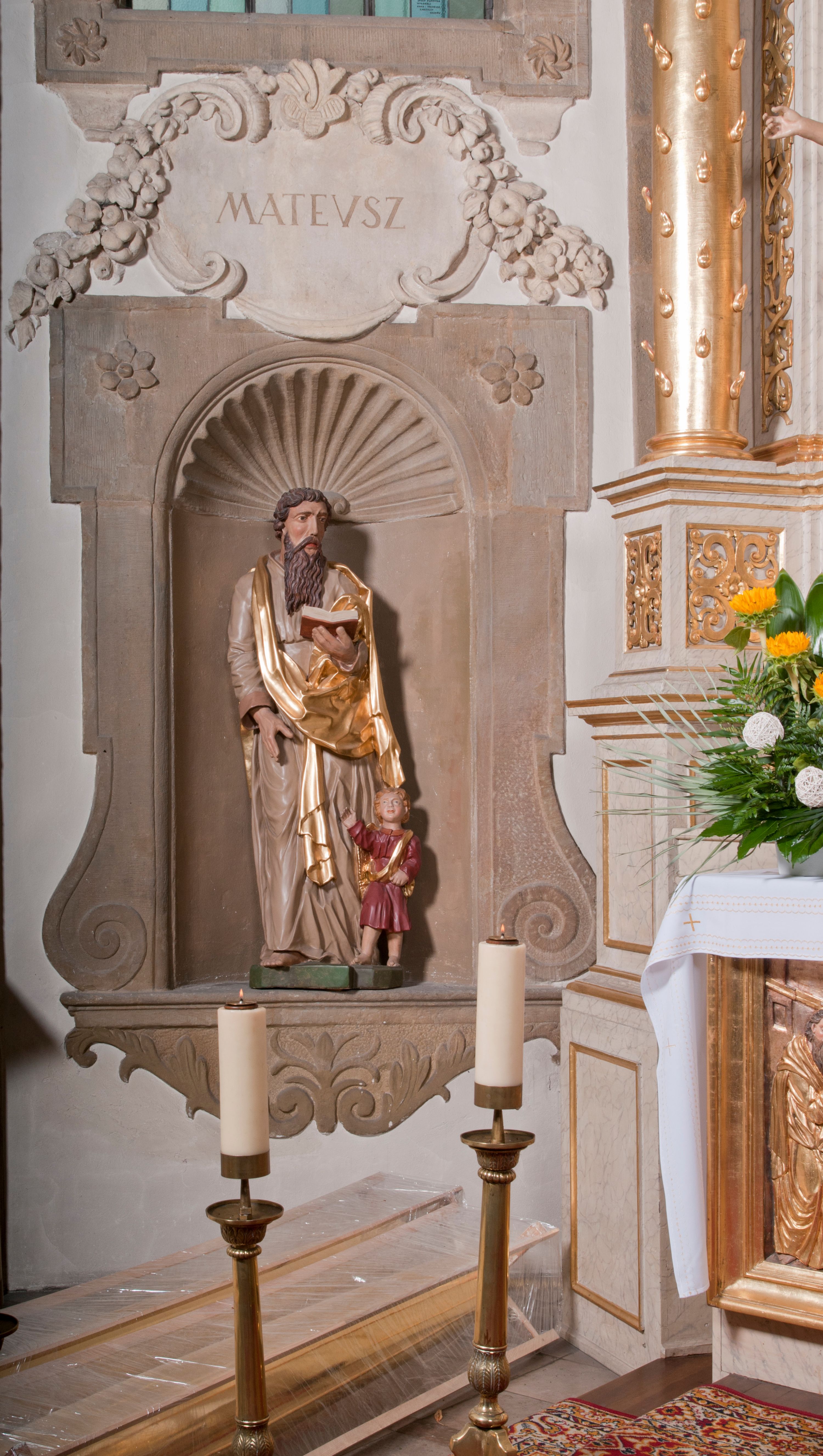 The sculpture of Saint Matthew was made during the office of parish priest Stanisław Osuchowski in 1852-1865 and placed in the niche of the Morsztyn chapel. It is characterised by its form, which still draws on the Baroque tradition. The average quality of creation indicates that the sculpture is an example of provincial production.