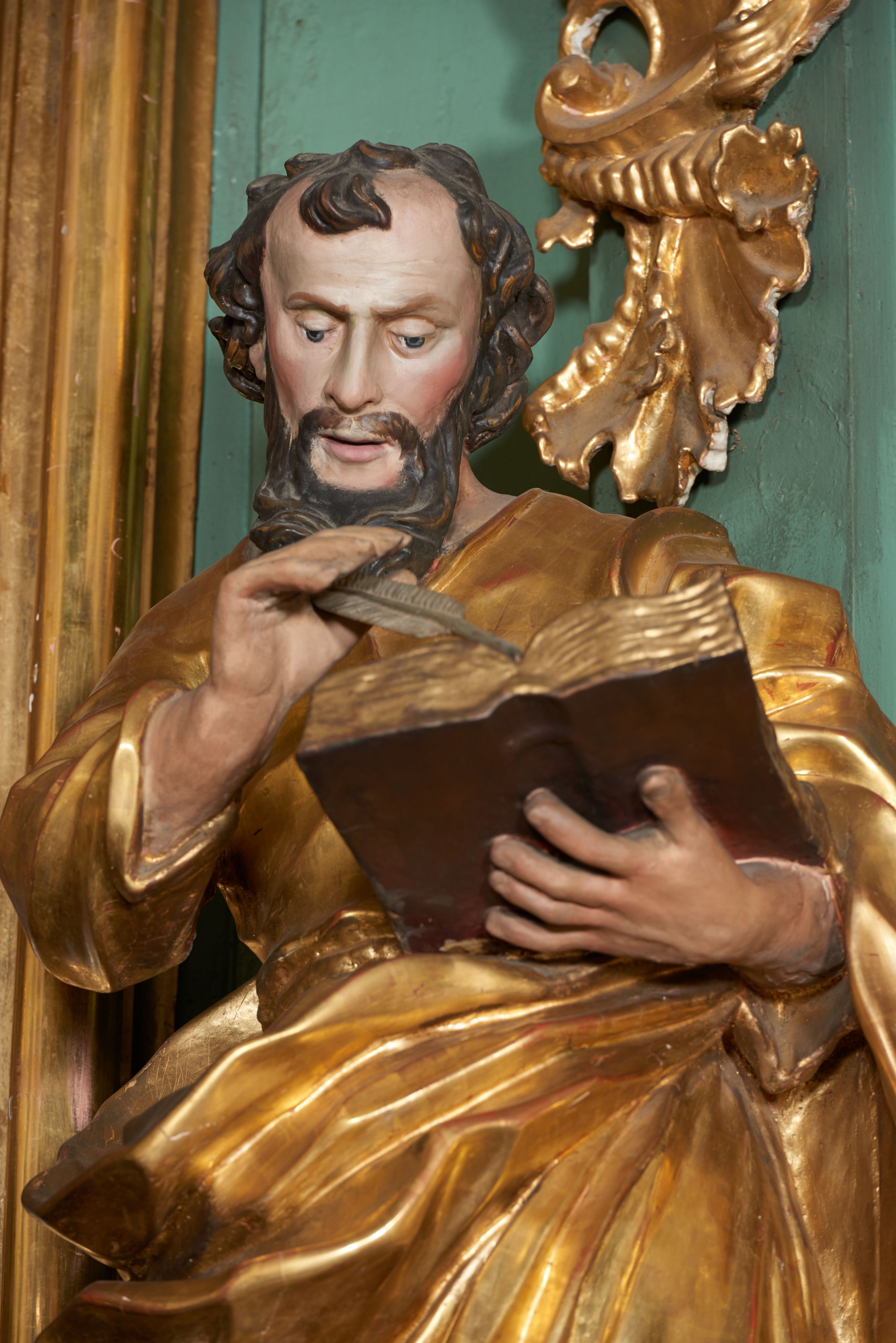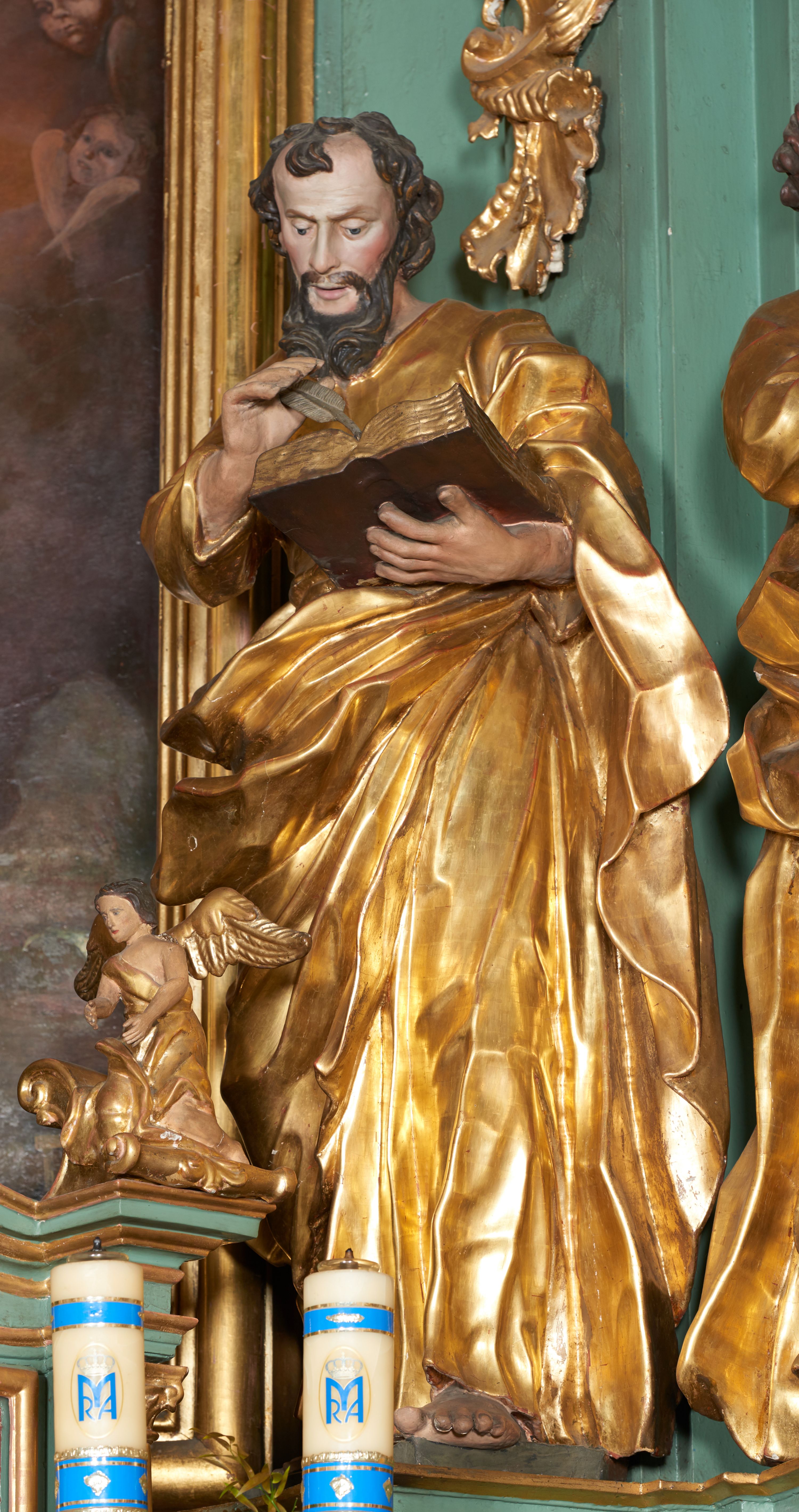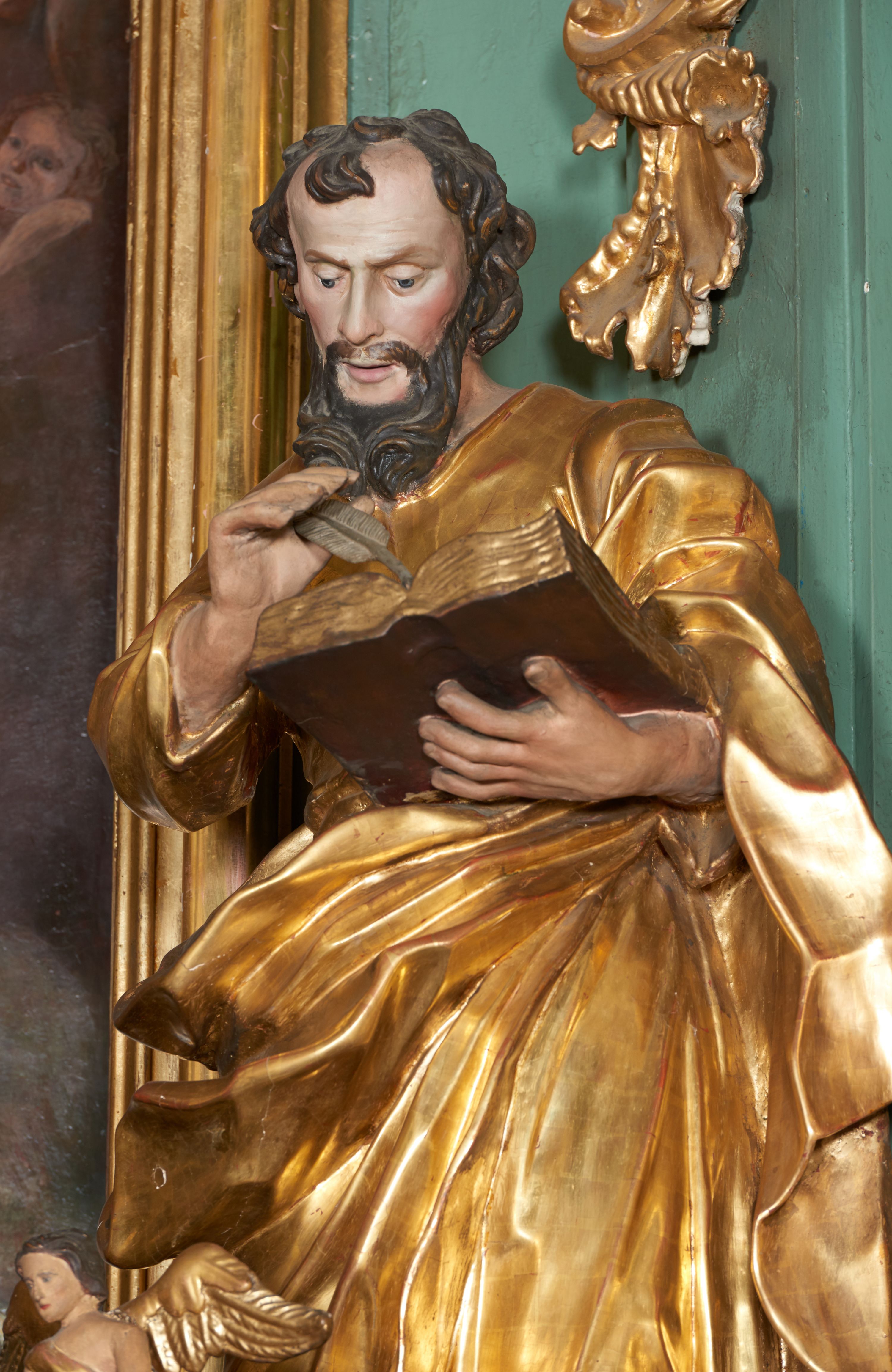The statues of four evangelists were created before 1748, together with the high altar. Their production is attributed to the workshop of Kornecki – the likely creator of all furnishings of the church in Gdów. Saint Matthew was a publican who was chosen by Jesus as one of his disciples. He was the author of the first Gospel. In iconography, he is frequently portrayed with a book and an image of a man in the company of four other evangelists.