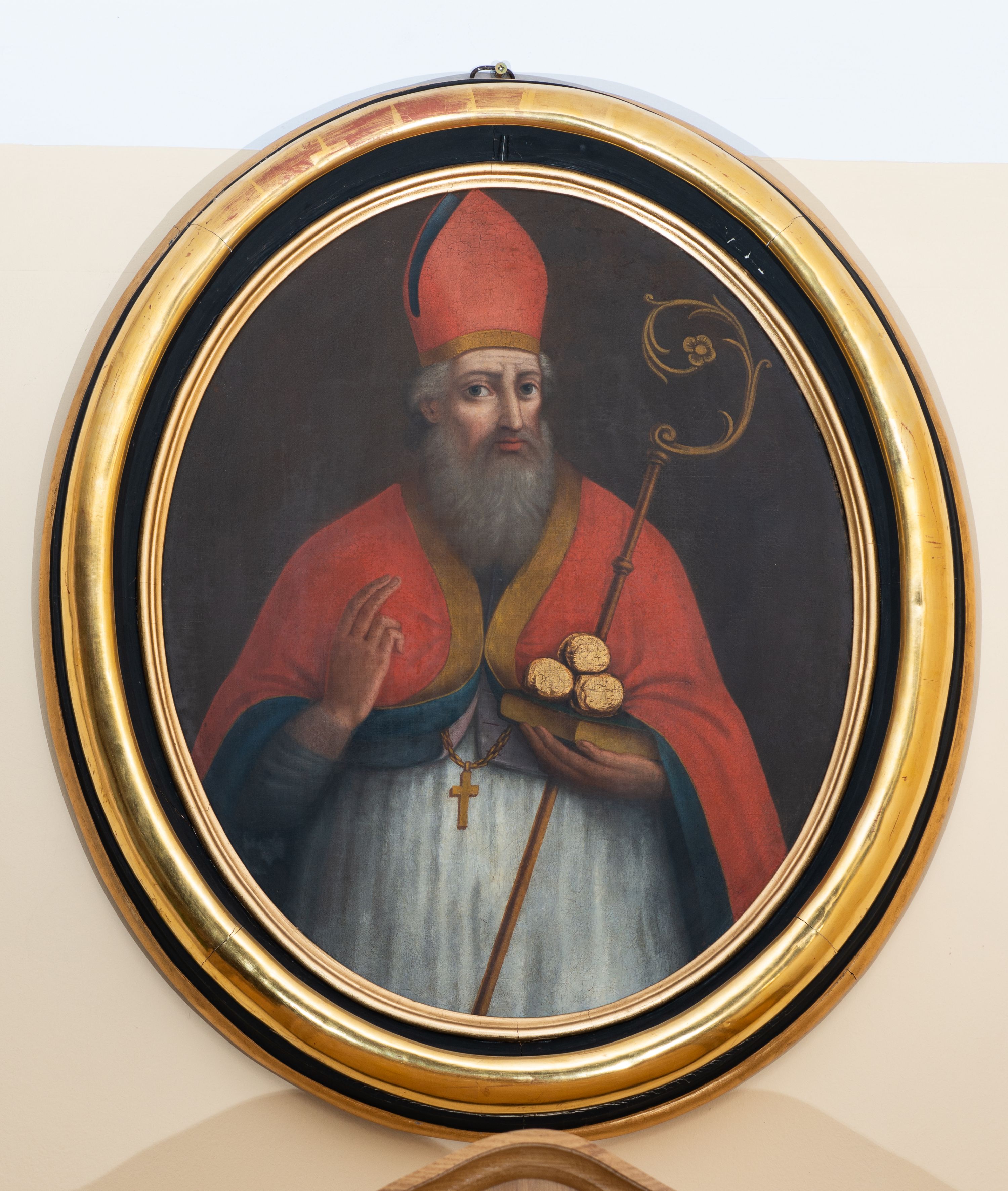 The painting of Saint Nicholas was created in 1850 in the workshop of Sebastian Stolarski, a painter from Myślenice. It depicts the bishop of Mira, who lived at the turn of the 3rd and 4th century. The attributes in the painting refer to the legends associated with the saint's life. Three golden balls symbolise the gift that Saint Nicholas gave to three poor maidens as a dowry. In turn, the outfit, as well as the staff and the book refer to his pastoral mission while he was the bishop of Mira in Lycia.