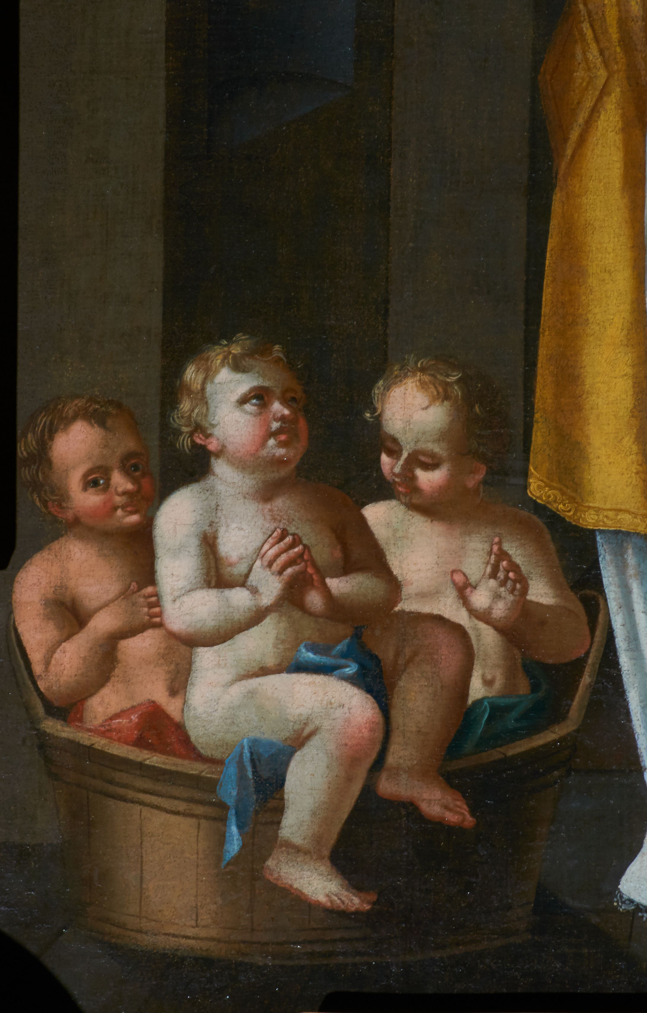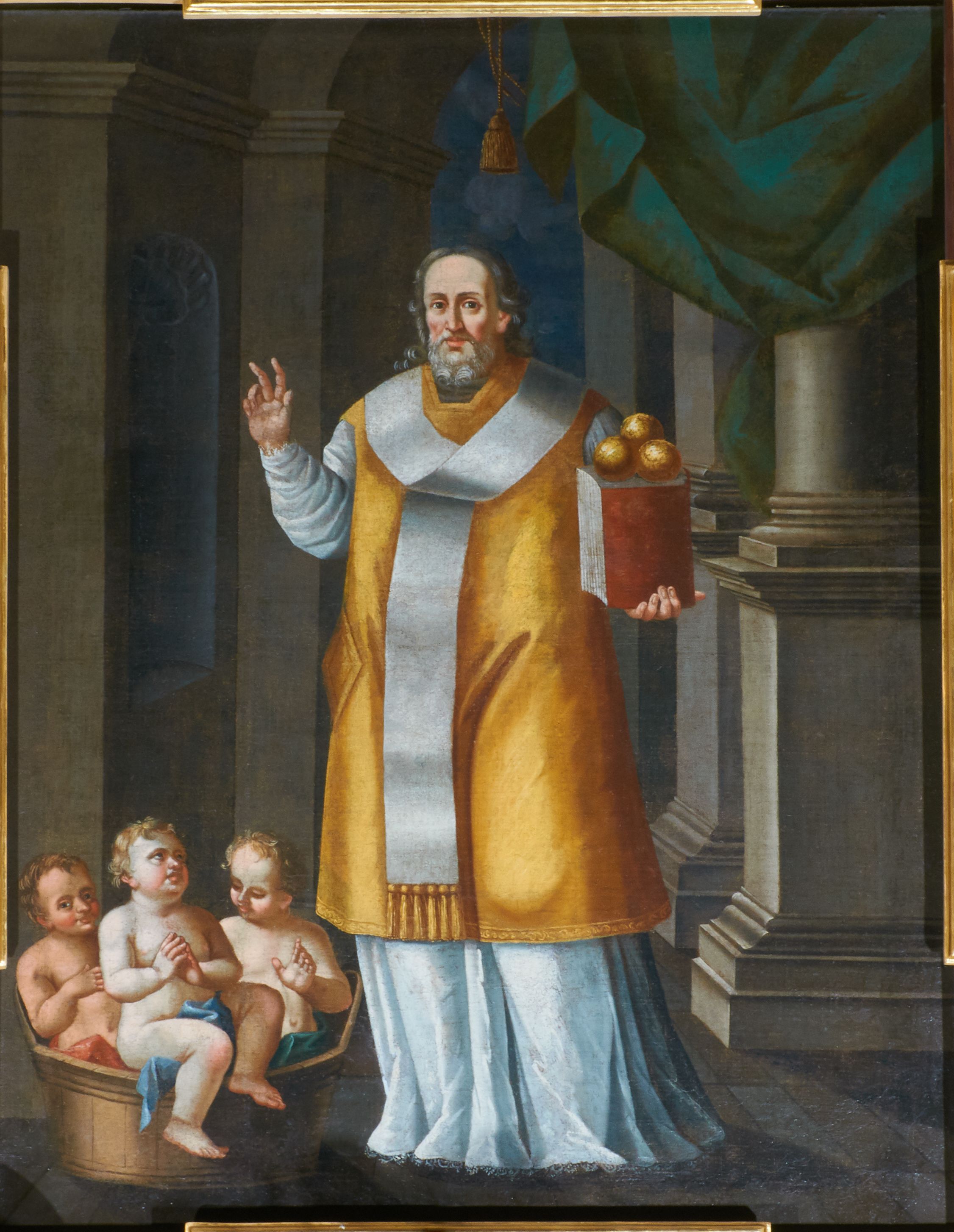 The painting was made in 1771 by Kazimierz Mołodziński – a painter who was born and worked in Cracow. Mołodziński was a painter of large-format religious paintings, continuing late Baroque tradition. The painting was placed in the high altar of the church in Czulice. Attributes of St. Nicholas depicted in the painting refer to the legends associated with the life of the saint.