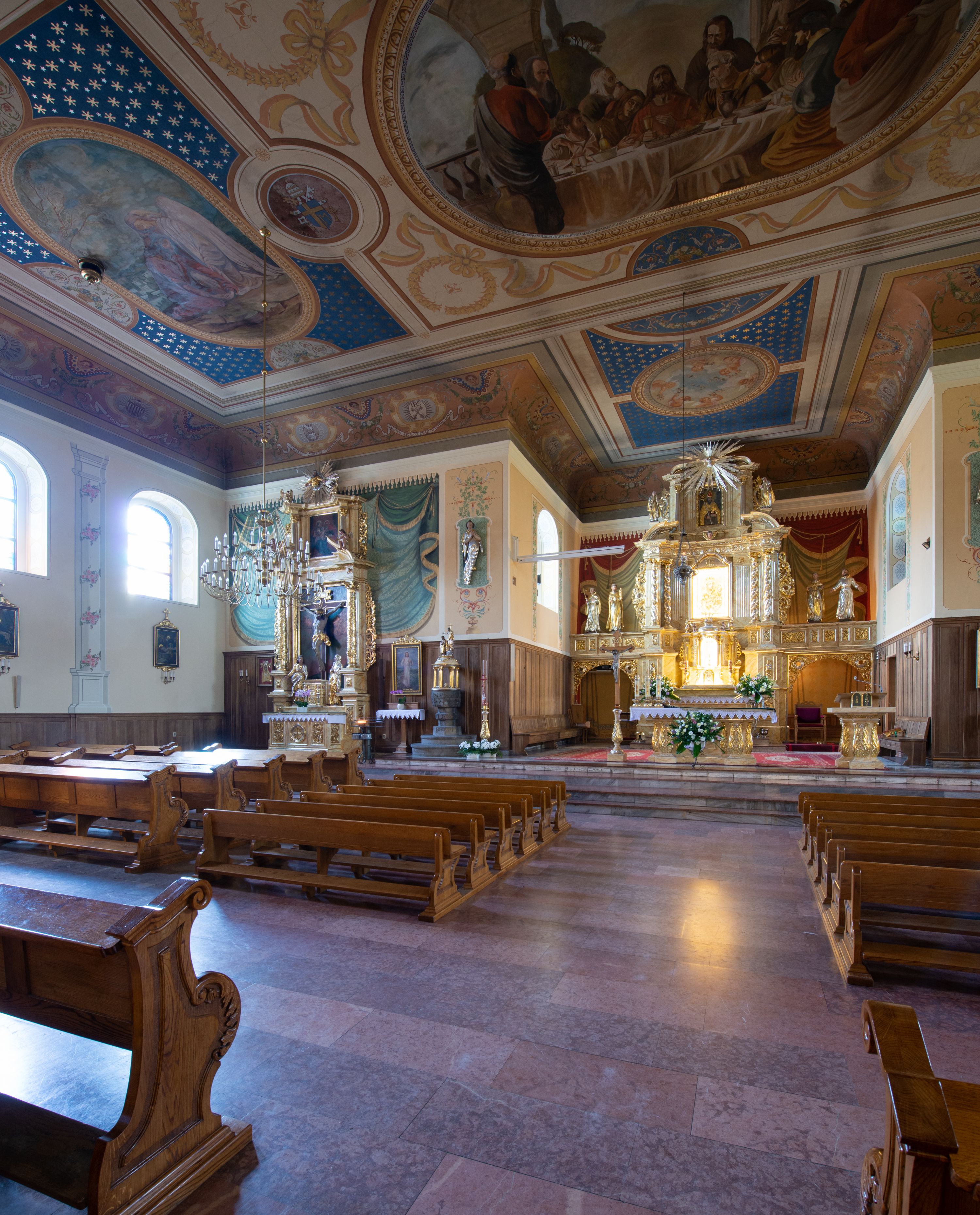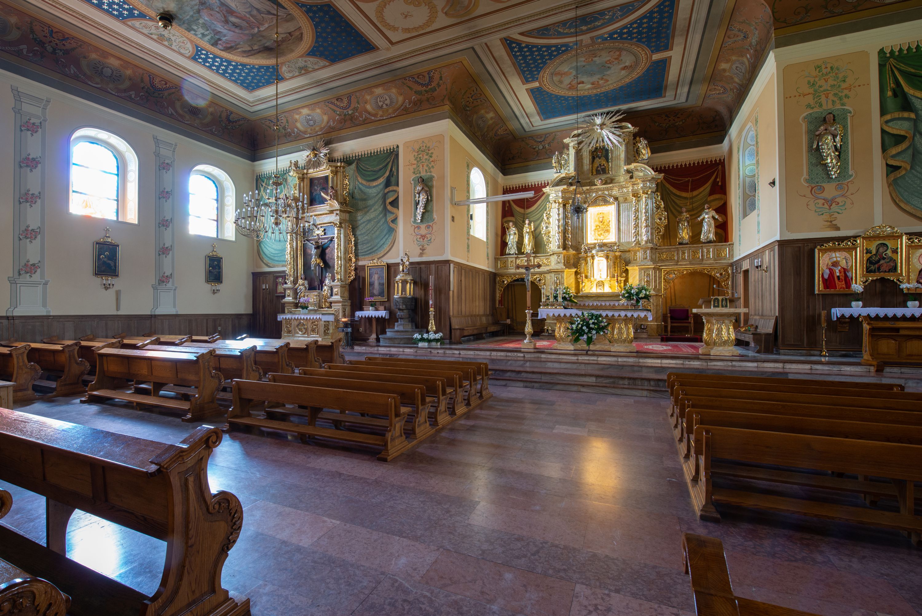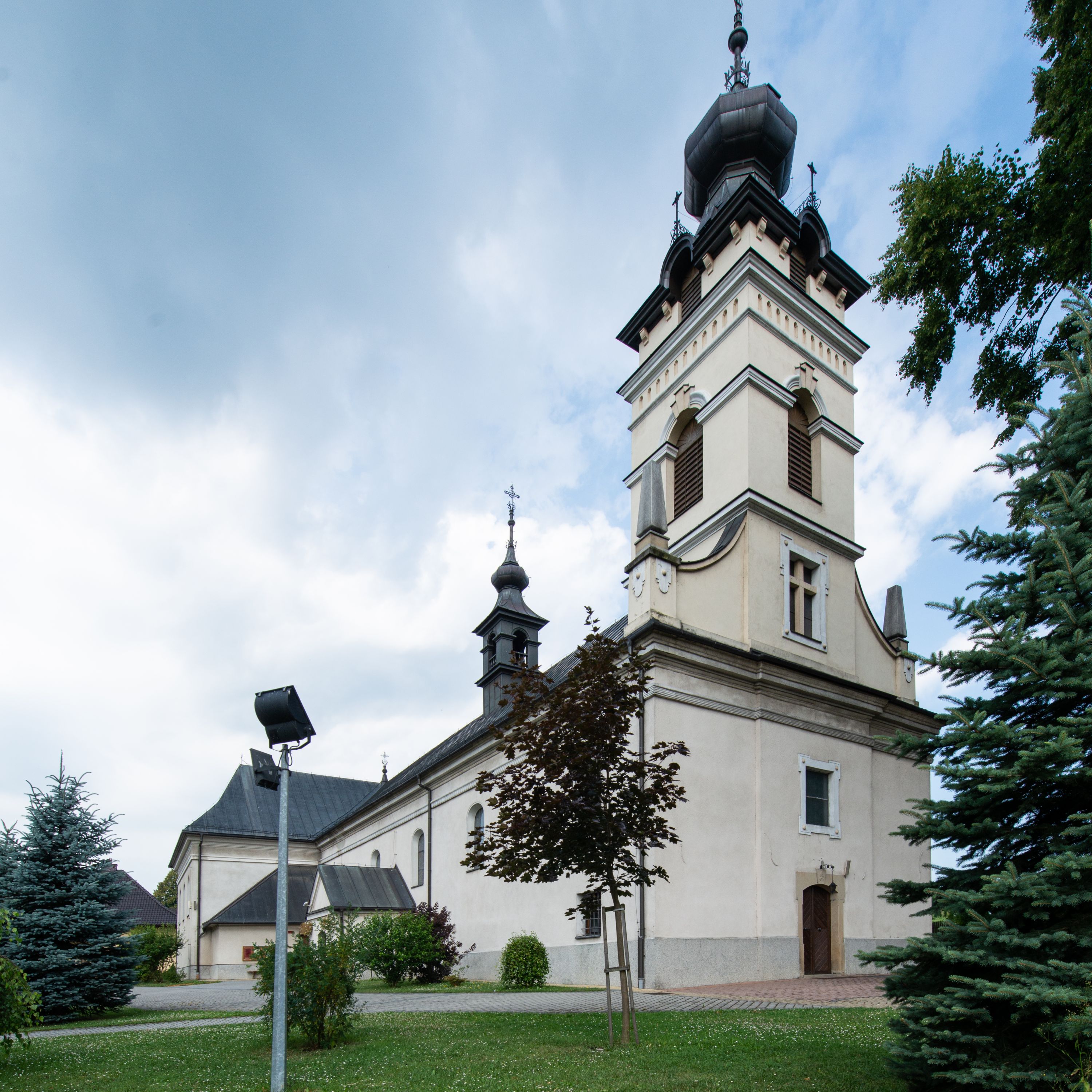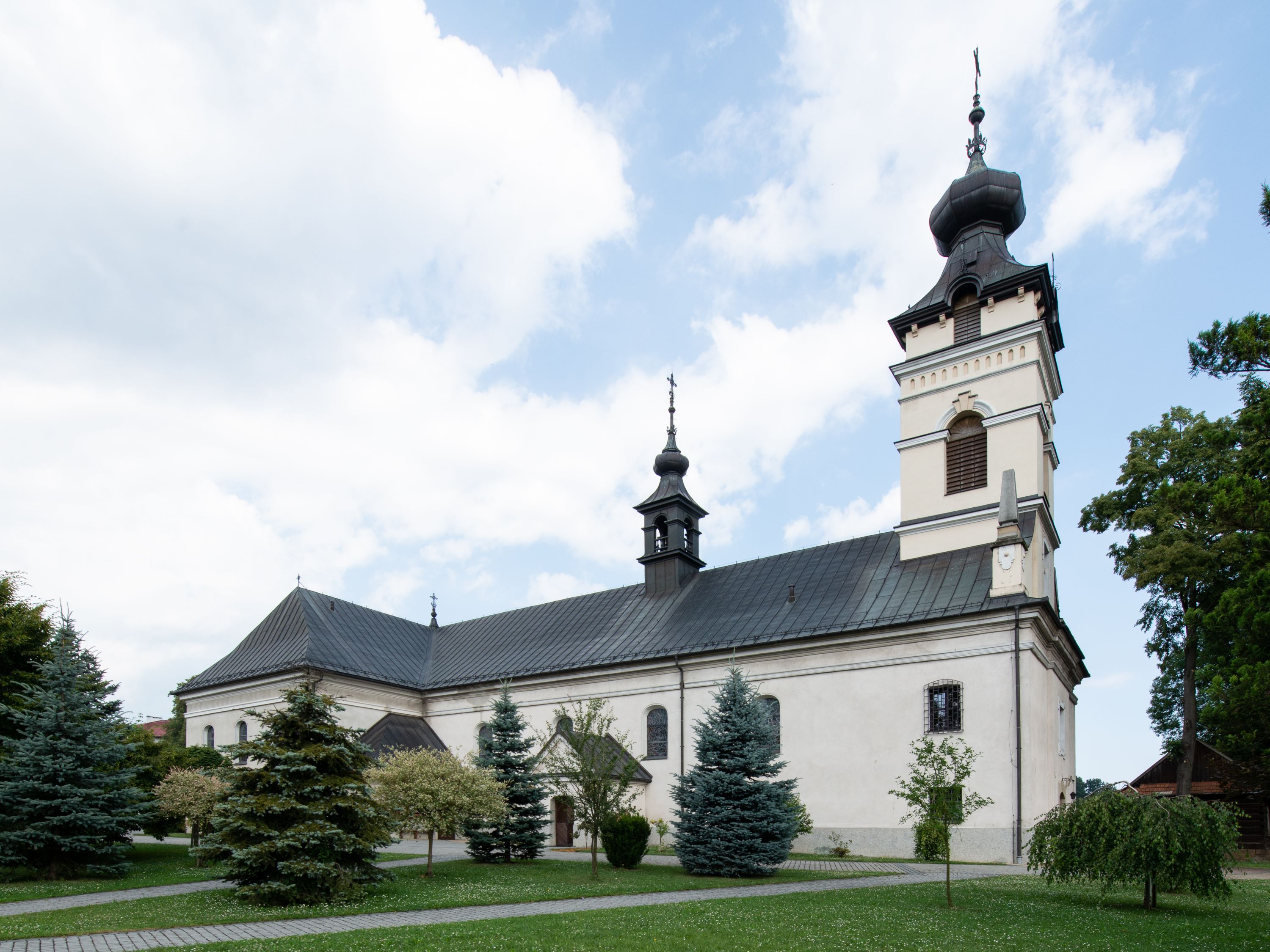 St. Nicholas' Church in Pcim was built in 1810-1829 in the Josephine Musterkirchen style with a tower in façade with flanks. It was a very poular style on the borderline of Galicia and Hungary. The church has also some newer extensions from the end of the 20th century. Moreover, its architecture realizes the simplicity postulate of construction and resignation from a rich interior design. The church was consecrated by the Cracovian suffragan bishop Franciszek de Paula Pisztek on 5 November 1833. Inside the church, there are a high altar from the early 18 century and an Our Lady of the Rosary side altar. Probably, both altars were transferred from St. Agnes Church on Stradom in Cracow. In turn, the second side altar comes from the mid 17th century and it was transferred from the former temple in Pcim. When father Wojciech Łapiński served as a parish priest, the temple was expanded by a pulpit, matroneum and presenter's pews. Organ was made by a local self-taught Ludwik Jan Gracz in the 18th century (the instrument was altered and extended in 1968). In 1961, after an electrical system had been installed, polychrome of the ceiling was renovated. The current polychrome of the entire church designed by Franciszek Kramarz from Jaworzno was made by the painters: Piotr Tarka and Tadeusz Czyczyło, under Antoni Rzezik from Chrzanów direction. Additionally, a choir was extended and tower construction was reinforced. With regard to wall polychrome for Our Lady Of The Rosary Chapel, it was made in the eclectic style by the painters: Adolf Hiroń i Paweł Palka, according to the design of Giebułtowski of Oświęcim. In 1983 - 1984 a wide transept nave and new chancel were built on to eastern part of a church (the presbyterial section of the church). Stained glass windows in the chancel were created probably before 1910. The designer and constructor their of remain unknown. In the church, there are also a box from the second half of the 17th century, crucifix from the 18th century, as well as various monuments from the 19th century. During an inventory of the church in the sixties, there was also an antique sculpture of St. Nicholas from the fourth quarter of the 14th century in the temple (currently it is stored in the Museum in Myślenice).