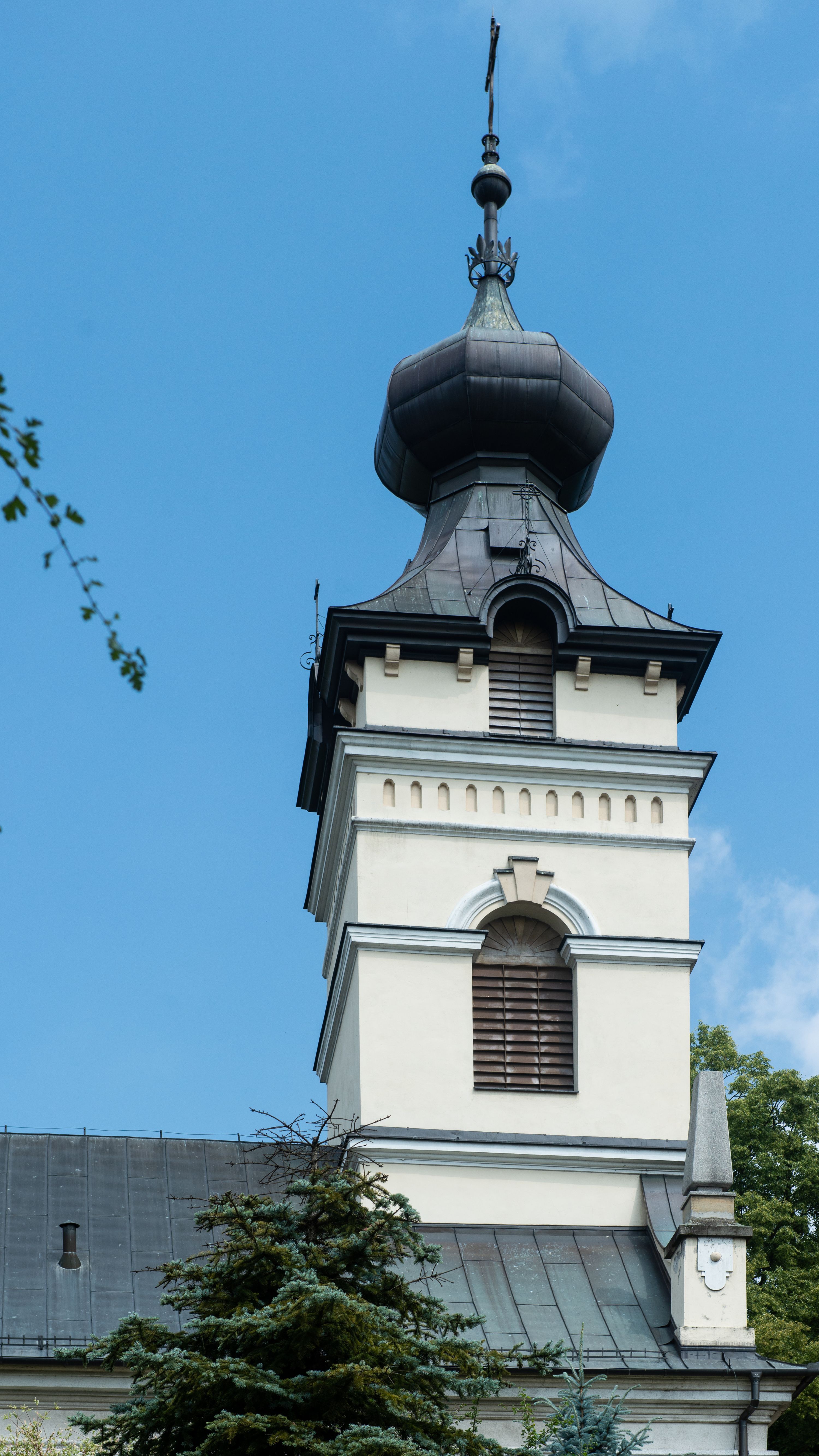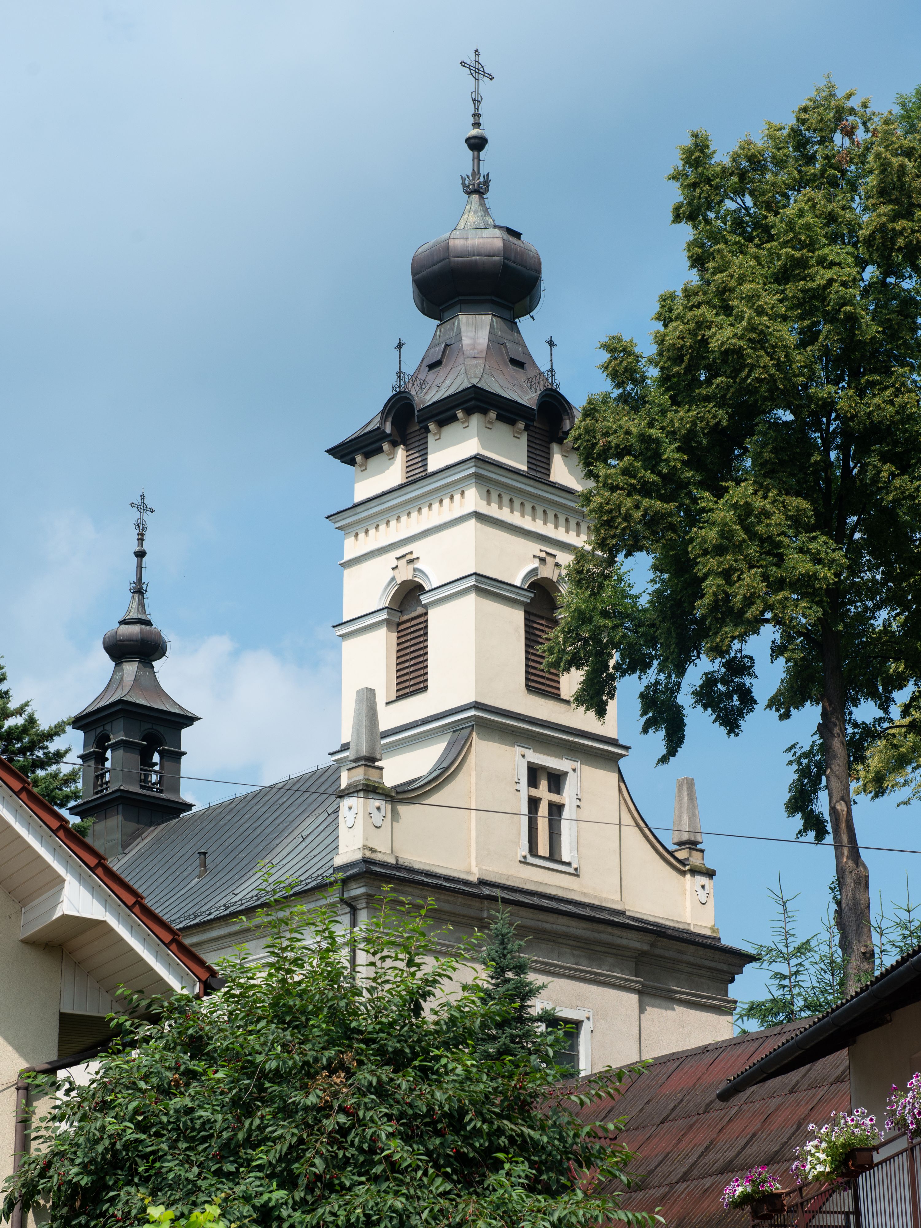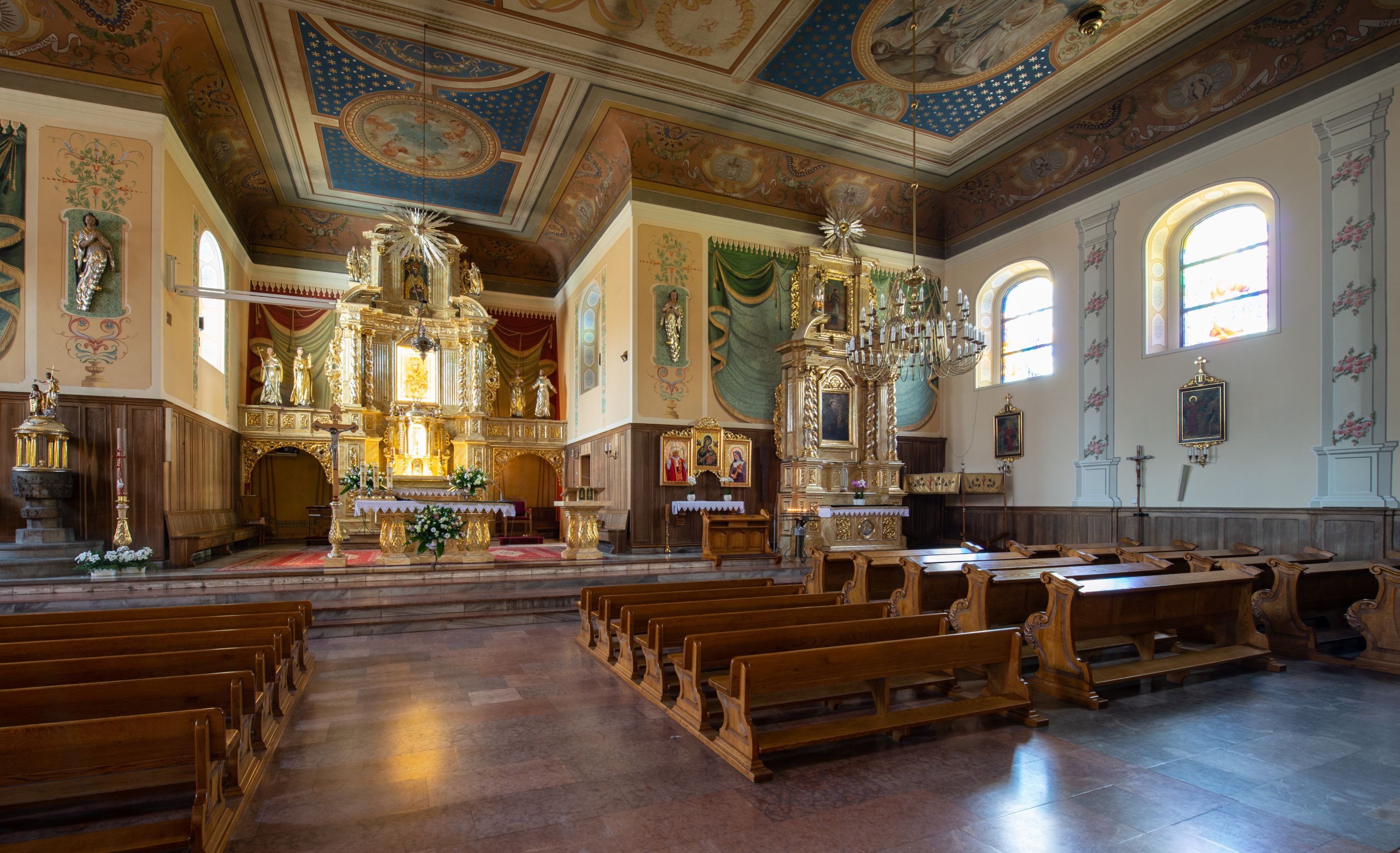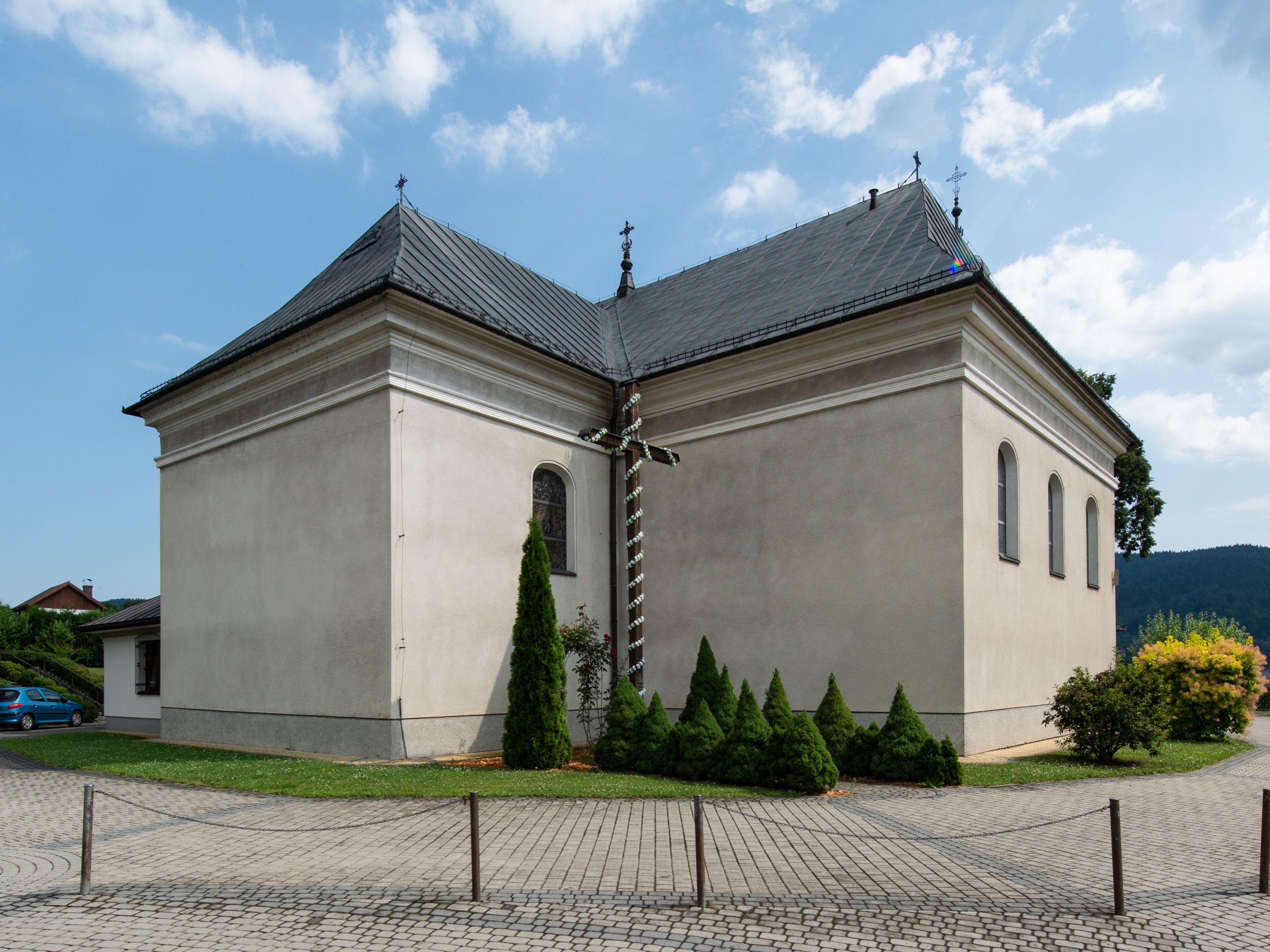 St. Nicholas' Church in Pcim was built in 1810-1829 in the Josephine Musterkirchen style with a tower in façade with flanks. It was a very poular style on the borderline of Galicia and Hungary. The church has also some newer extensions from the end of the 20th century. Moreover, its architecture realizes the simplicity postulate of construction and resignation from a rich interior design. The church was consecrated by the Cracovian suffragan bishop Franciszek de Paula Pisztek on 5 November 1833. Inside the church, there are a high altar from the early 18 century and an Our Lady of the Rosary side altar. Probably, both altars were transferred from St. Agnes Church on Stradom in Cracow. In turn, the second side altar comes from the mid 17th century and it was transferred from the former temple in Pcim. When father Wojciech Łapiński served as a parish priest, the temple was expanded by a pulpit, matroneum and presenter's pews. Organ was made by a local self-taught Ludwik Jan Gracz in the 18th century (the instrument was altered and extended in 1968). In 1961, after an electrical system had been installed, polychrome of the ceiling was renovated. The current polychrome of the entire church designed by Franciszek Kramarz from Jaworzno was made by the painters: Piotr Tarka and Tadeusz Czyczyło, under Antoni Rzezik from Chrzanów direction. Additionally, a choir was extended and tower construction was reinforced. With regard to wall polychrome for Our Lady Of The Rosary Chapel, it was made in the eclectic style by the painters: Adolf Hiroń i Paweł Palka, according to the design of Giebułtowski of Oświęcim. In 1983 - 1984 a wide transept nave and new chancel were built on to eastern part of a church (the presbyterial section of the church). Stained glass windows in the chancel were created probably before 1910. The designer and constructor their of remain unknown. In the church, there are also a box from the second half of the 17th century, crucifix from the 18th century, as well as various monuments from the 19th century. During an inventory of the church in the sixties, there was also an antique sculpture of St. Nicholas from the fourth quarter of the 14th century in the temple (currently it is stored in the Museum in Myślenice).