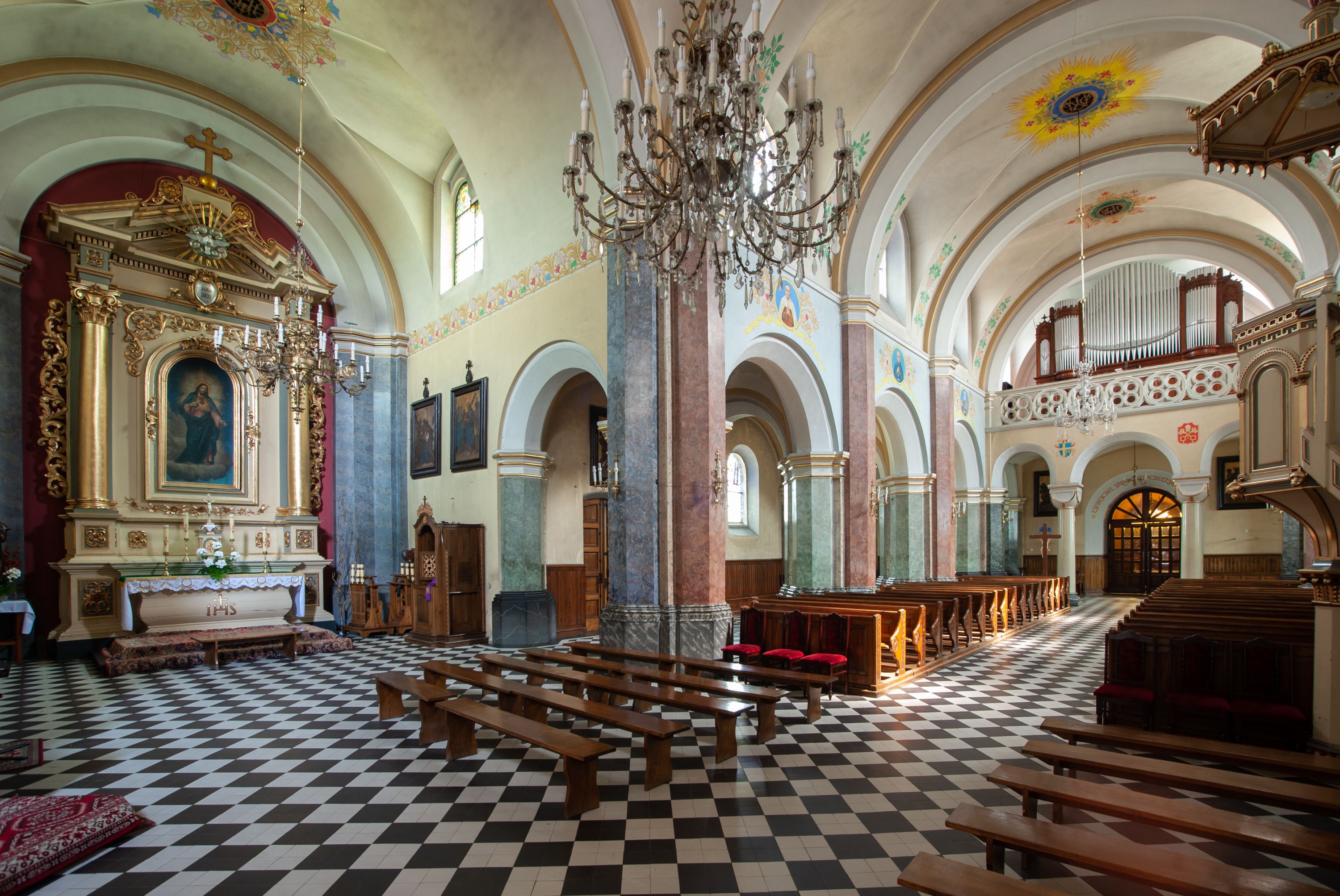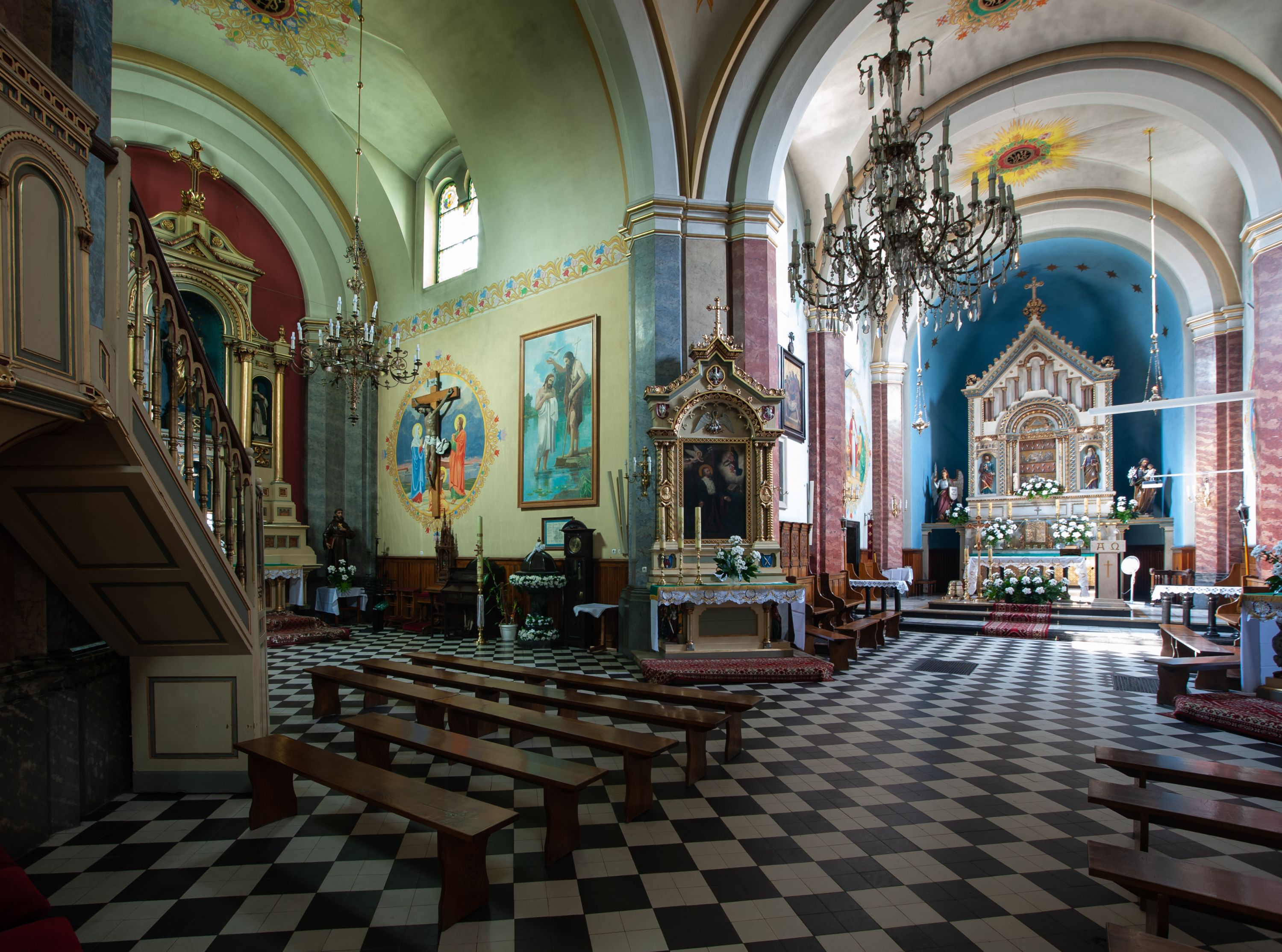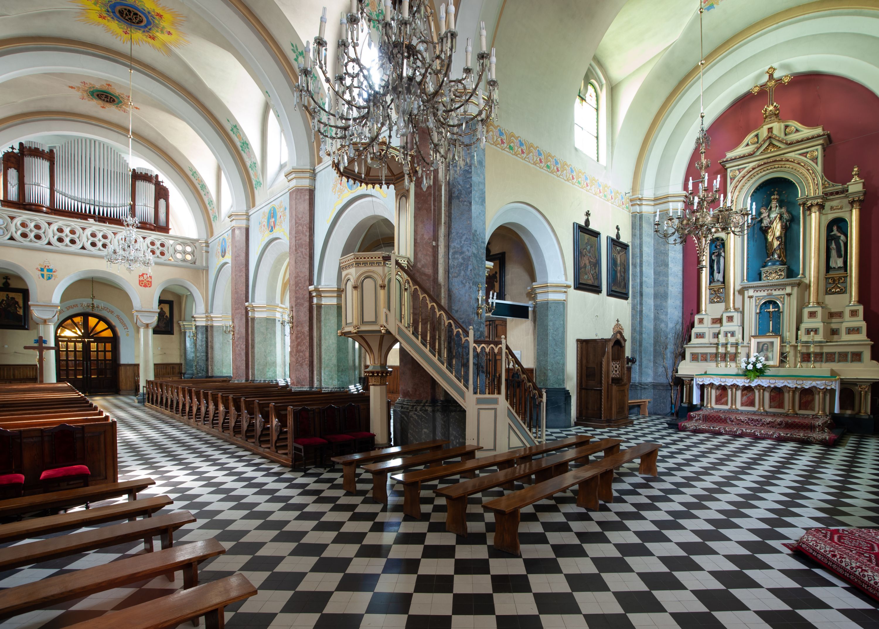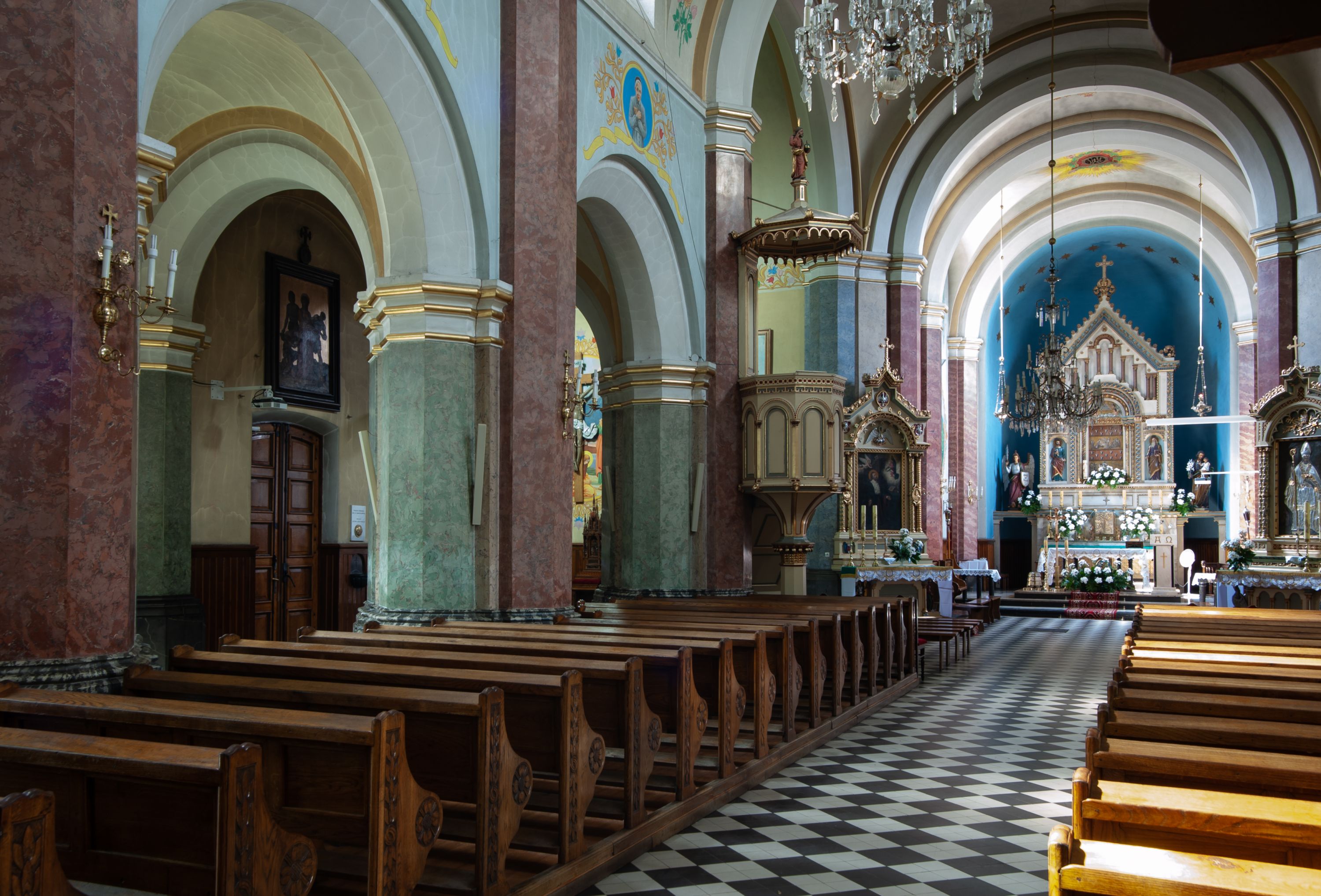 In 1883, the Brotherhood of the Holy Rosary - serving at the parish - funded the altar of St. Isidore located in the western part of the transept. It was sculpted by the Cracovian artist - Romuald Łapczyński - together with the statue of Our Lady of the Rosary. The painting of the patron - St. Isidore the Laborer (currently not raised) was painted by Edward Lepszy. Four confessionals were purchased, including two covered ones, and pews to the chancel, made of wood donated by father Bański. Also pine pews were purchased of parishioners' contributions. In 1886 marble banisters were installed in the chancel. One year later, a high altar, designed by Tadeusz Stryjeński was built behind them. In 1887, the painting of the Most Sacred Heart of Jesus was purchased and the pedestal was lined with bricks around the church for the amount of 900 zlotys. On 8 September 1887, the painting of the Virgin Mary Lisiecka was solemnly put into the church after it had been restored and extended by two strips. In addition, the painting of the Christ Crucified, as the second painting for the high altar, as well as the representation of the Most Sacred Heart of Jesus to the altar closing the eastern part of the transept were ordered with Edward Lepszy. The painting of the Most Sacred Heart of Jesus replaced the old one created by a teacher from Piekary. In the year of the consecration of the temple (1888), father Bański purchased a new altar for the painting of St. Nicholas from the old church at his own expense. The image of bishop Mira was also restored. There was a chapel designed for temporary storage of a coffin with a dead body. It was located behind the main altar, from the outside, between two buttresses. There were two large paintings inside this chapel, painted on wood. There was Goliath on the one side and David with an arch and harp on the other side. In 1894, Franciszek Mitzke completed the interior polychrome. A wooden bell tower with three bells that were taken in 1915 - during World War I - was situated on the southern side, nearby the church. In 1928-1929, a company owned by Zajdzikowski made stained glass windows - these in the main nave were symbolic in nature and those in the side naves included the images of saints. In 1930, four more stained glass windows were designed by a painter Gloger and created by the company owned by S. G. Żeleński from Cracow. In the following year, the external elevation of the church was repaired. In 1936, a new organ was purchased in the Warsaw company A. Homan St. Jezierski. In 1945, the roof was repaired, as well as the stained glass windows and ridge turret in the subsequent year. In 1947, the church was electrified, in 1953 the central heating and sound system were installed, and a new polychrome was made shortly afterwards. In 1961-1962, the Way of the Cross was restored and pews were purchased. Two years later, the pillars were covered and the chancel's polychrome was made, placing the scenes related to the life of the patron saints - St. Nicholas and St. John Cantius. In 1977, a new postconciliar altar was made. In 1986, the interior was decorated with a new polychrome.