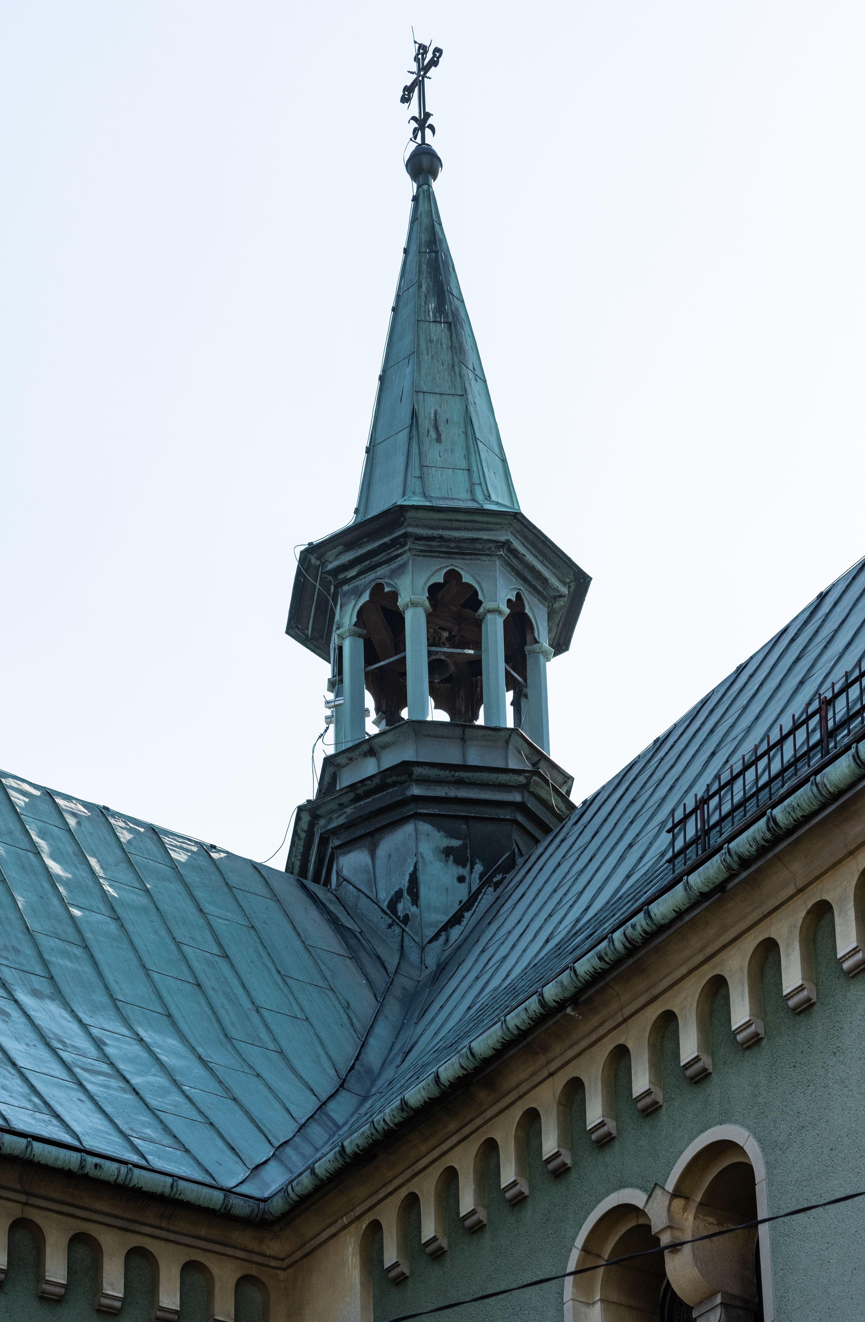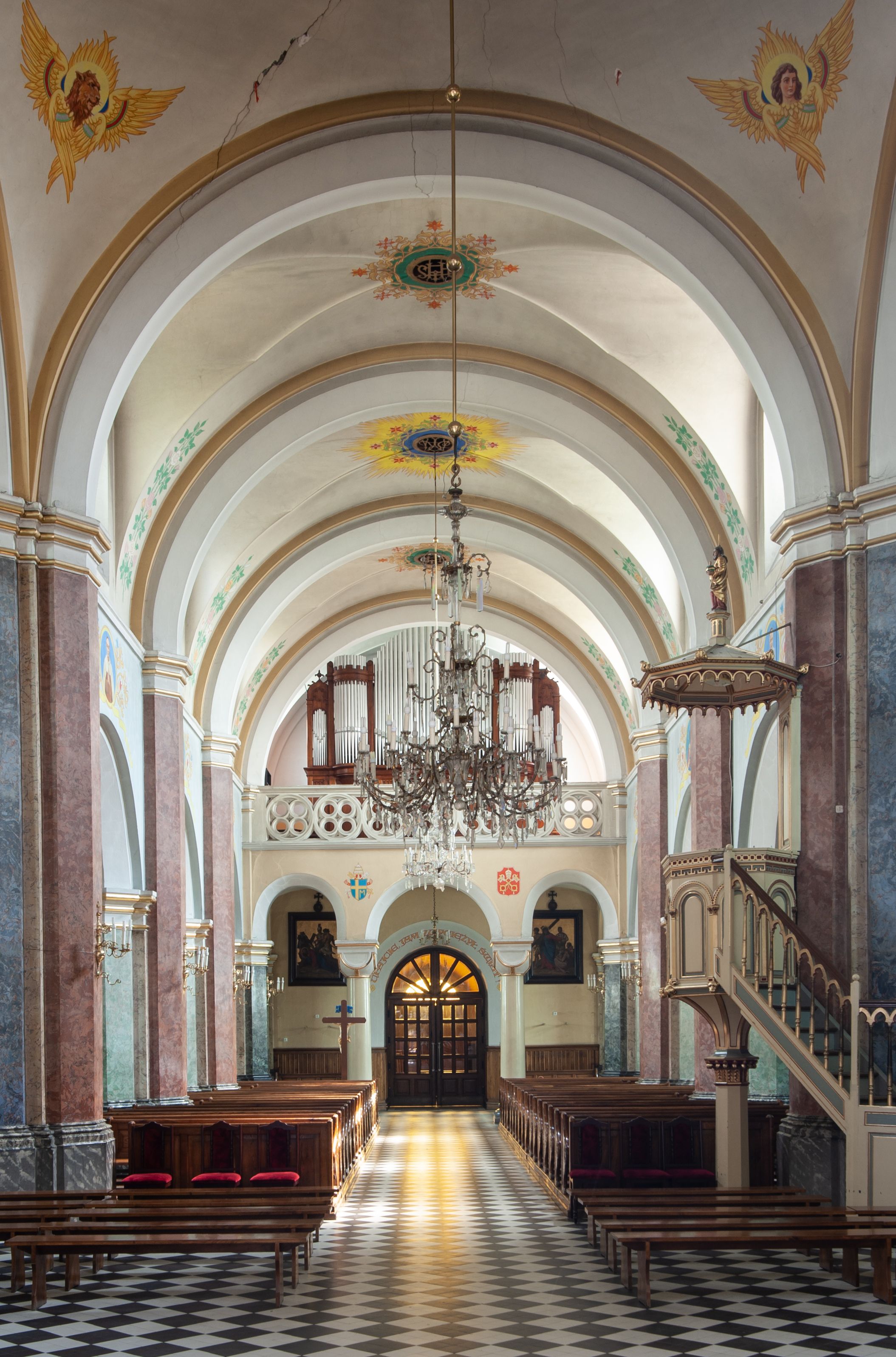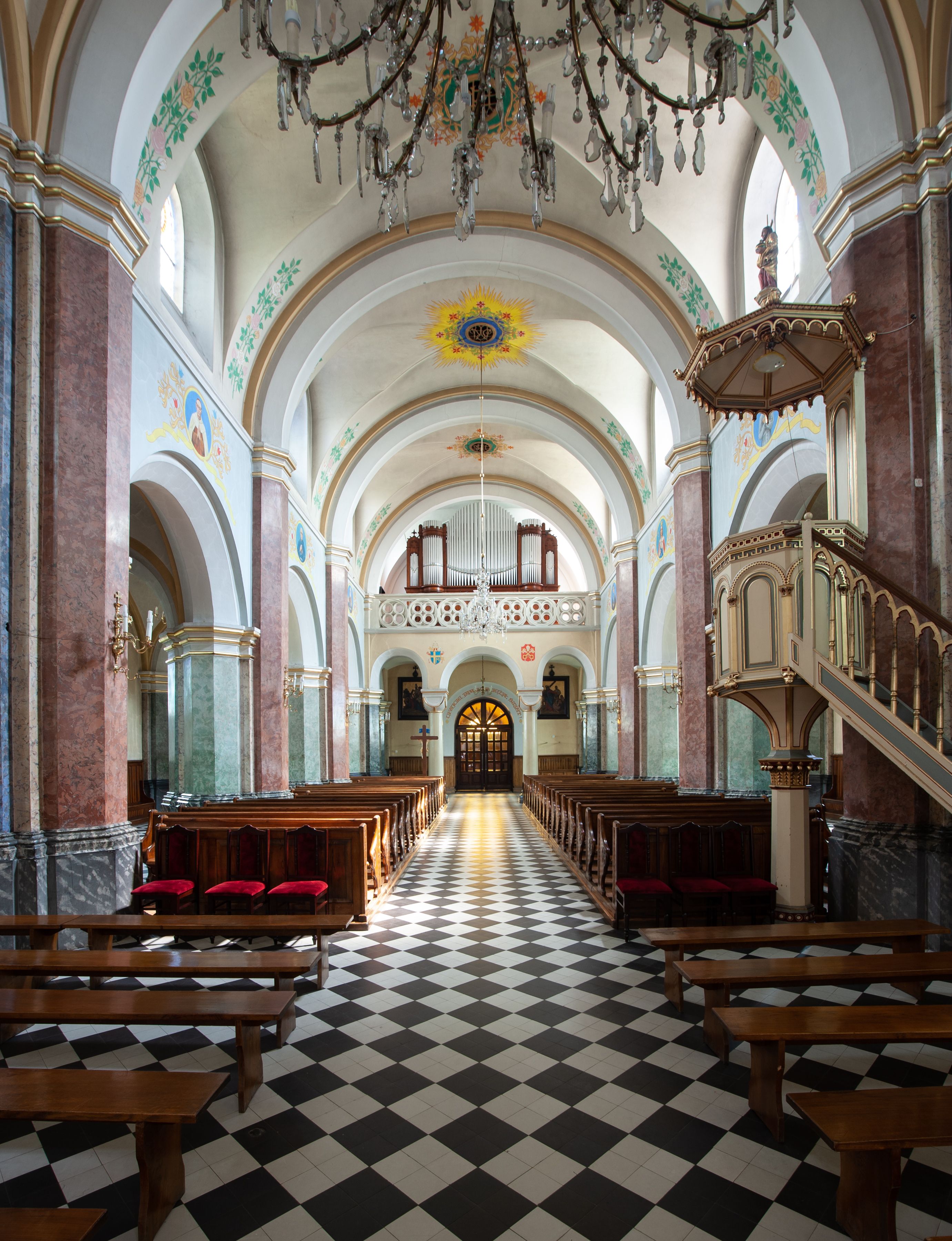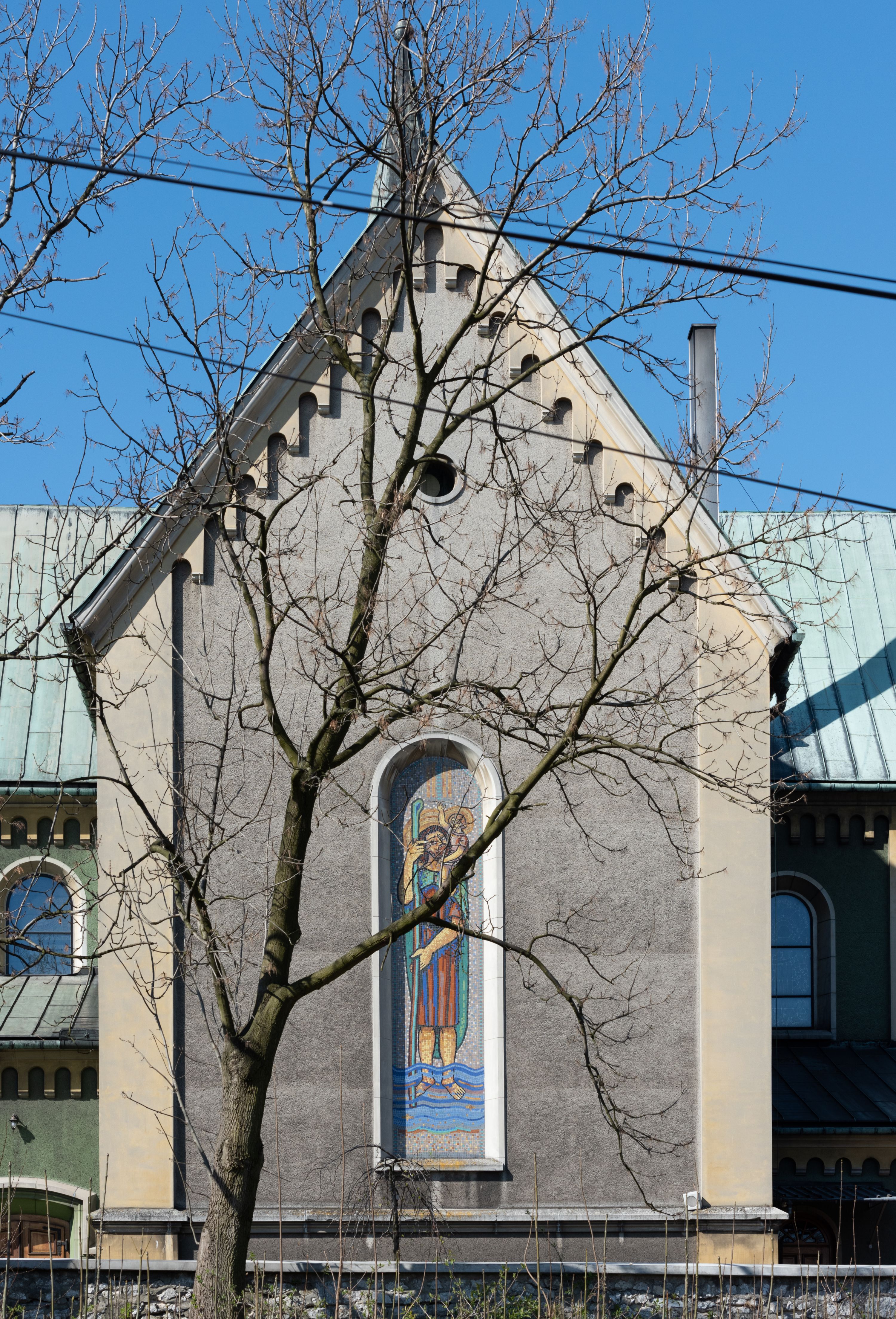 In 1883, the Brotherhood of the Holy Rosary - serving at the parish - funded the altar of St. Isidore located in the western part of the transept. It was sculpted by the Cracovian artist - Romuald Łapczyński - together with the statue of Our Lady of the Rosary. The painting of the patron - St. Isidore the Laborer (currently not raised) was painted by Edward Lepszy. Four confessionals were purchased, including two covered ones, and pews to the chancel, made of wood donated by father Bański. Also pine pews were purchased of parishioners' contributions. In 1886 marble banisters were installed in the chancel. One year later, a high altar, designed by Tadeusz Stryjeński was built behind them. In 1887, the painting of the Most Sacred Heart of Jesus was purchased and the pedestal was lined with bricks around the church for the amount of 900 zlotys. On 8 September 1887, the painting of the Virgin Mary Lisiecka was solemnly put into the church after it had been restored and extended by two strips. In addition, the painting of the Christ Crucified, as the second painting for the high altar, as well as the representation of the Most Sacred Heart of Jesus to the altar closing the eastern part of the transept were ordered with Edward Lepszy. The painting of the Most Sacred Heart of Jesus replaced the old one created by a teacher from Piekary. In the year of the consecration of the temple (1888), father Bański purchased a new altar for the painting of St. Nicholas from the old church at his own expense. The image of bishop Mira was also restored. There was a chapel designed for temporary storage of a coffin with a dead body. It was located behind the main altar, from the outside, between two buttresses. There were two large paintings inside this chapel, painted on wood. There was Goliath on the one side and David with an arch and harp on the other side. In 1894, Franciszek Mitzke completed the interior polychrome. A wooden bell tower with three bells that were taken in 1915 - during World War I - was situated on the southern side, nearby the church. In 1928-1929, a company owned by Zajdzikowski made stained glass windows - these in the main nave were symbolic in nature and those in the side naves included the images of saints. In 1930, four more stained glass windows were designed by a painter Gloger and created by the company owned by S. G. Żeleński from Cracow. In the following year, the external elevation of the church was repaired. In 1936, a new organ was purchased in the Warsaw company A. Homan St. Jezierski. In 1945, the roof was repaired, as well as the stained glass windows and ridge turret in the subsequent year. In 1947, the church was electrified, in 1953 the central heating and sound system were installed, and a new polychrome was made shortly afterwards. In 1961-1962, the Way of the Cross was restored and pews were purchased. Two years later, the pillars were covered and the chancel's polychrome was made, placing the scenes related to the life of the patron saints - St. Nicholas and St. John Cantius. In 1977, a new postconciliar altar was made. In 1986, the interior was decorated with a new polychrome.