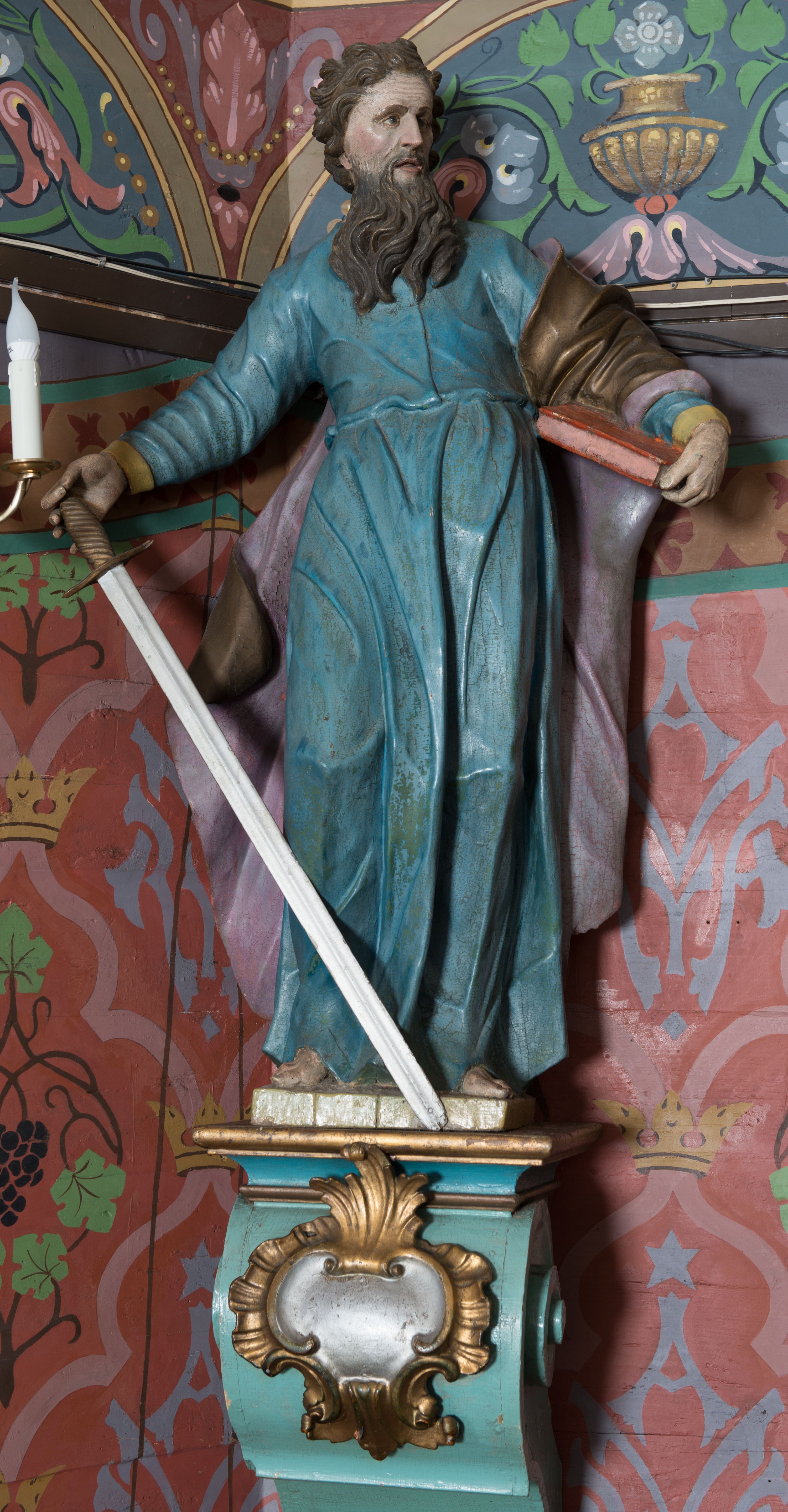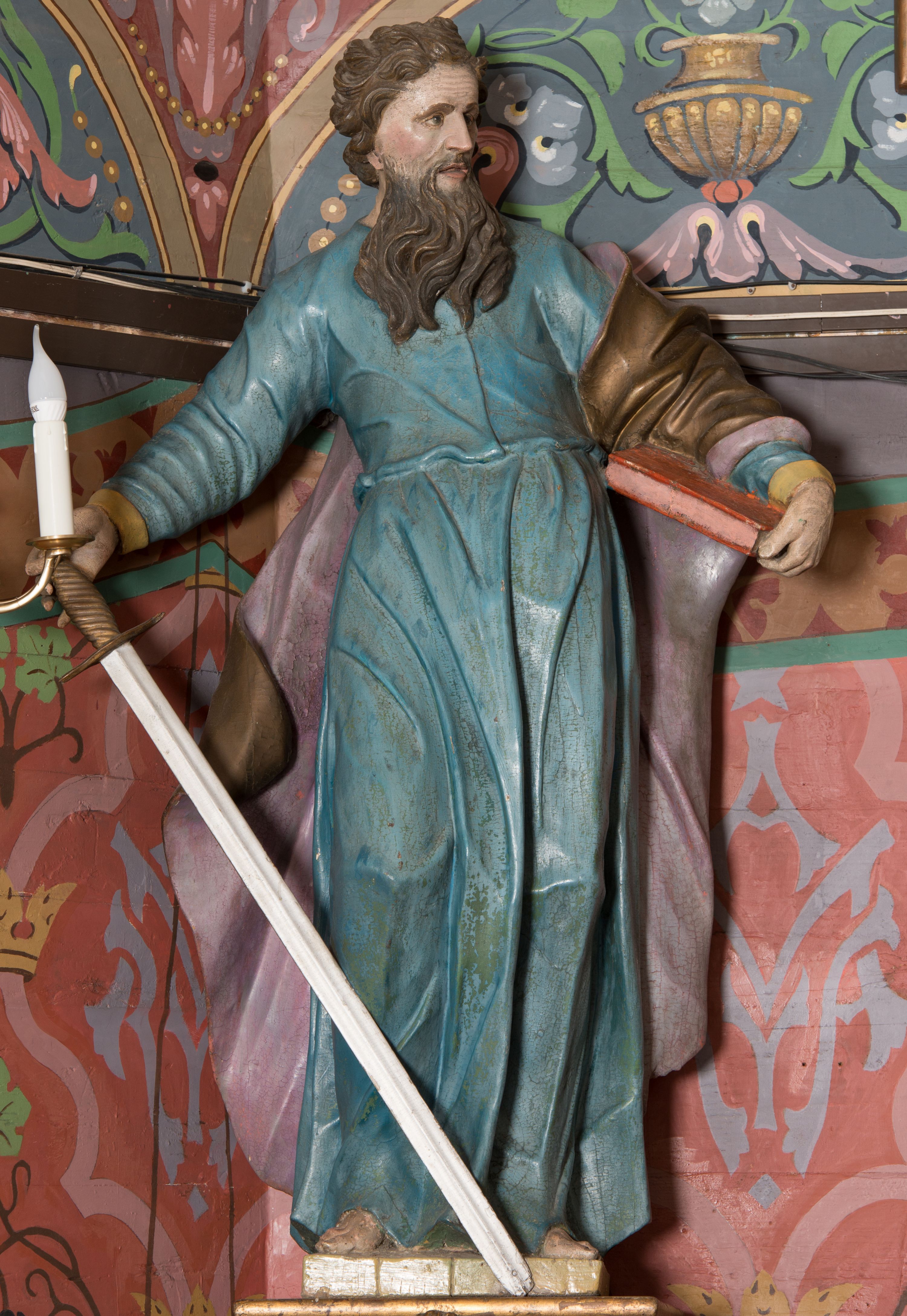 St. Paul statue was created as one of four sculptures intended for the high altar, which was made for the new church around 1780 by the Kornecki brothers - Antoni and Ignacy. Saint Paul was originally called Saul and had been a zealous persecutor of Christians until his conversion. He suffered a martyr's death by decapitation with a sword, which is why it is his attribute.