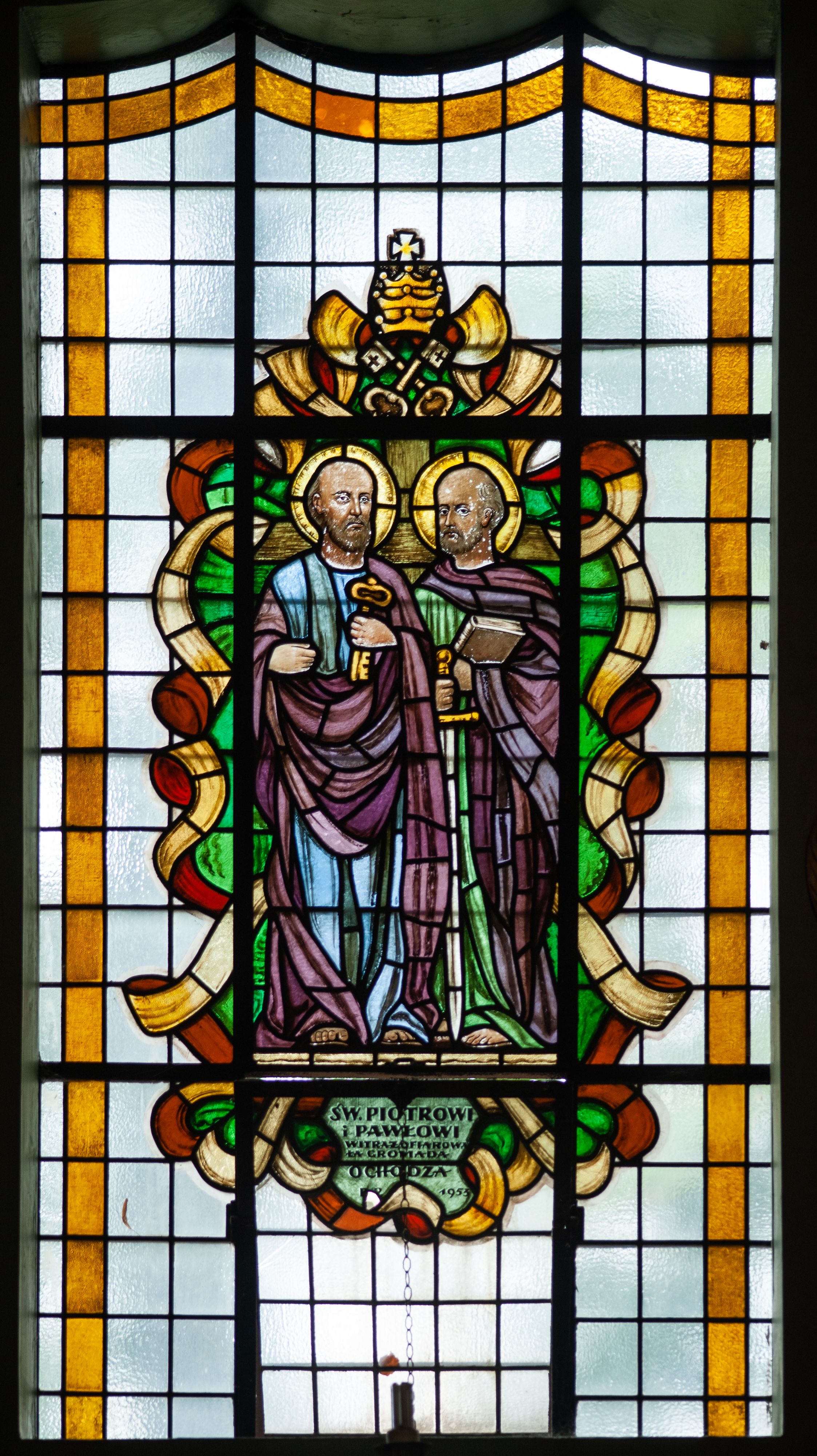 Stained glass with the representation of Saint Peter and Saint Paul was created in 1953 in a nationalised workshop formerly known as "S.G. Żeleński" in Cracow. It was funded by Gromada Ochodza.