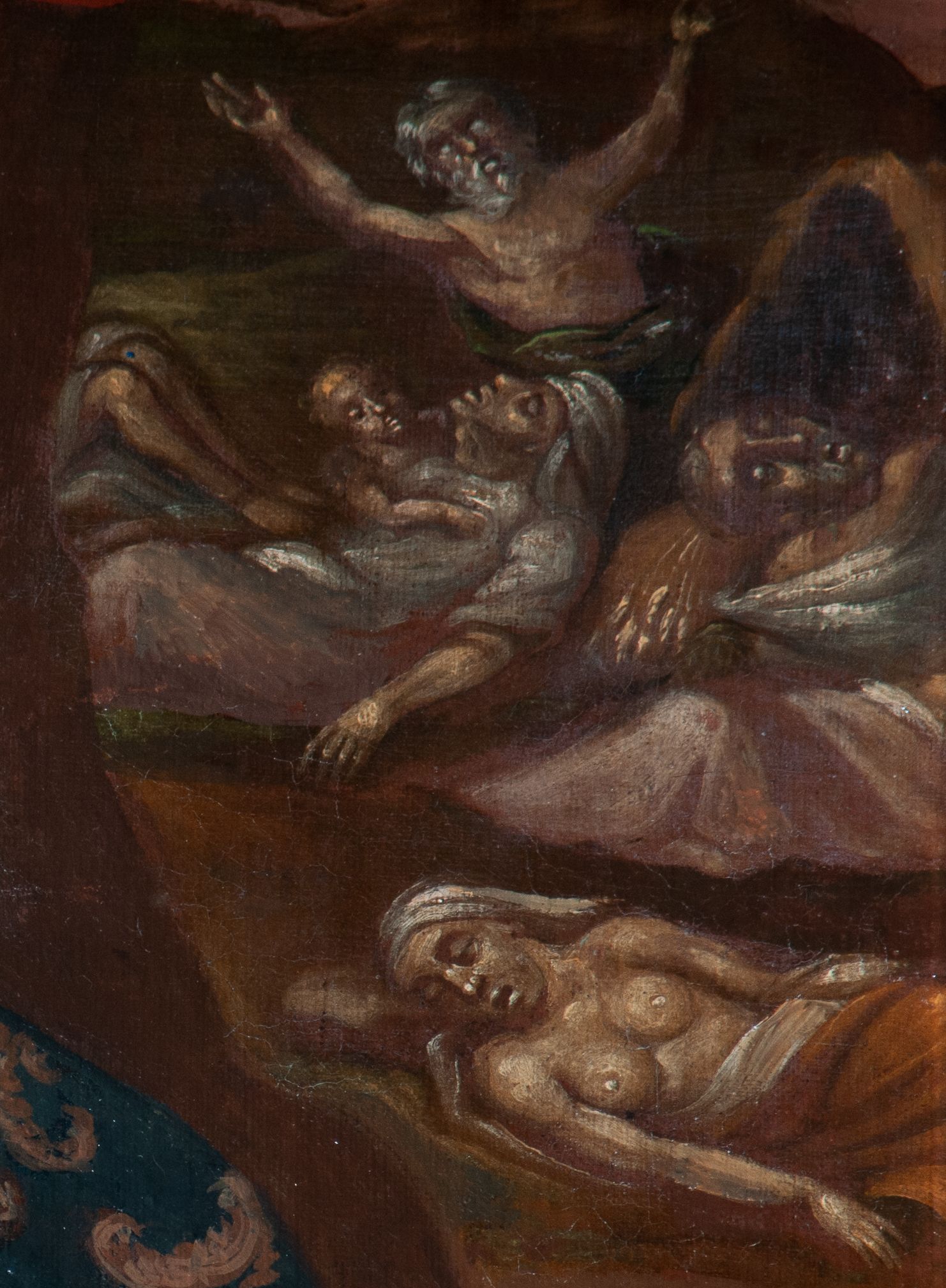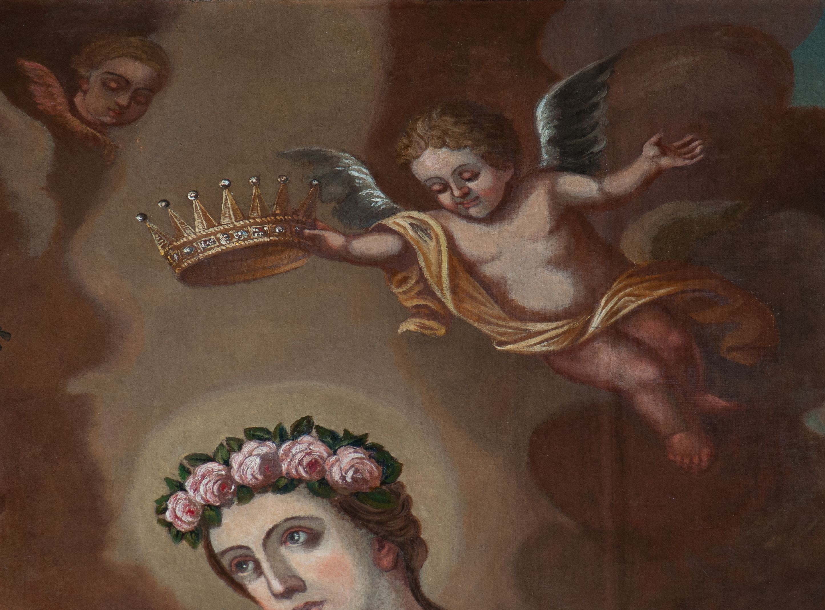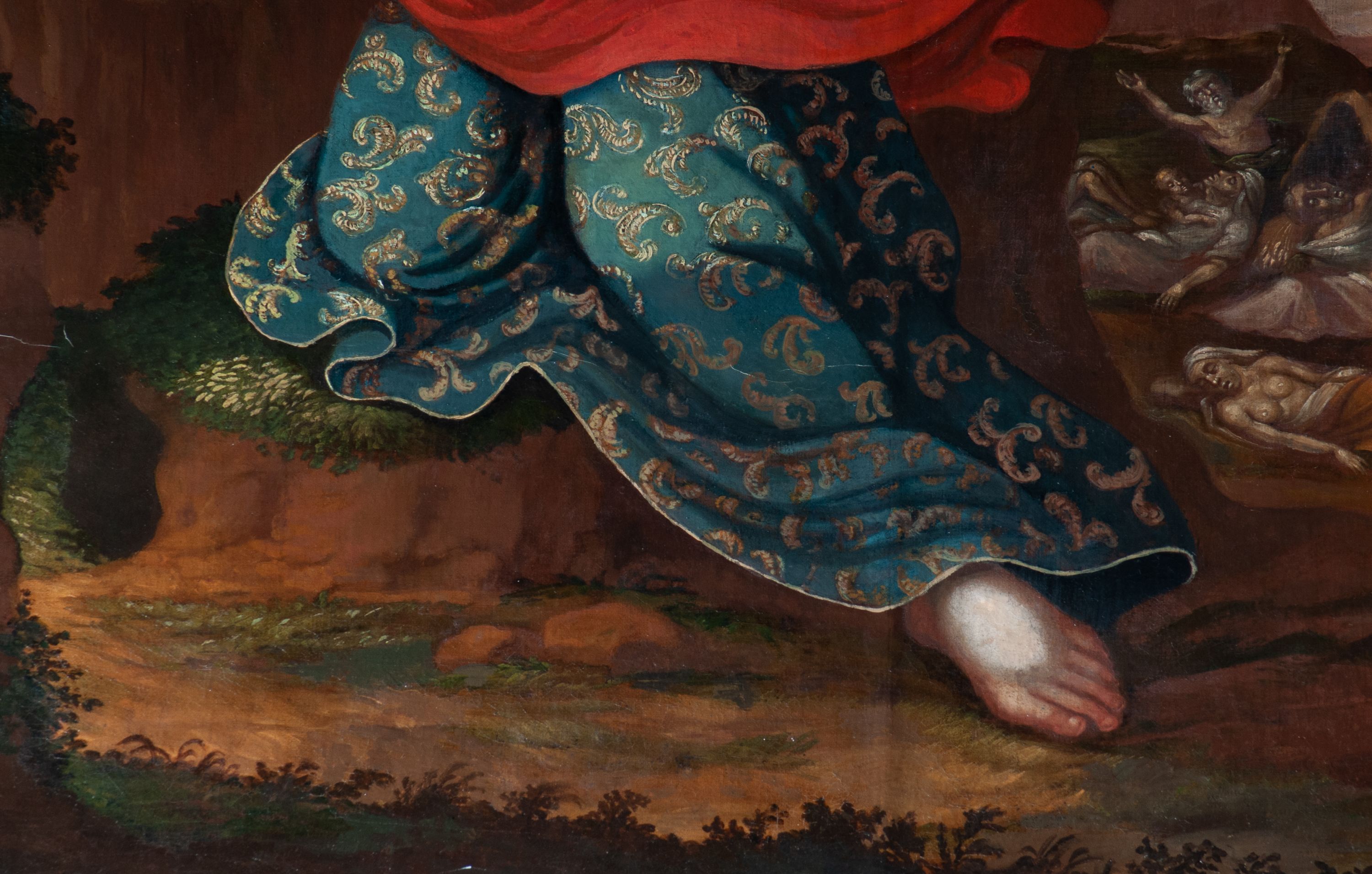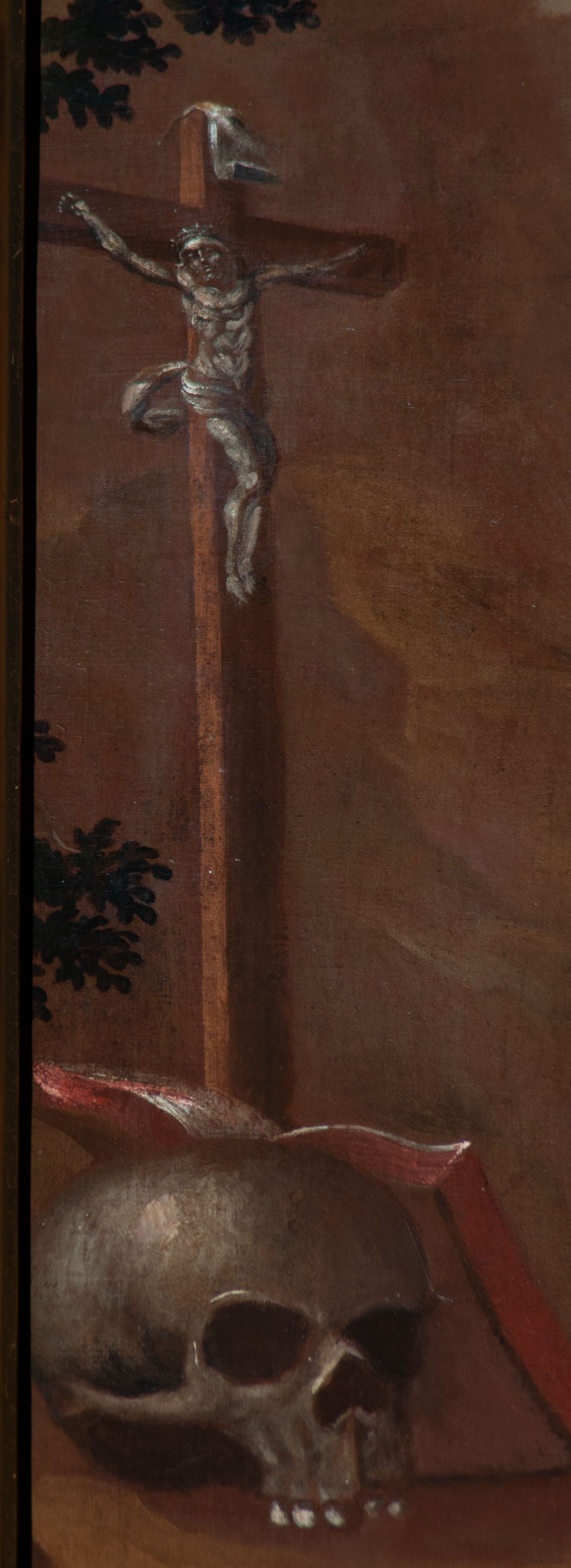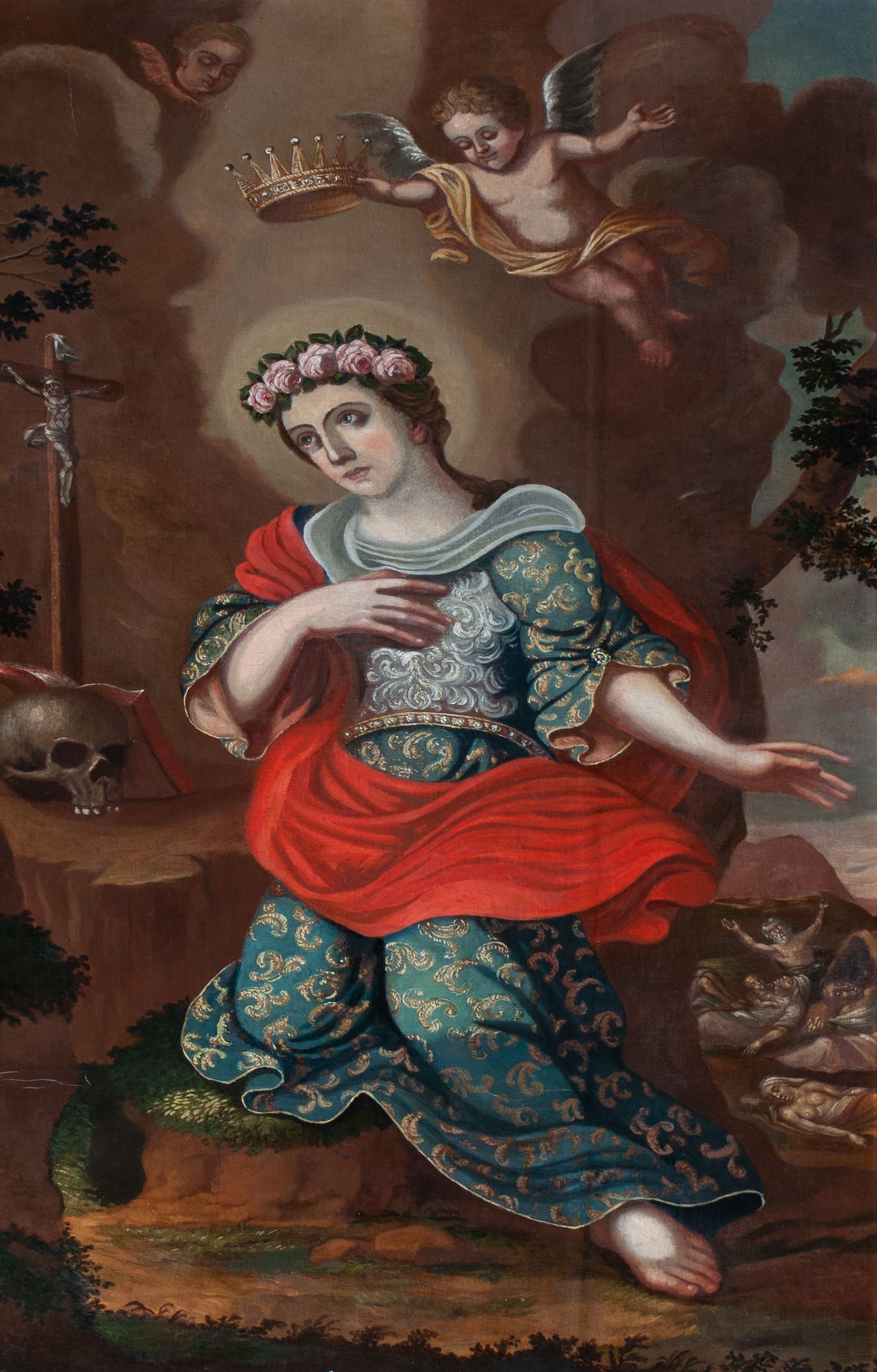 The 18th-century painting of an unknown author presents Saint Rosalia in prayer in a mountain hermitage. In the background one can see people dying of plague, which she is the patron of. The painting exhibits the characteristics of 18th century provincial painting inspired by earlier periods.