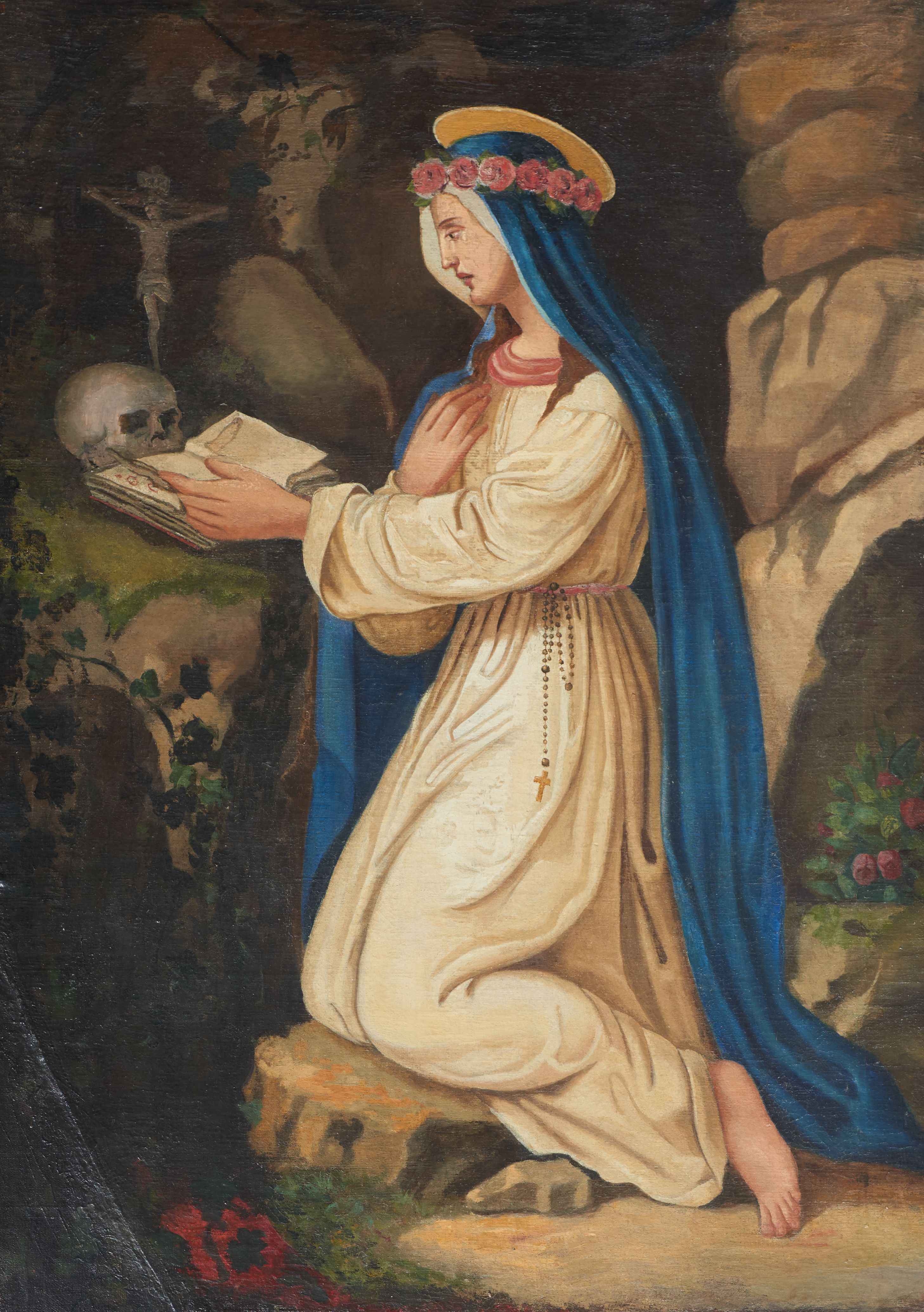 The painting "St. Rosalia" was painted in the 19th century by an unidentified painter. Saint Rosalia (1130-1165 or 1170) lived a penitential life in a cave in Sicily. During a plague in Palermo in 1624, she appeared to a woman and revealed her burial place. After the relics were moved to the city, the epidemic ended. Since then, the saint is the patron of infectious diseases.