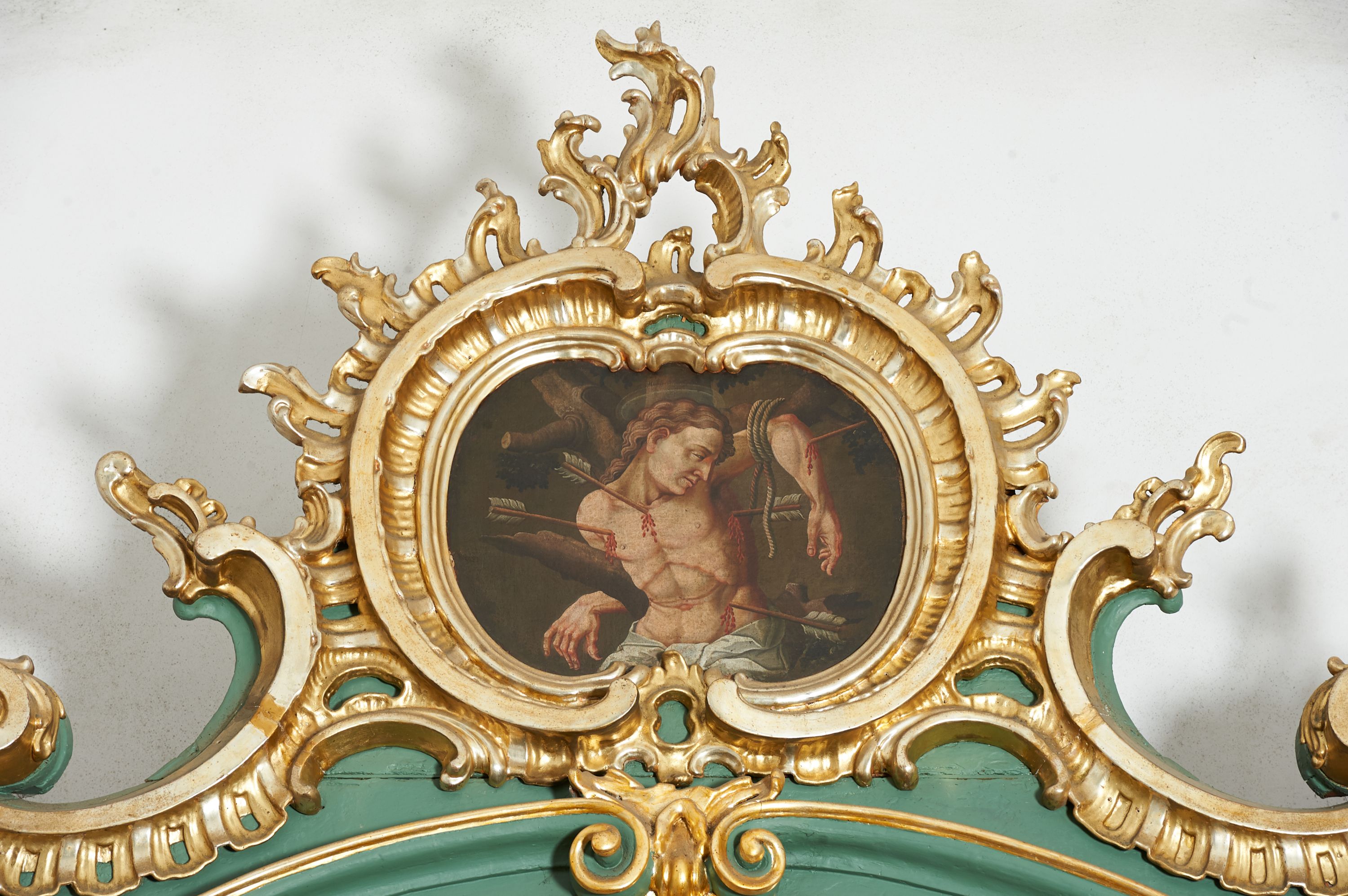 The painting was created for finial of the altar under the invocation of St. Onuphrius in the third quarter of the 18th century. Saint Sebastian was a Roman martyr and suffered death tied to a tree and pierced by arrows. In iconography, he is portrayed as a young man with an ideal body, girded with a fabric in the hip area only, tied to a pole or a tree, pierced by arrows.