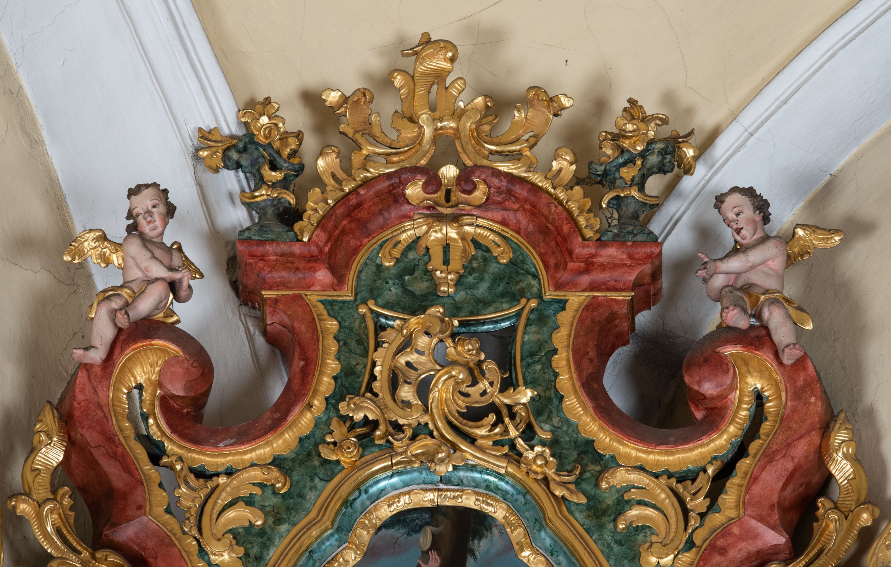The painting depicting Saint Sebastian, placed in altar finial of the southern altar, was created around 1777. Undoubtedly, the ultimate attribution of the work, which is attributed to both Szymon Kawalski and Imrich Jagušič, requires further research. Saint Sebastian is a Roman martyr, who died during the reign of Emperor Diocletian at the beginning of the 4th century. According to tradition, he was to be tied to a tree trunk and die from wounds inflicted by arrows fired by the archers. He is worshipped as a patron in infectious diseases, patron of shooters, soldiers, hunters and war invalids.