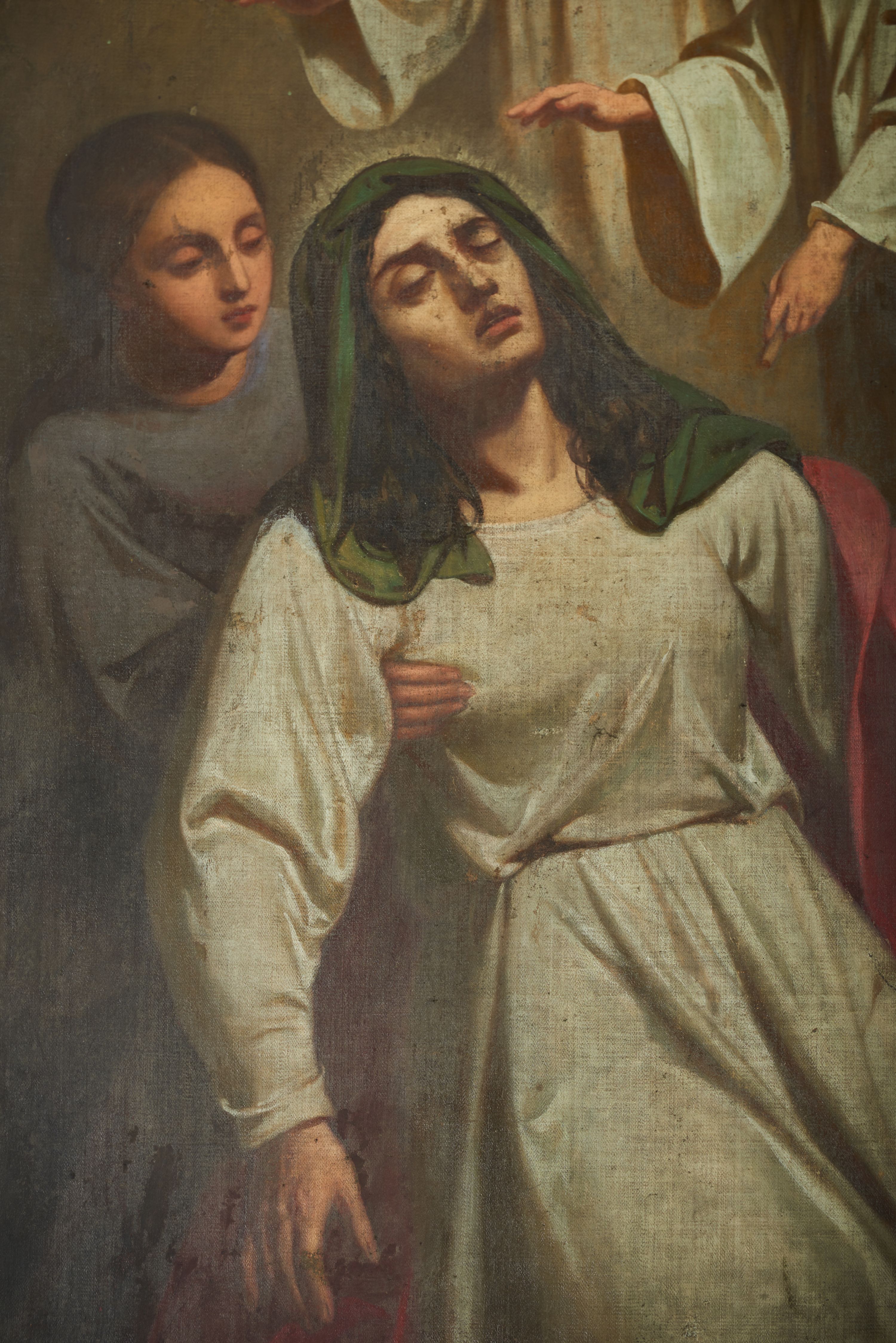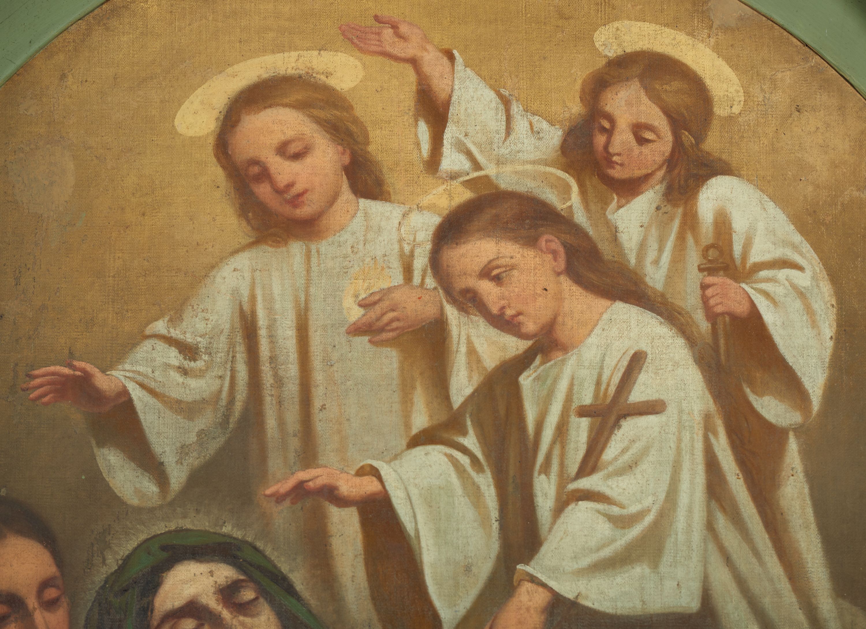The St. Sophia's Death painting was created by a painter from Kraków named Wojciech Eljasz in 1865. The work was placed in the altar under her invocation. St. Sophia was a widow and raised three daughters - Faith, Hope and Love (Pistis, Elpis and Agape). When she refused to make a sacrifice to the pagan goddess, her daughters were tortured and killed before her very eyes, and she was kept alive. Sophia died of grief on her daughters' grave. This is the moment that is captured on Wojciech Eljasz's painting.