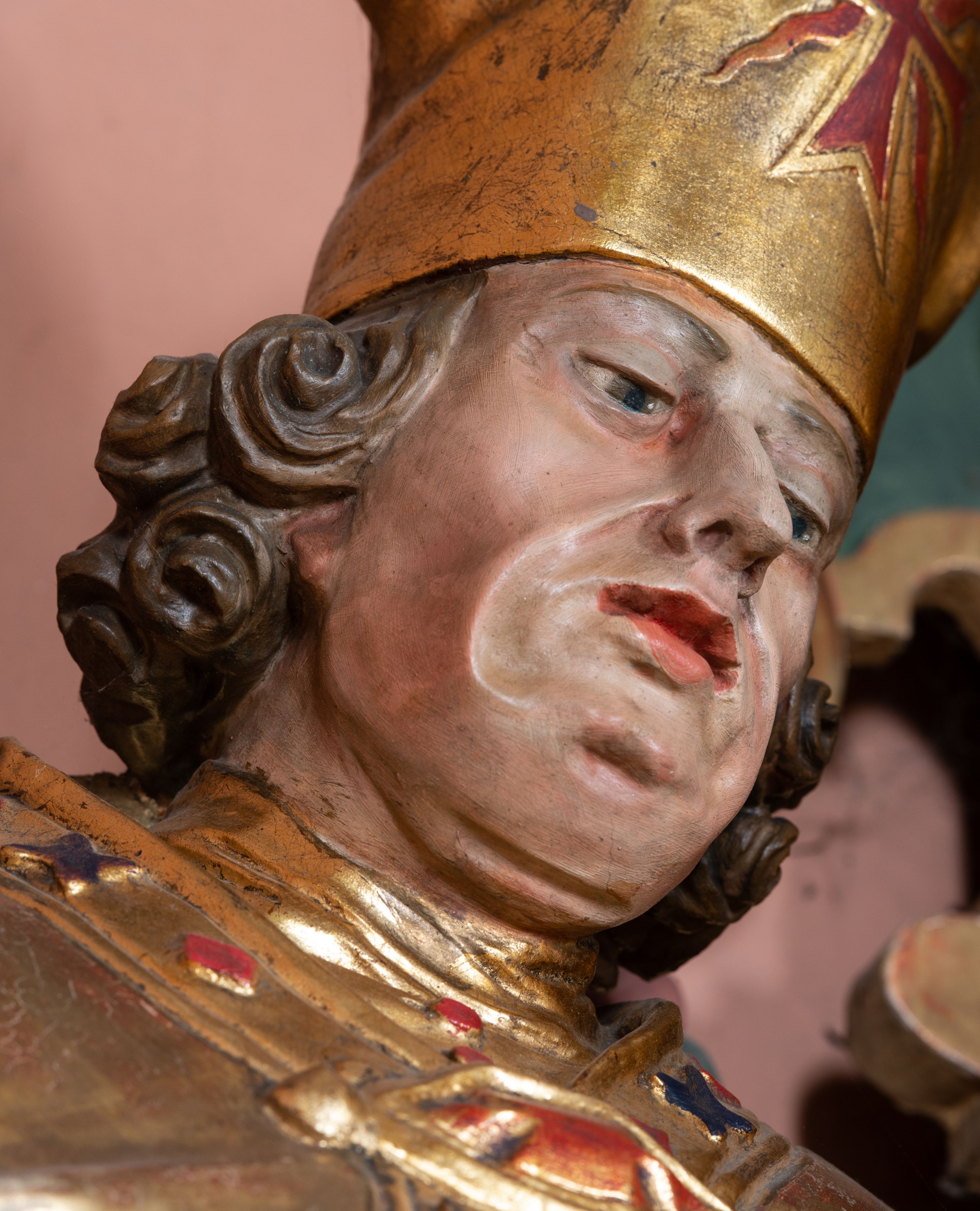 In the church in Przytkowice, St. Stanislaus is shown frontally, with a fragment of the figure of Piotrawin - making possible his identification. The way of showing the face and the saint's pose indicate that its reproduction was created later that the structure of the altar that it is a part of.