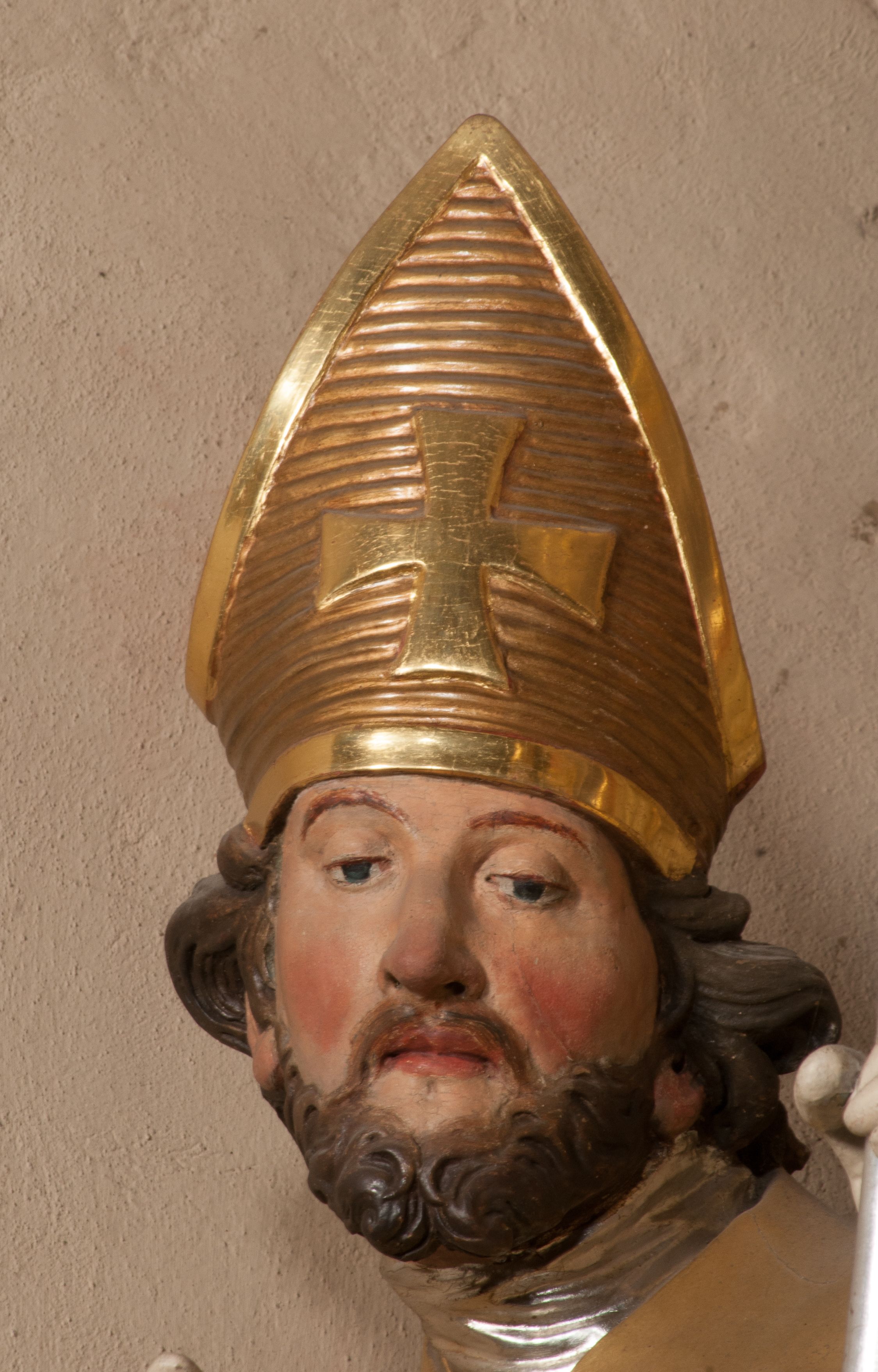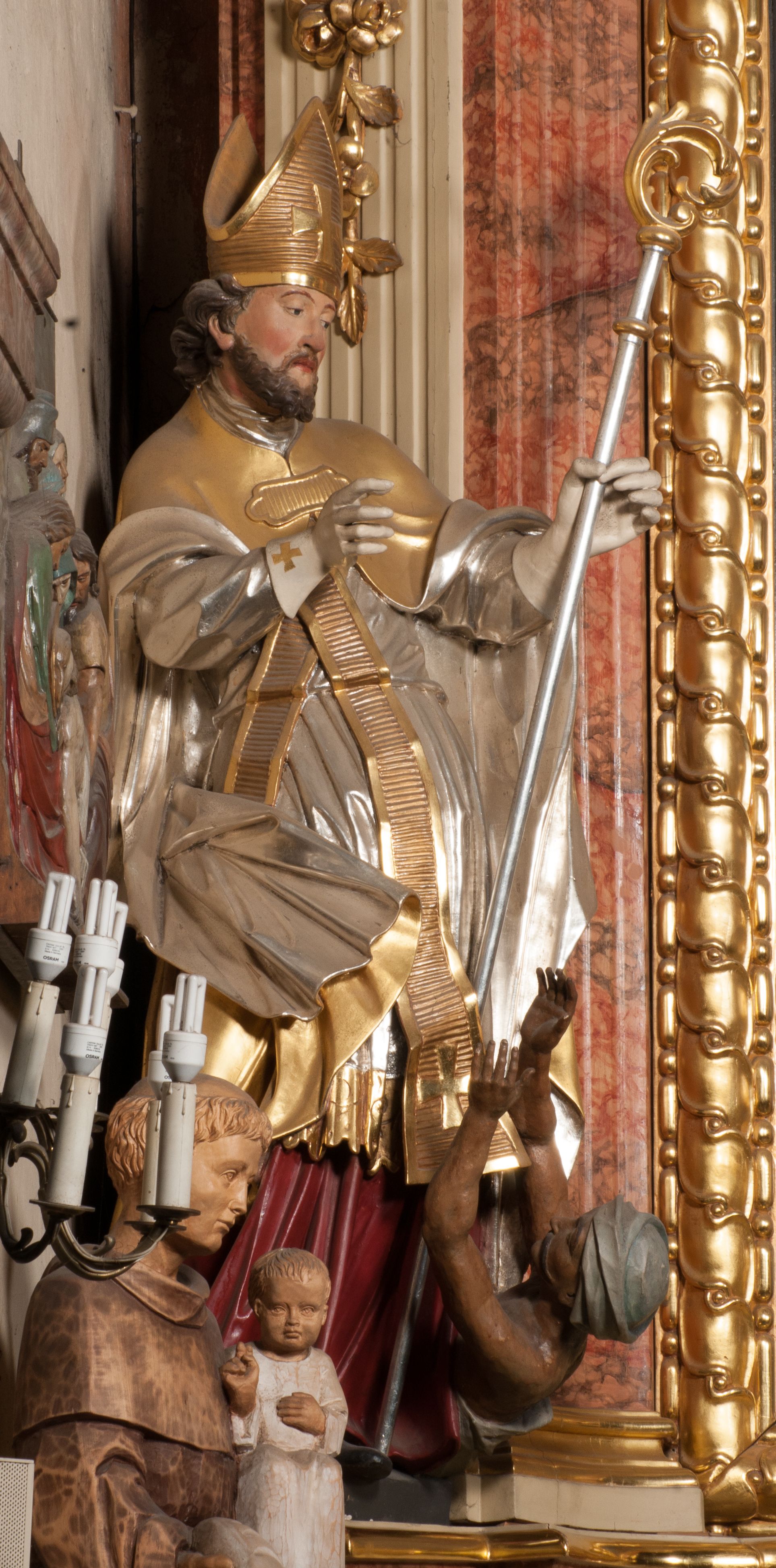 The figures of st. Adalbert and st. Stanislaus were made in the third quarter of the 18th century, presumably by Antoni Gegenbaur. They were re-mounted on the left side altar. Stanislaus of Szczepanów was a Bishop of Cracow, therefore he is portrayed in attire corresponding to his position. Iconography depicting him with a small figure of Piotrovin, illustrates the legend about the acquisition of the Piotrawin village by the saint.