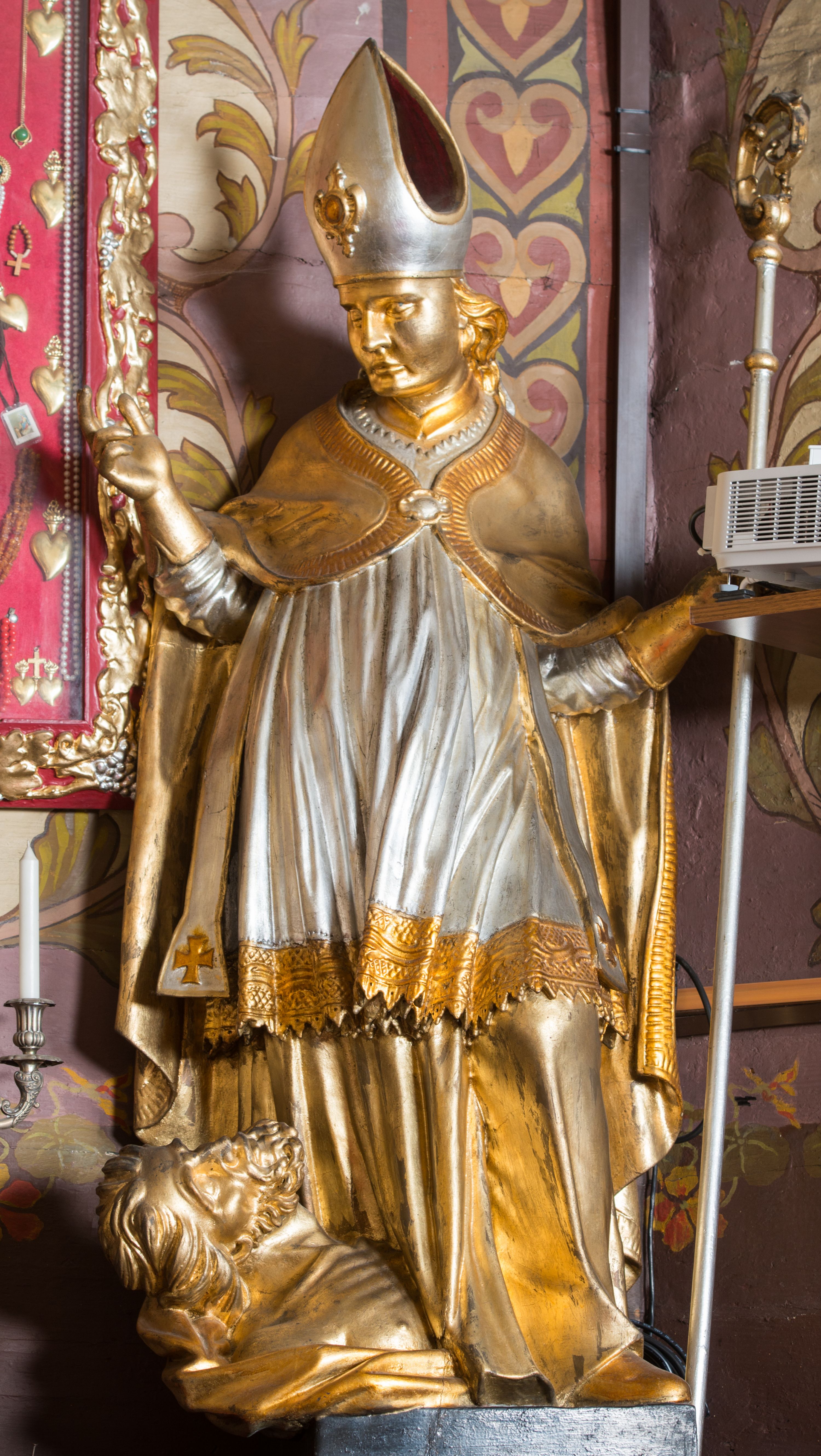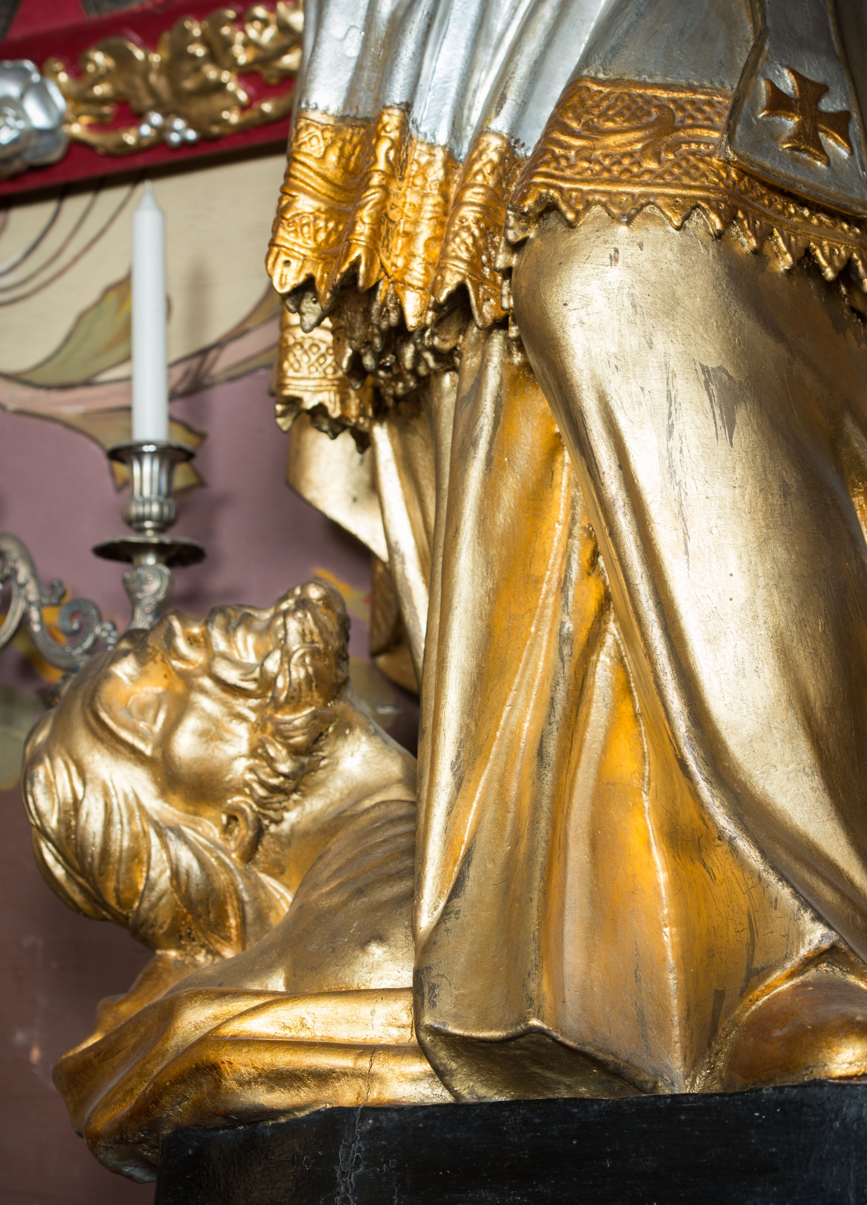 The statue of St. Stanislaus was created together with the rococo furnishings of the church in 1779. It was built by Antoni and Ignacy Kornecki - brothers who cooperated with each other. Stanislaus of Szczepanów was a Bishop of Cracow, therefore he is portrayed in attire corresponding to his position. Iconography depicting him with a small figure of Piotrovin, illustrates the legend about the acquisition of the Piotrawin village by the saint.