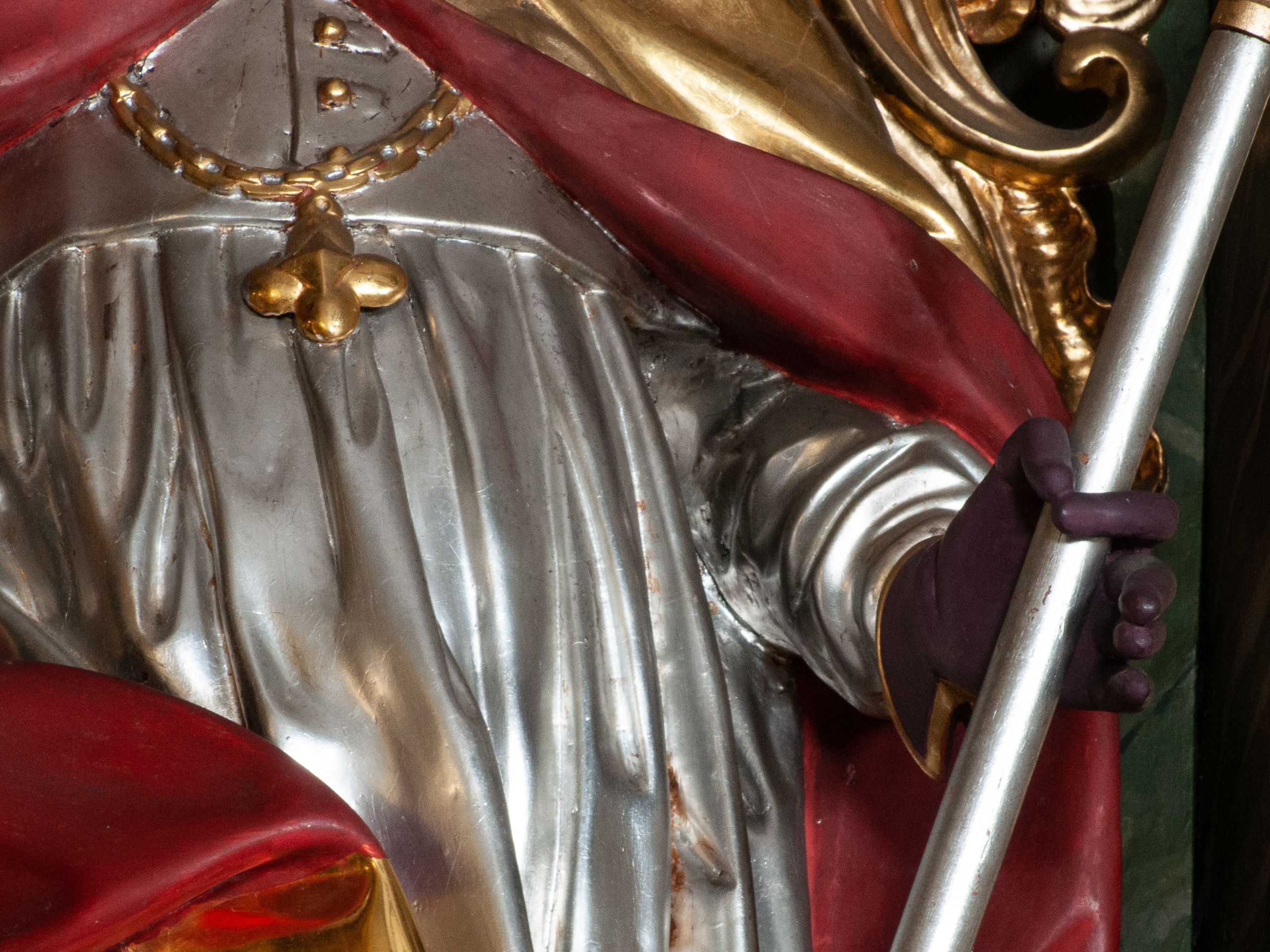 The statue depicting Saint Stanislaus was made in the second half of the 18th century for the altar where it is located. It is an example of Rococo sculpture. The figure of the saint was bent in the shape of the letter "S," and the body is wrapped in finely crinkled folds of the underneath robes contrasting with the sharply fractured cope.